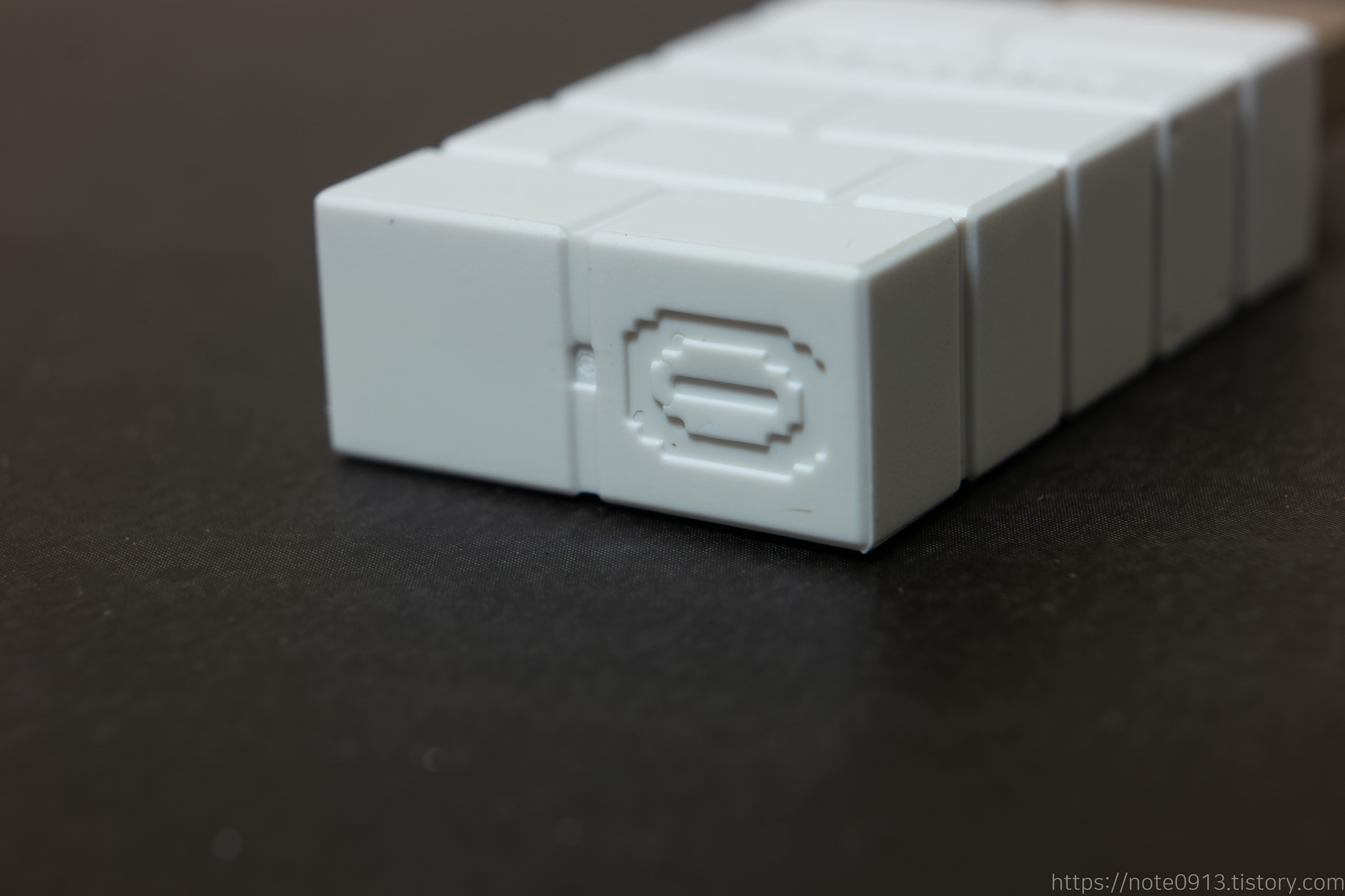 USB 수신기입니다. 벽돌모양의 패턴으로 디자인되어있습니다. 수신기 윗부분에는 코인 모양이 새겨져 있습니다.