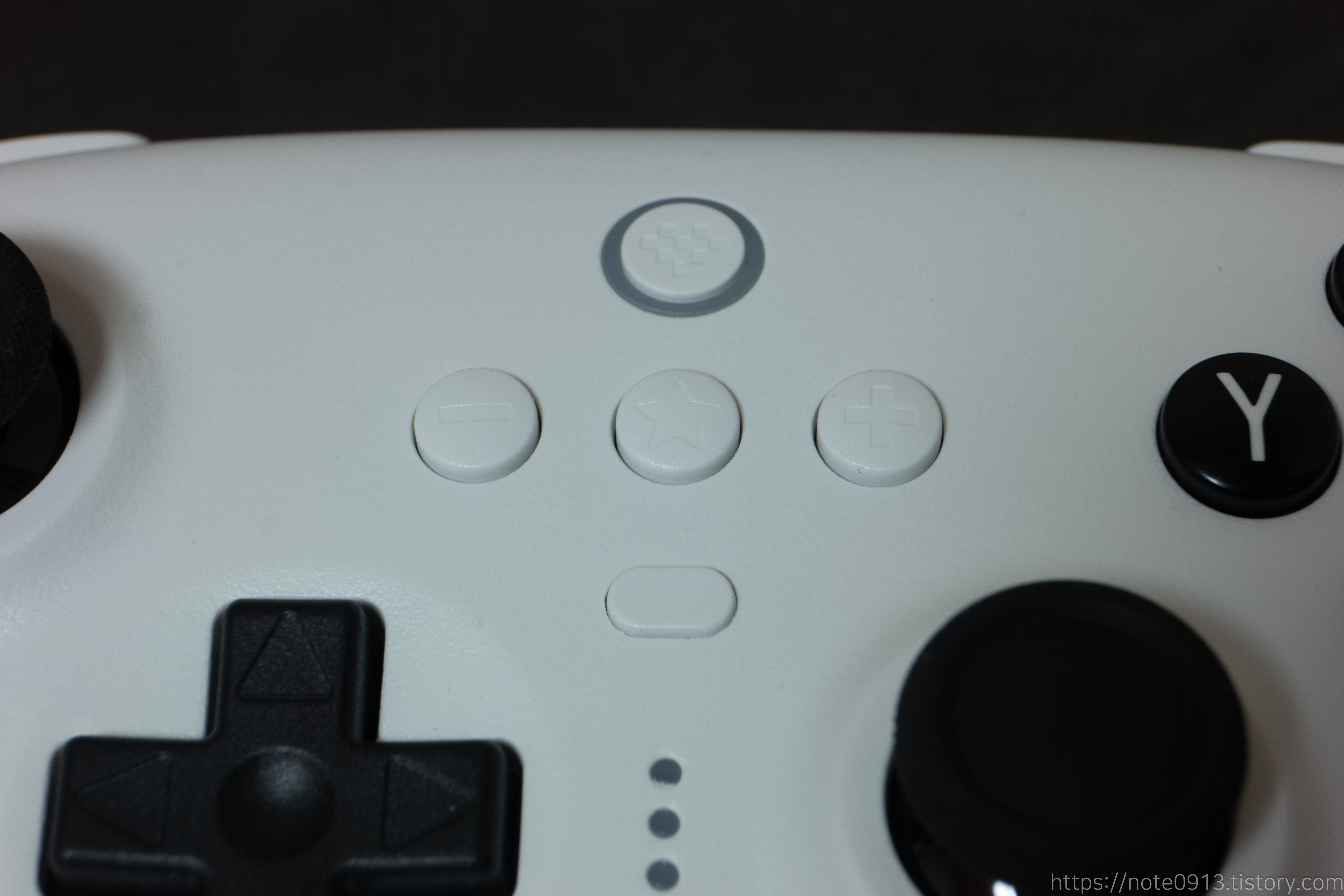 가운데에 있는 버튼도 스위치 형식으로 되어있습니다. -, +, 별모양, 8BitDo 로고 모양 버튼, 타원 버튼이 있습니다.