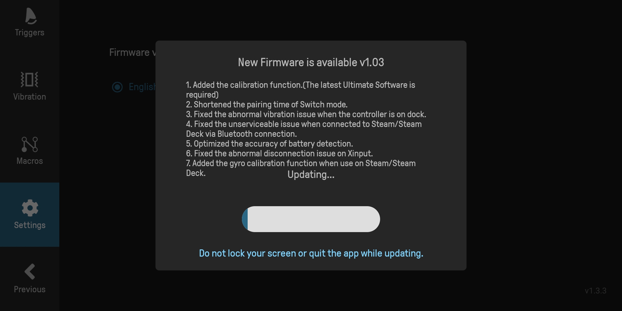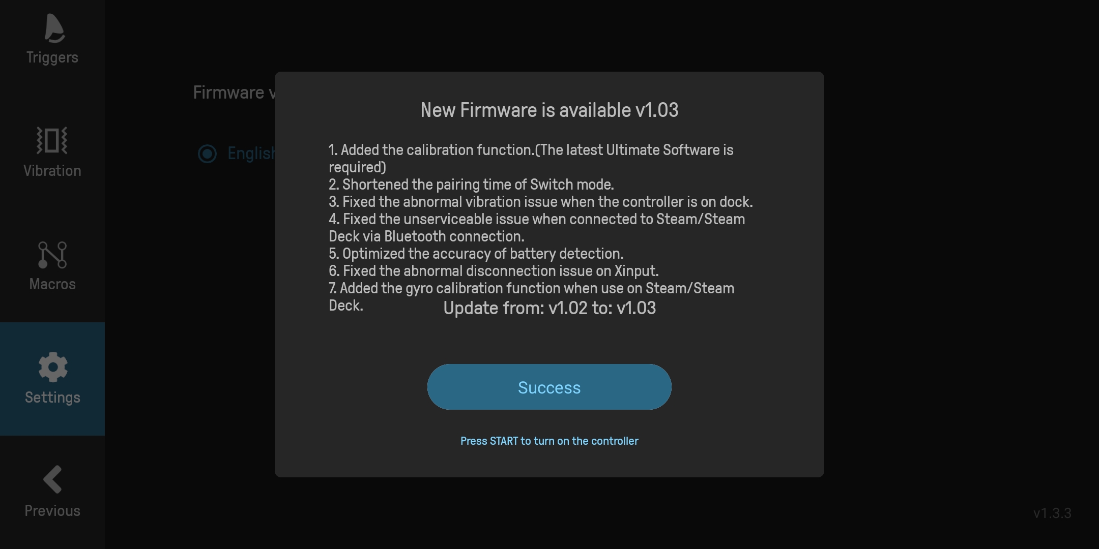 펌웨어 버전을 선택할 수 있고 로그를 보면 업데이트 내역을 볼 수 있습니다. 1.03 패드 펌웨어에는 보정 기능 추가, 페어링 시간 단축, 진동 문제 해결, 배터리 잔량 정확도 개선 등등 이 있네요.
