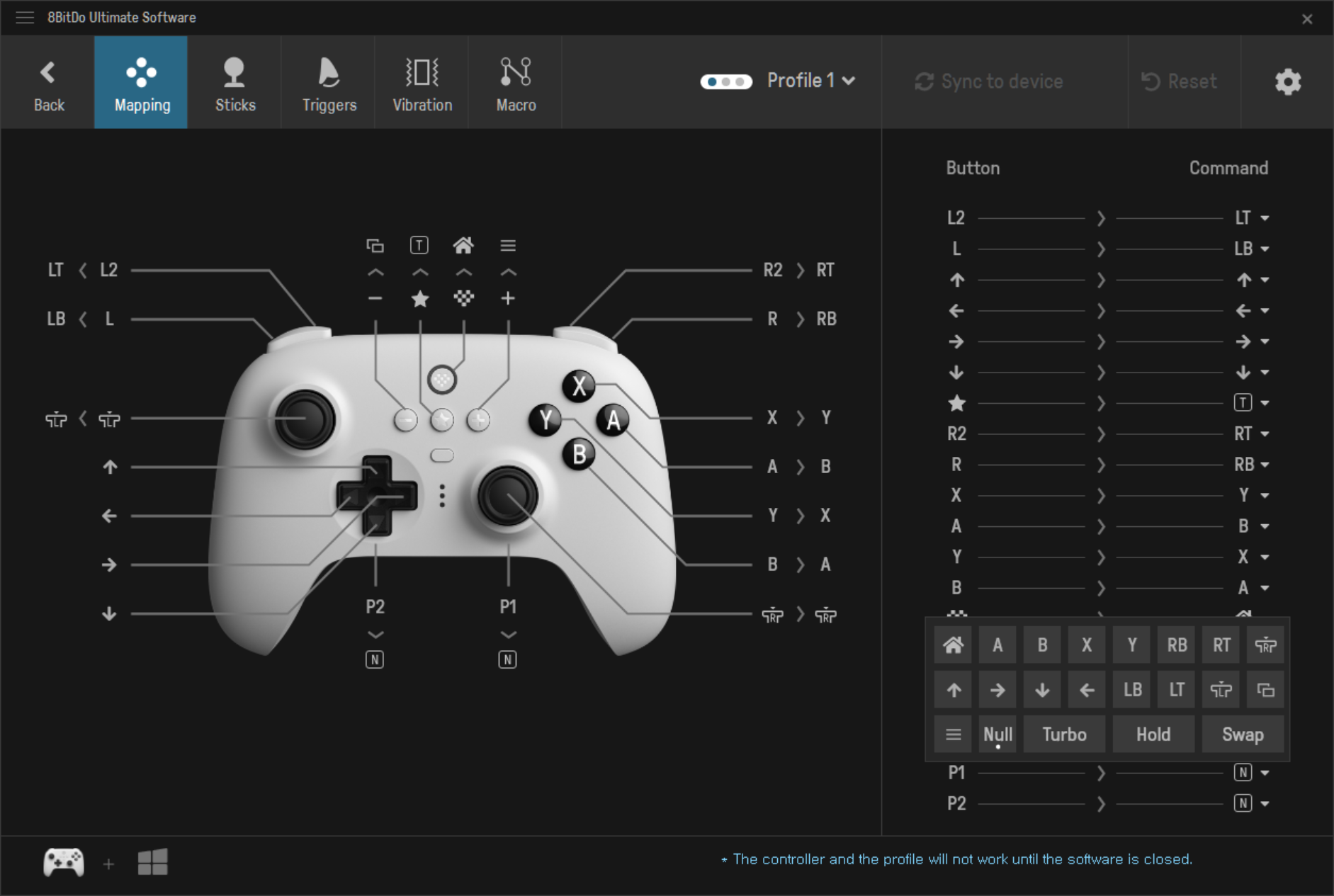 8BitDo 홈페이지에서 SUPPORT 페이지로 가면 각종 소프트웨어와 자료들을 받을 수 있습니다. 펌웨어 업데이트 툴이나 페어링 툴등 다양한 프로그램을 받을 수 있습니다. 이 중에서 Ultimate Software을 다운받아서 실행하면 얼티메이트 블루투스의 키 맵핑이나 매크로, 프로필 설정 등 다양한 설정을 할 수 있습니다.