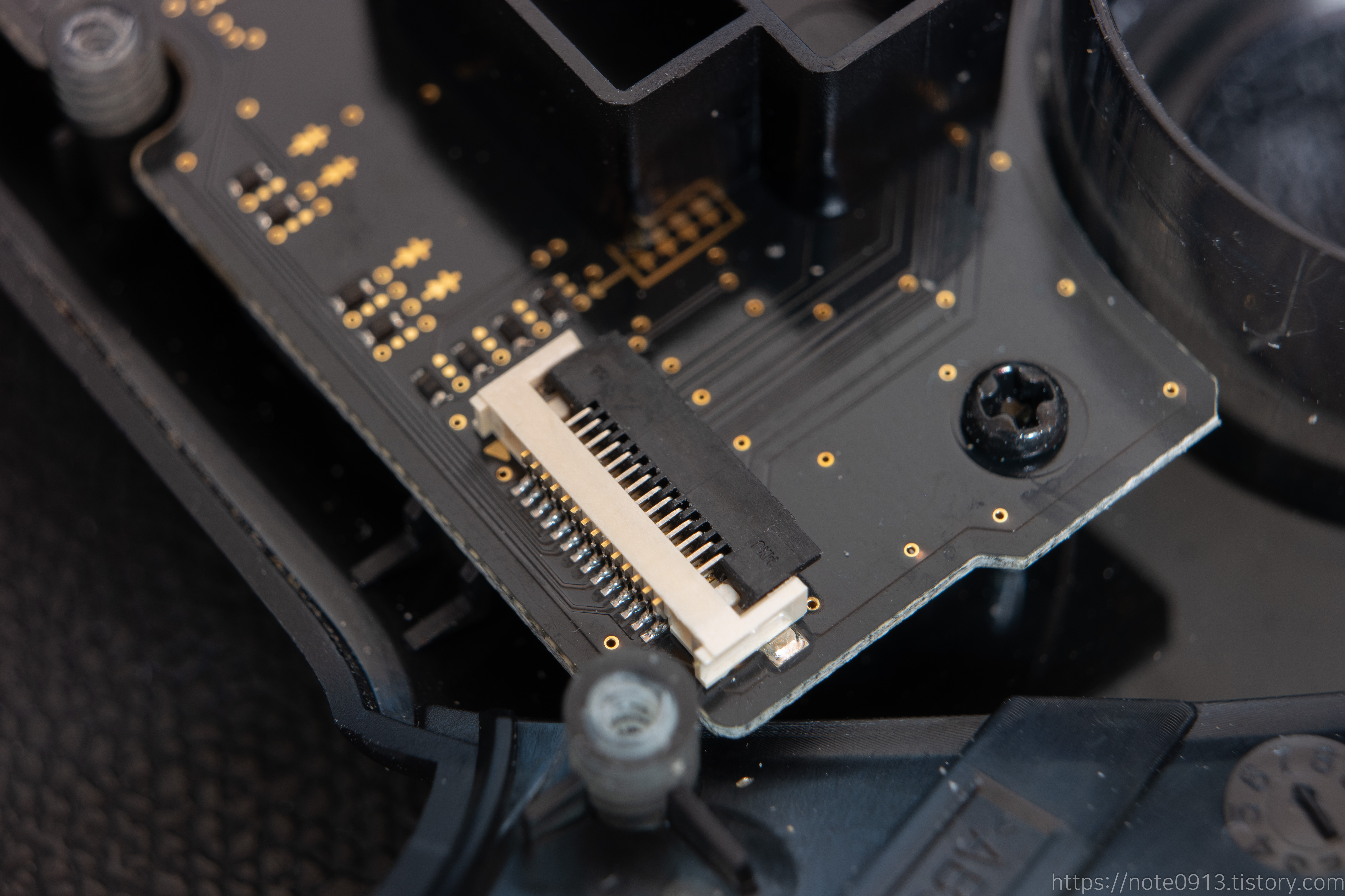 프로 컨트롤러러 분해는 쉬운편입니다. Y 나사가 없고 십자드라이버만 있으면 분해가 가능합니다. 조심해야 할 부분은 위쪽 커버를 열 때, FFC 케이블(위 사진의 얇은 하얀색 케이블)이 연결되어 있으므로 끊어지지않게 조심히 들어올려야 합니다.