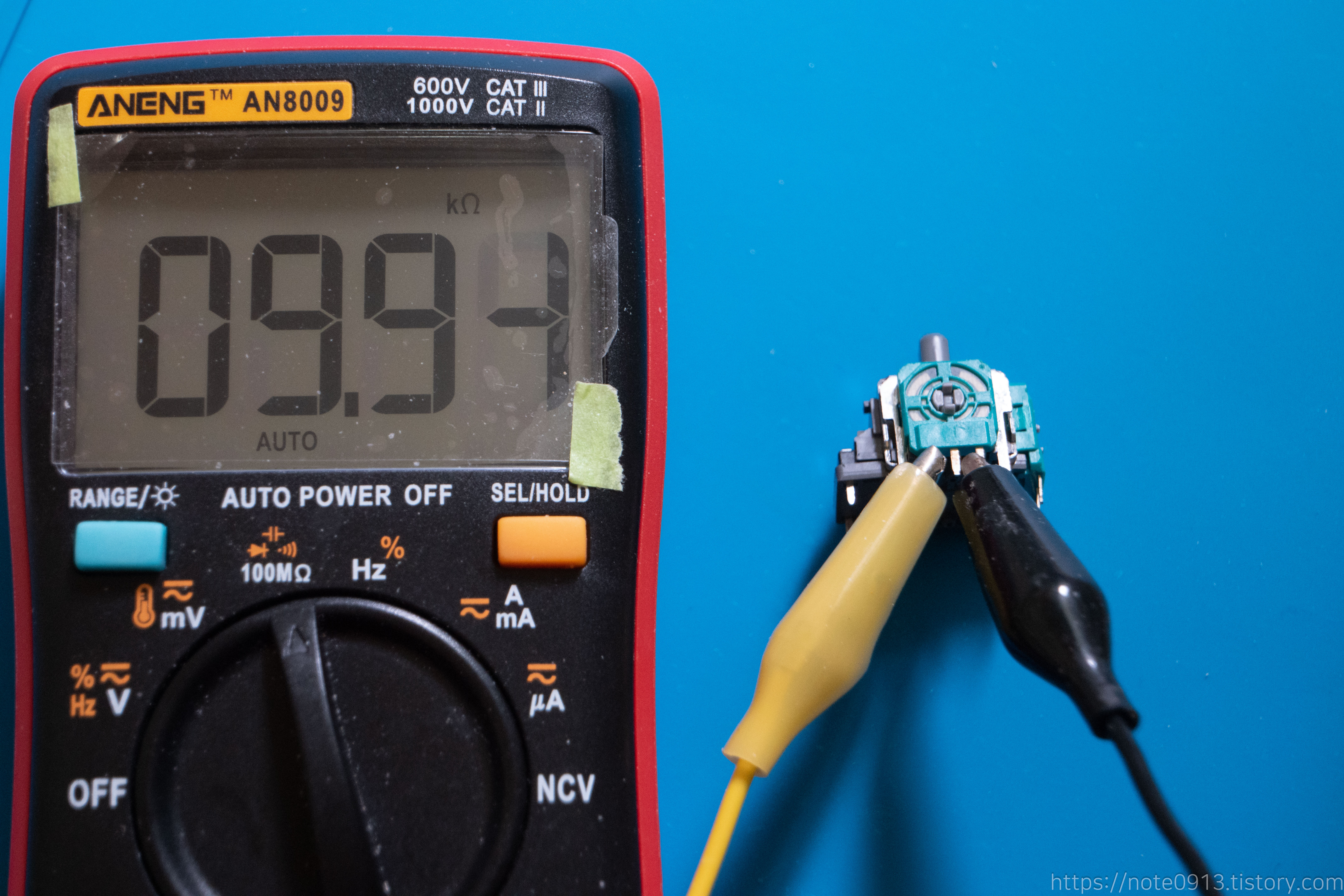 반면에 새로 구입한 스틱의 저항 값은 10KΩ에 매우 근접합니다. 상하 가변저항은 10.00KΩ, 좌우 가변자항은 9.94KΩ 으로 10KΩ에 매우 근접하게 측정되고 있습니다.