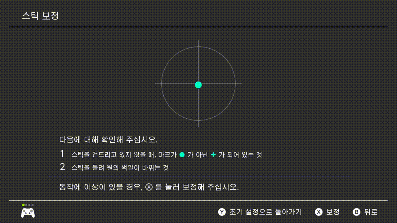 스위치 설정에서 스틱 보정 메뉴에서 확인해 보면 L스틱을 당겼다가 놓으면 중립으로 가지못하는 현상이 나타납니다.