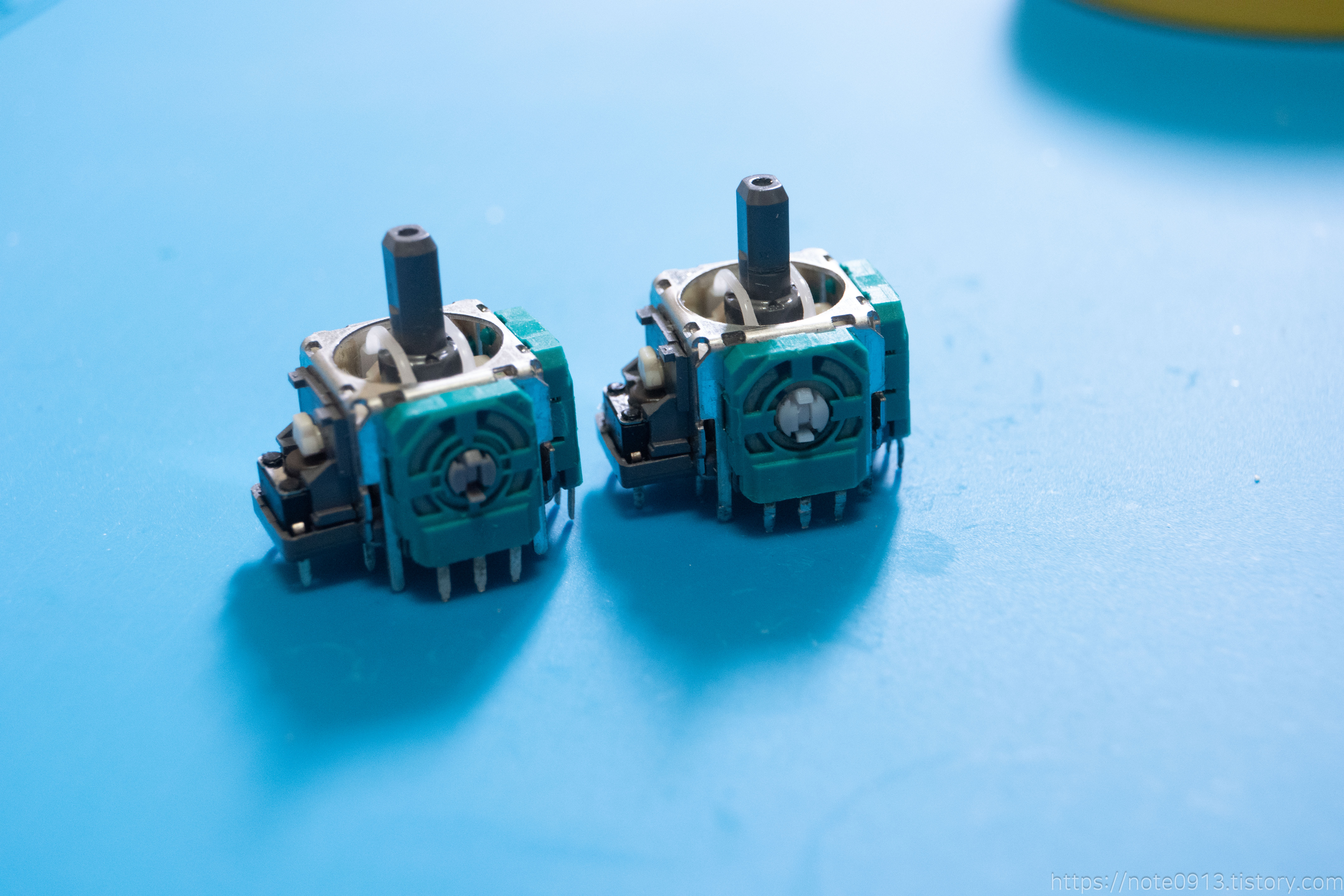 기존 스틱과 비교해보면 센서 축 부분의 색이 다릅니다. 기존 부품은 흰색인데 새로 교체할 부품은 회색으로 되어있습니다. 색깔이 다른 것 빼고는 나머지는 똑같습니다.