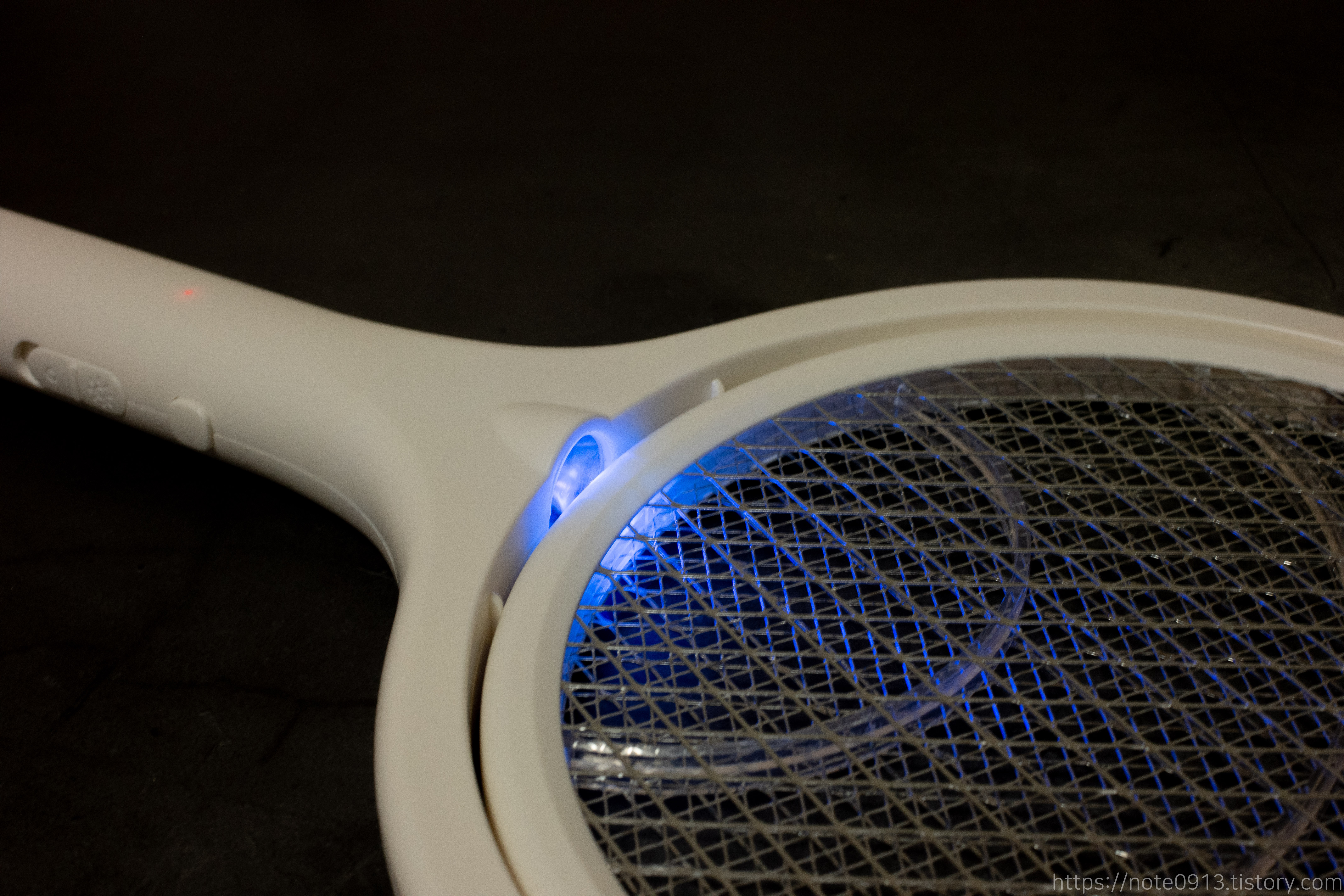 이 모기채의 가장 큰 특징인 부분, 바로 철망 부분이 90도 회전이 가능합니다. 다만 한방향으로만 회전이 가능해서 살짝 아쉽지만 그래도 위 사진처럼 90도로 회전이 가능합니다. 이렇게 회전이 되면 벽에 붙어있는 모기같은 벌레를 좀 더 쉽게 잡을 수 있습니다.