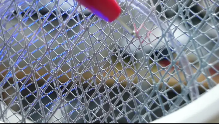 전기모기채의 핵심인 철망부분입니다. 철망은 3중 구조로 되어있고 바깥쪽의 2개의 철망 중 1개와 안쪽의 철망에 벌레가 닿으면 방전이 일어나는 구조입니다.