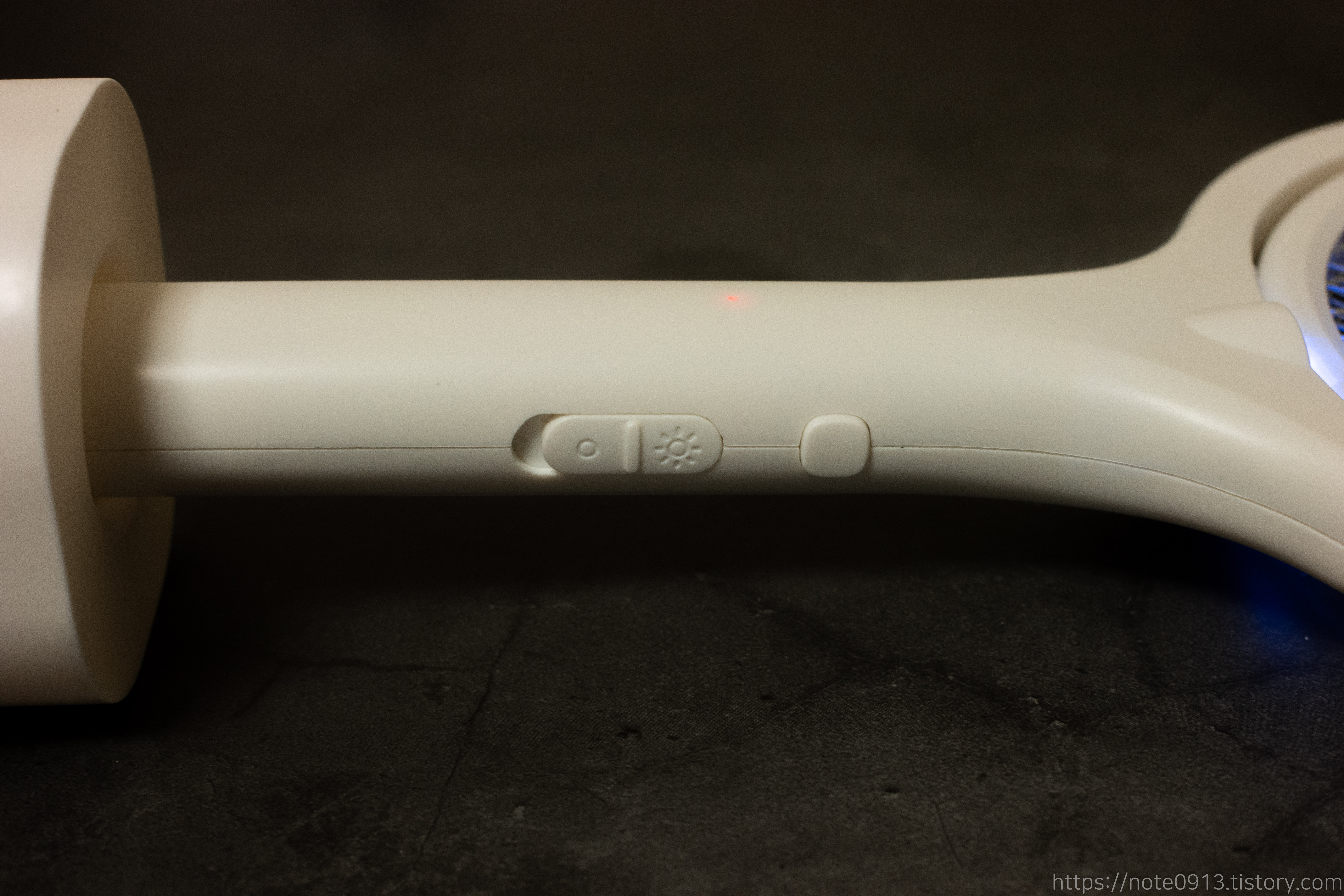 슬라이드 스위치는 3단계로 조절이 가능하고 작동 중일 때는 손잡이 가운데에서 빨간색 LED가 들어옵니다.
