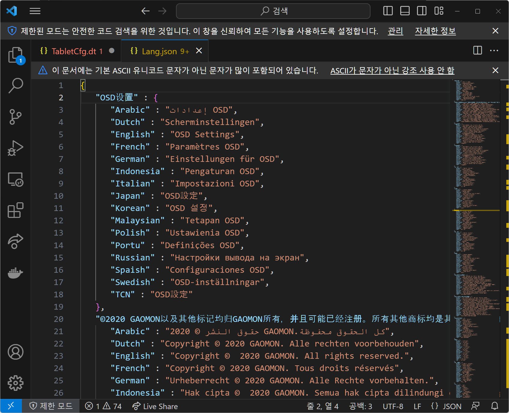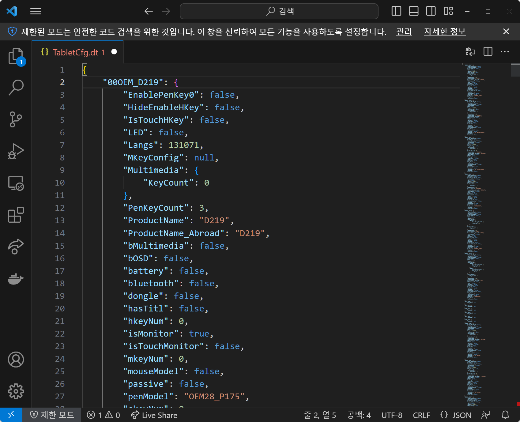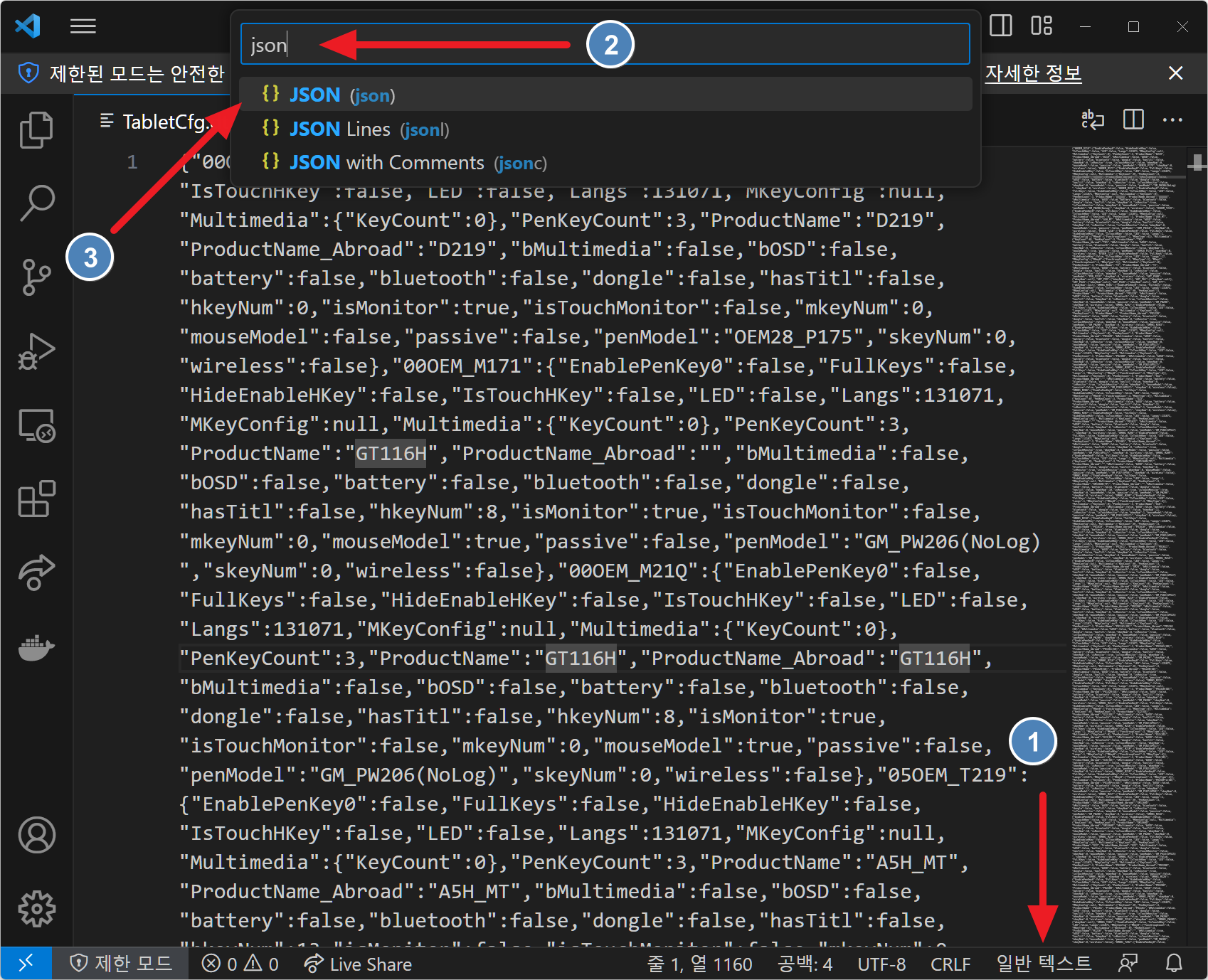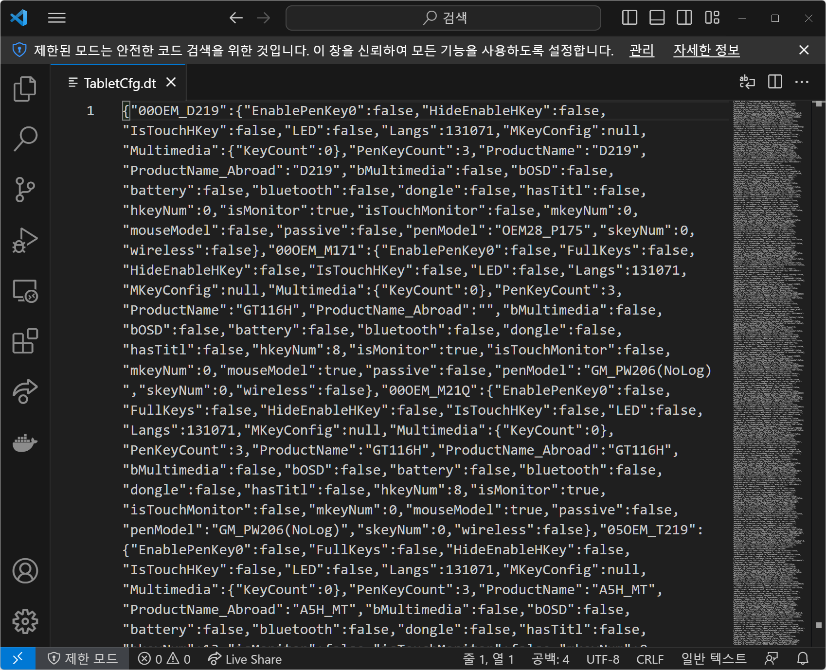 파일을 열어보면 타블렛에 관한 정보들이 주르륵 나옵니다. JSON 형식인데 이 상태로는 보기도 힘들고 편집도 힘든데 비주얼 스튜디오 코드를 쓰면 편하게 볼 수 있는 방법이 있습니다.