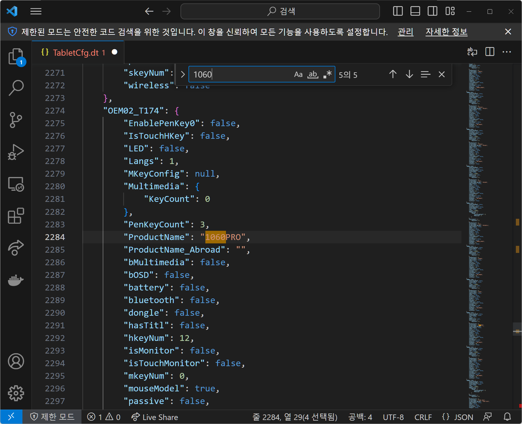 여기서 봐야할 것은 Langs 값인데 1060PRO와 같은 내수용 제품은 "Langs" : 1 로 설정이 되어있습니다.