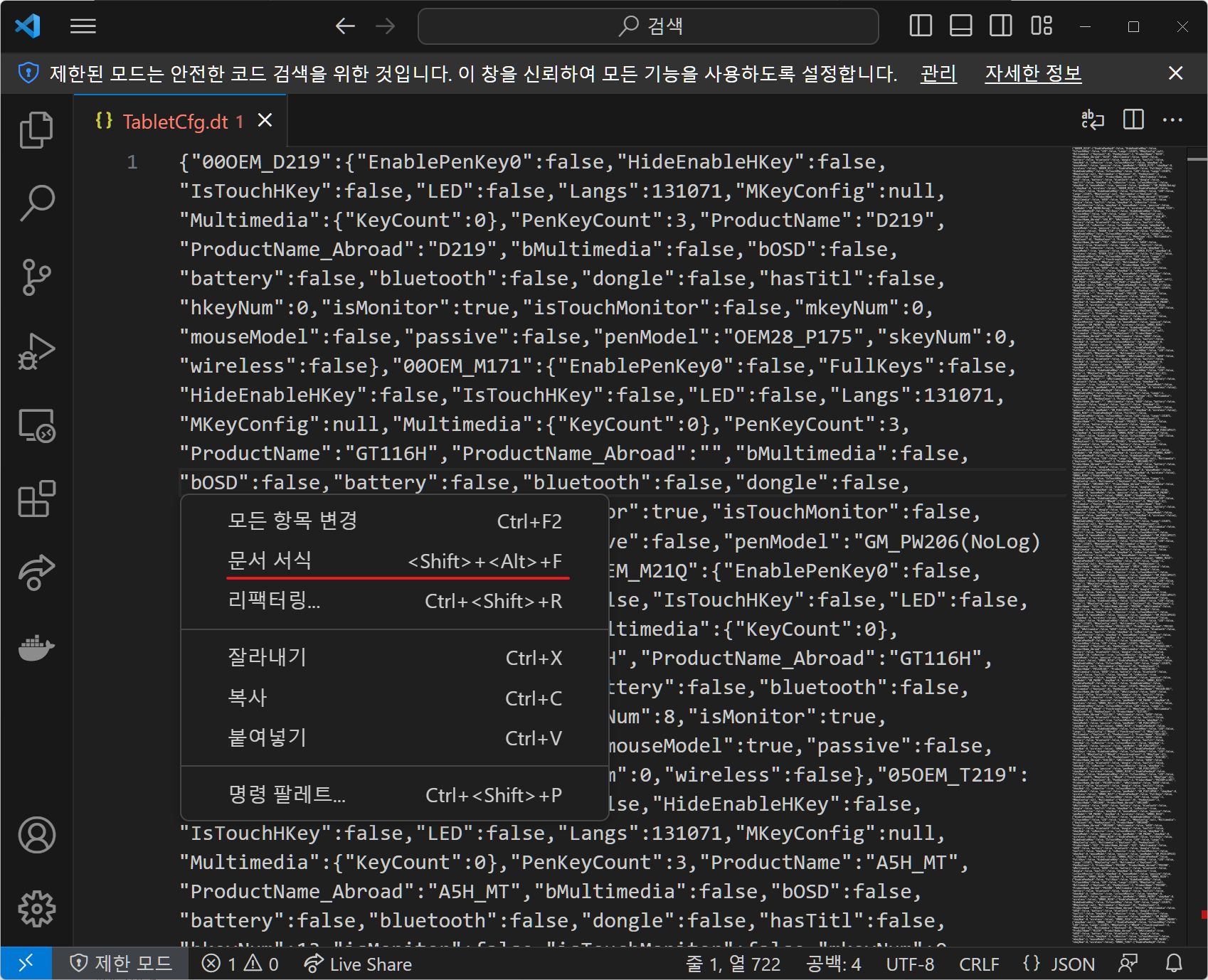 언어모드를 JSON으로 바꾸고 난 다음에 마우스 우클릭 - 문서 서식을 클릭합니다.