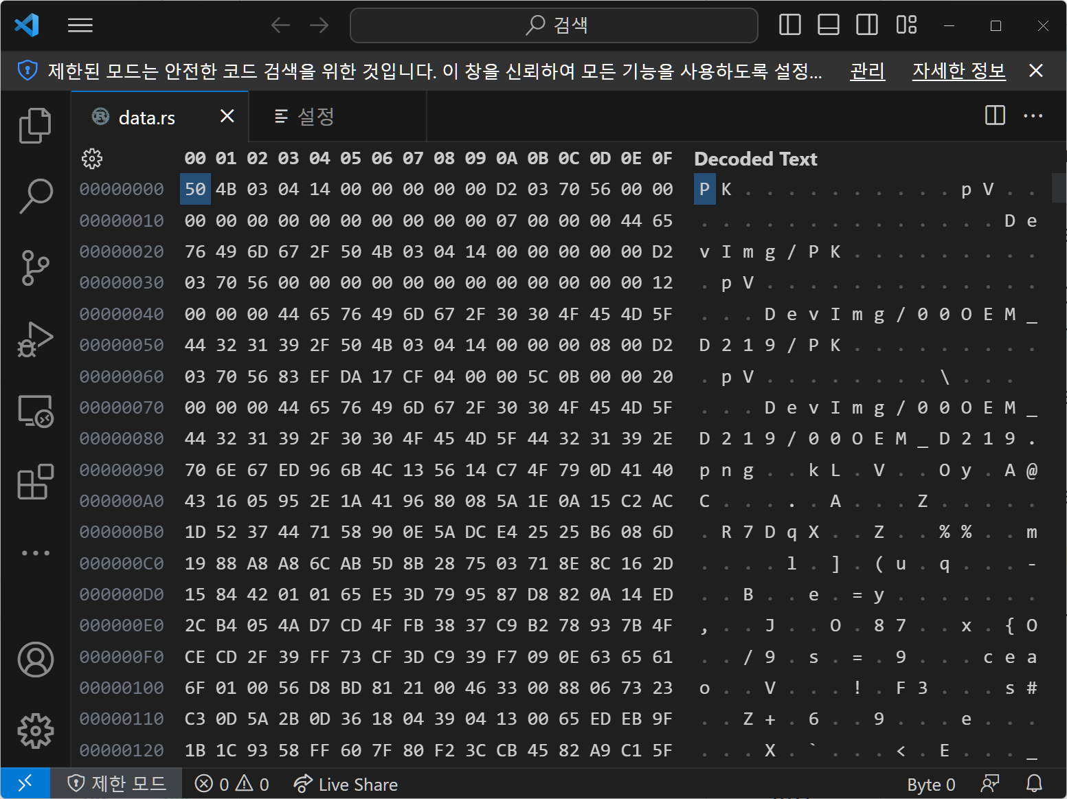 50 4B 03 04는 ZIP 파일 포맷을 가리키므로 이 data.rs 파일은 확장자가 rs이지만 사실은 ZIP 파일형식이였던 것입니다.