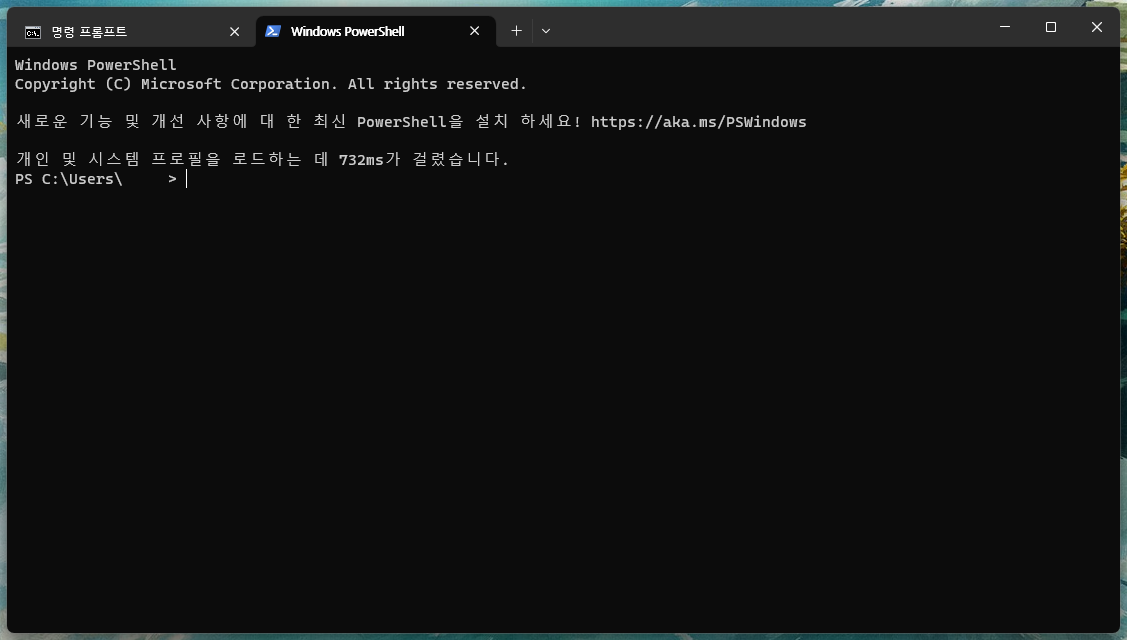 윈도우에서는 기본으로 제공되는 터미널인 명령 프롬프트(CMD), 파워쉘(PowerShell) 등의 프로그램이 있습니다.