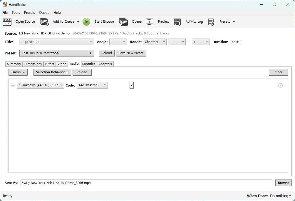 오디오는 원본 그대로인 AAC Passthru 로 설정했습니다.