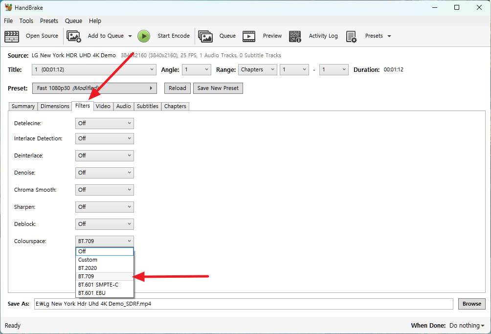 색공간을 BT.709로 설정하면 HDR 영상을 SDR 영상으로 변환을 할 수 있게됩니다.