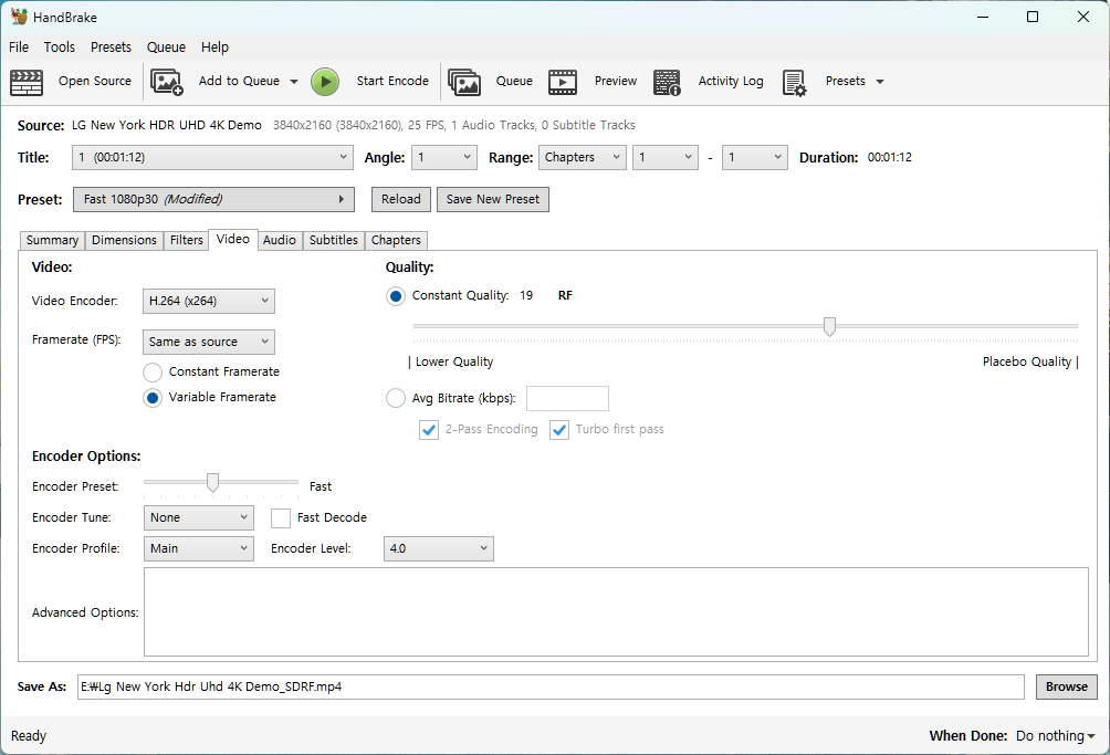 핸드브레이크 기본 프리셋은 프레임이 30으로 되어있으니 프레임을 Same as Source(원본과 동일)로 바꿔주세요. Quality(화질)부분은 원하는 값으로 설정하면 됩니다. 51이 화질이 가장 안좋고 0이 무손실인데 보통은 원본과 가깝게 인코딩을 하는 걸 원하니 저는 19로 했습니다.