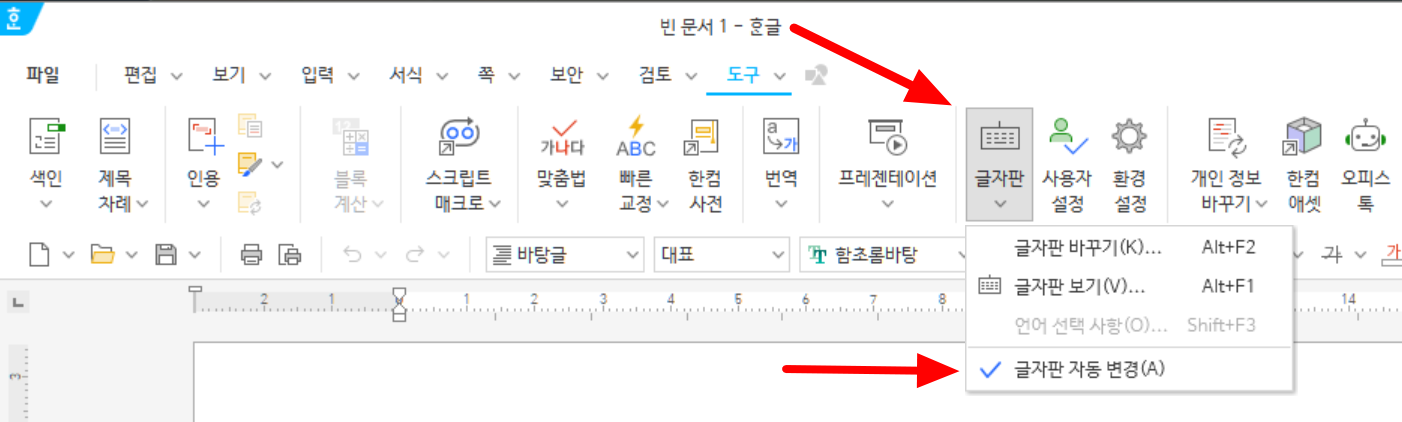도구를 클릭하고 메뉴를 보면 글자판이라는 메뉴가 있습니다. 글자판 메뉴를 클릭하고 글자판 자동 변경이라는 항목을 클릭하여 글자판 자동 변경을 해제합니다.