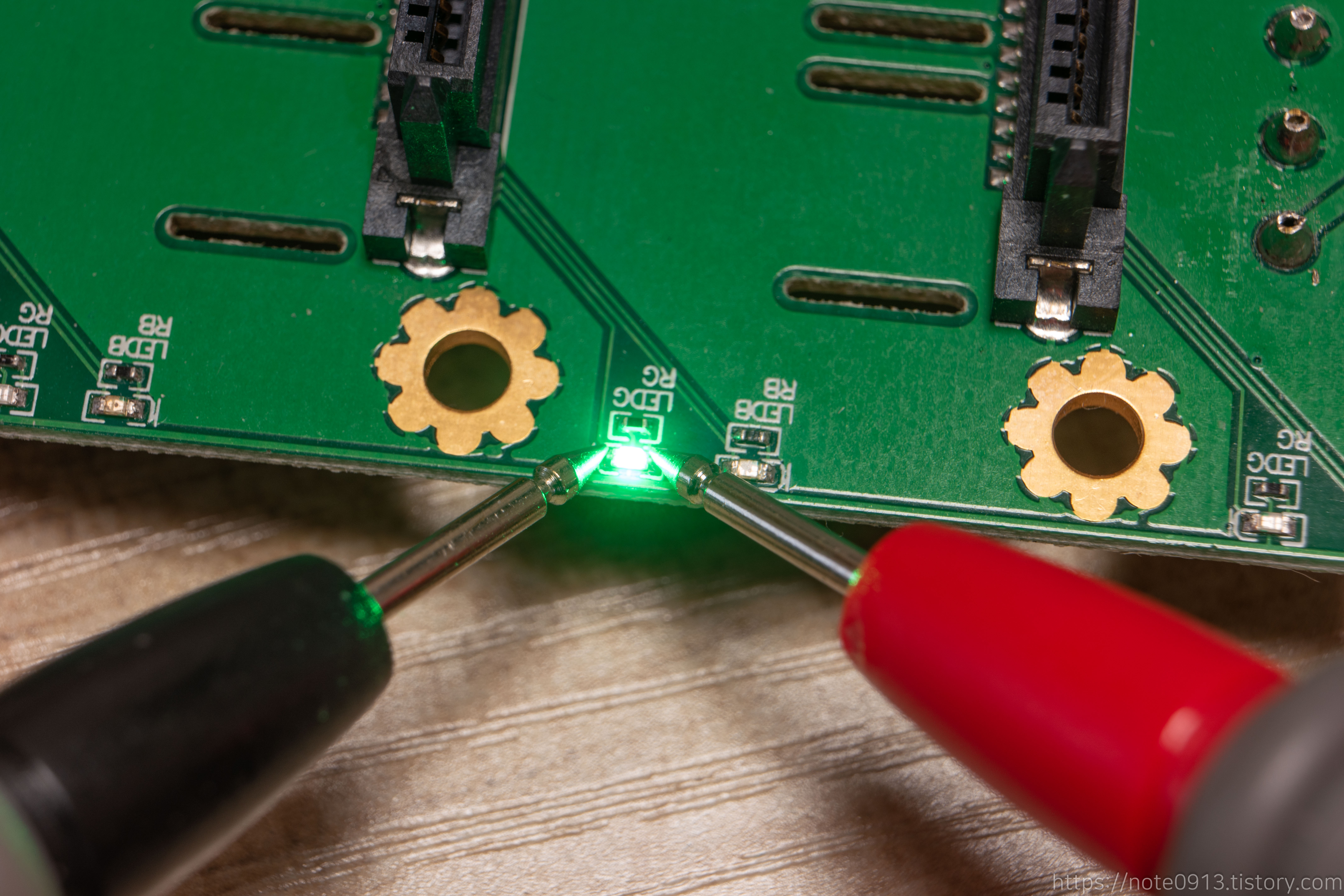 고장나지 않은 다른 곳을 멀티미터로 테스트해보면 불이 들어옵니다. 파란색 LED의 순반향 전압은 대략 2.6V, 초록색 LED 순방향 전압은 약 2.3V로 측정됩니다.
