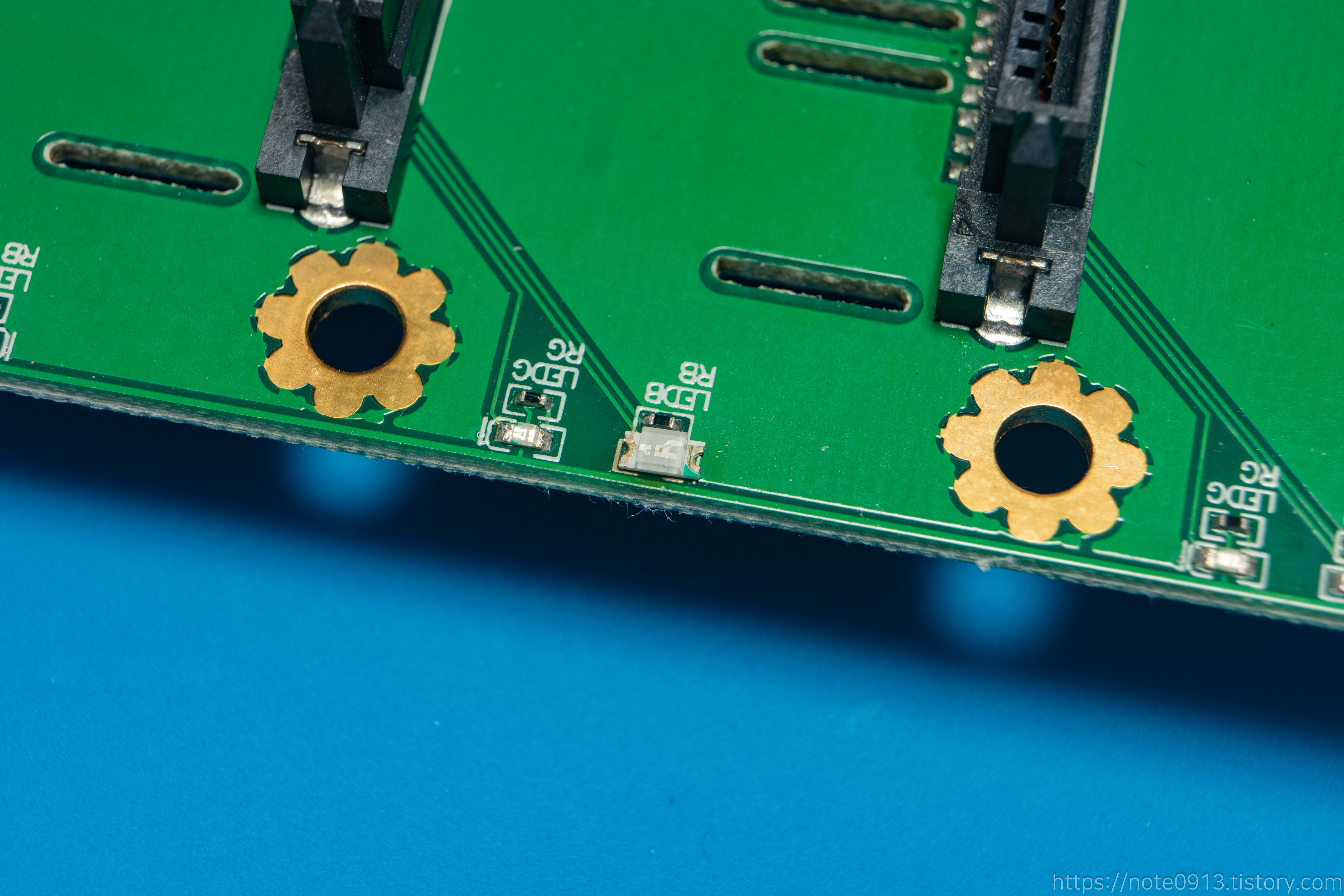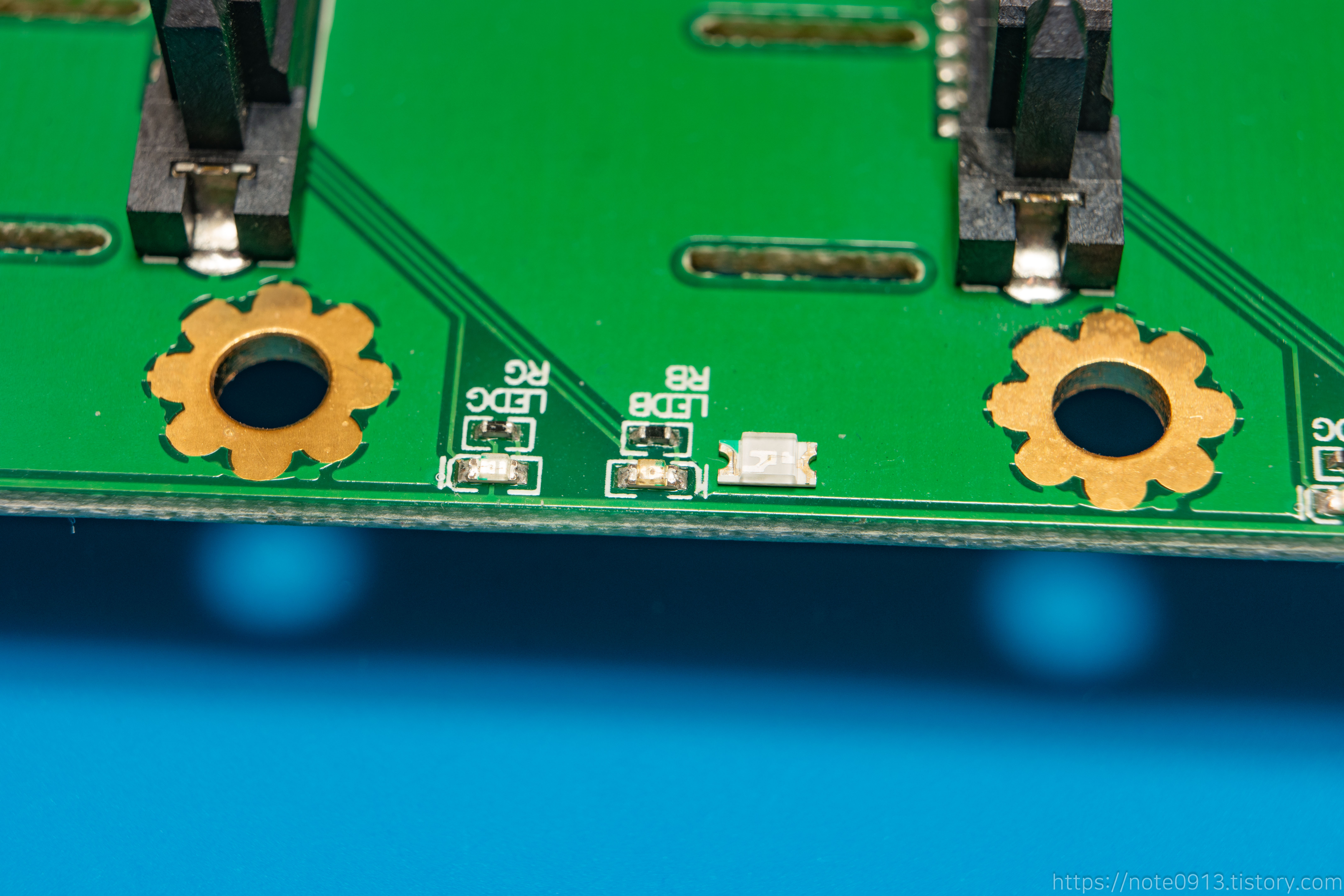 정상적으로 파란색 LED가 잘 나옵니다. 다만 사이즈가 달라서 그런지 교체한 LED가 조금 더 밝게 나오네요.
