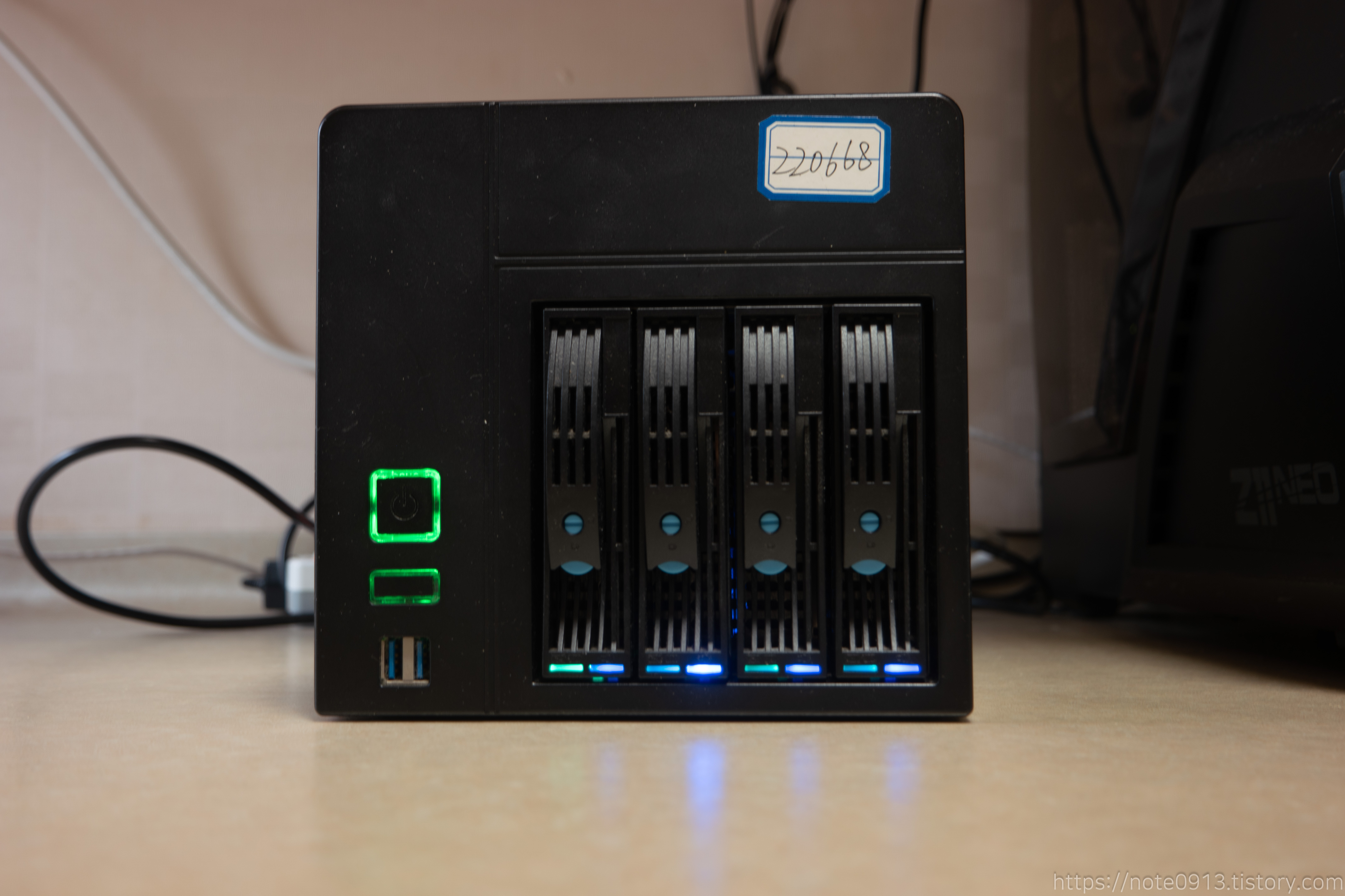 조립하고 하드디스크를 넣어서 파란색 LED가 잘 나오는지 테스트해 보았습니다.