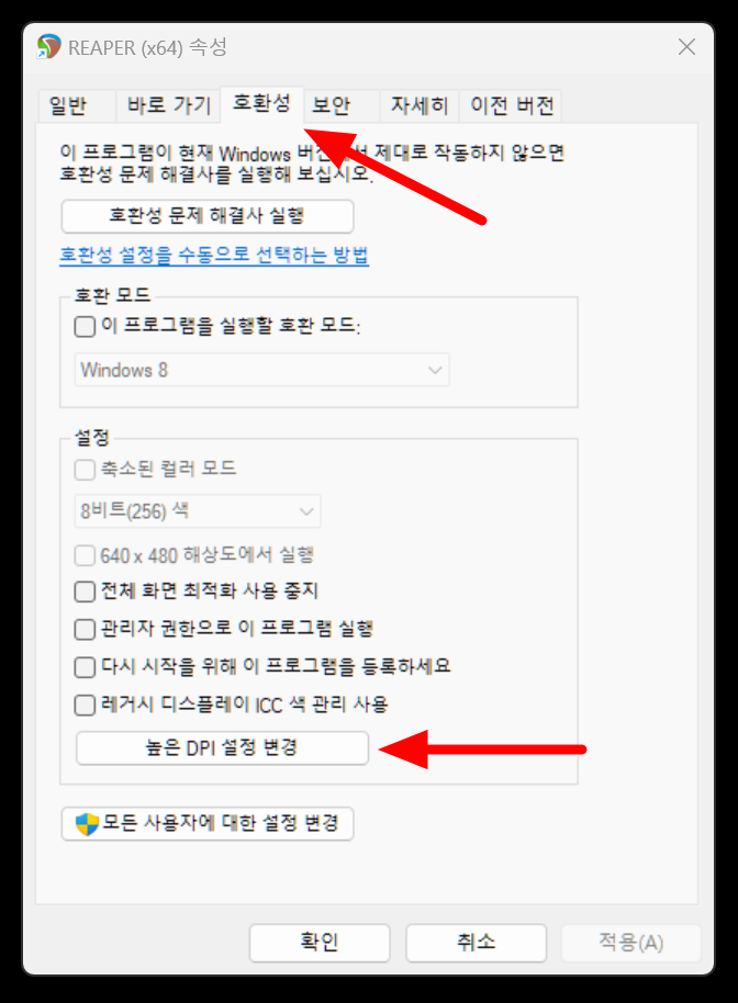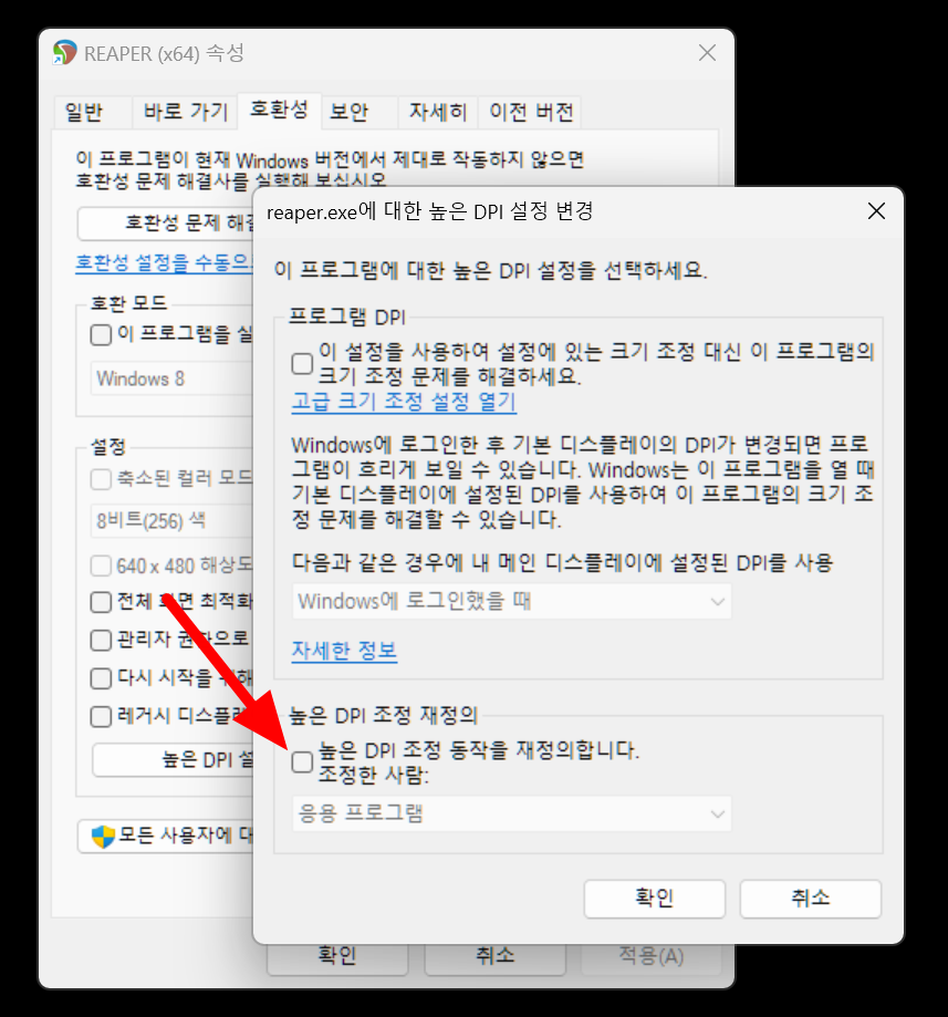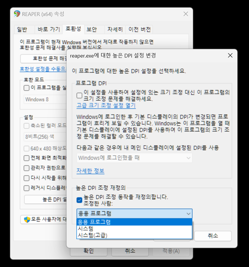 아무튼 이렇게 배율이 제대로 적용되지 않는 프로그램을 높은 DPI 조정 재정의 라는 옵션을 통해 배율을 적용할 수 있습니다.