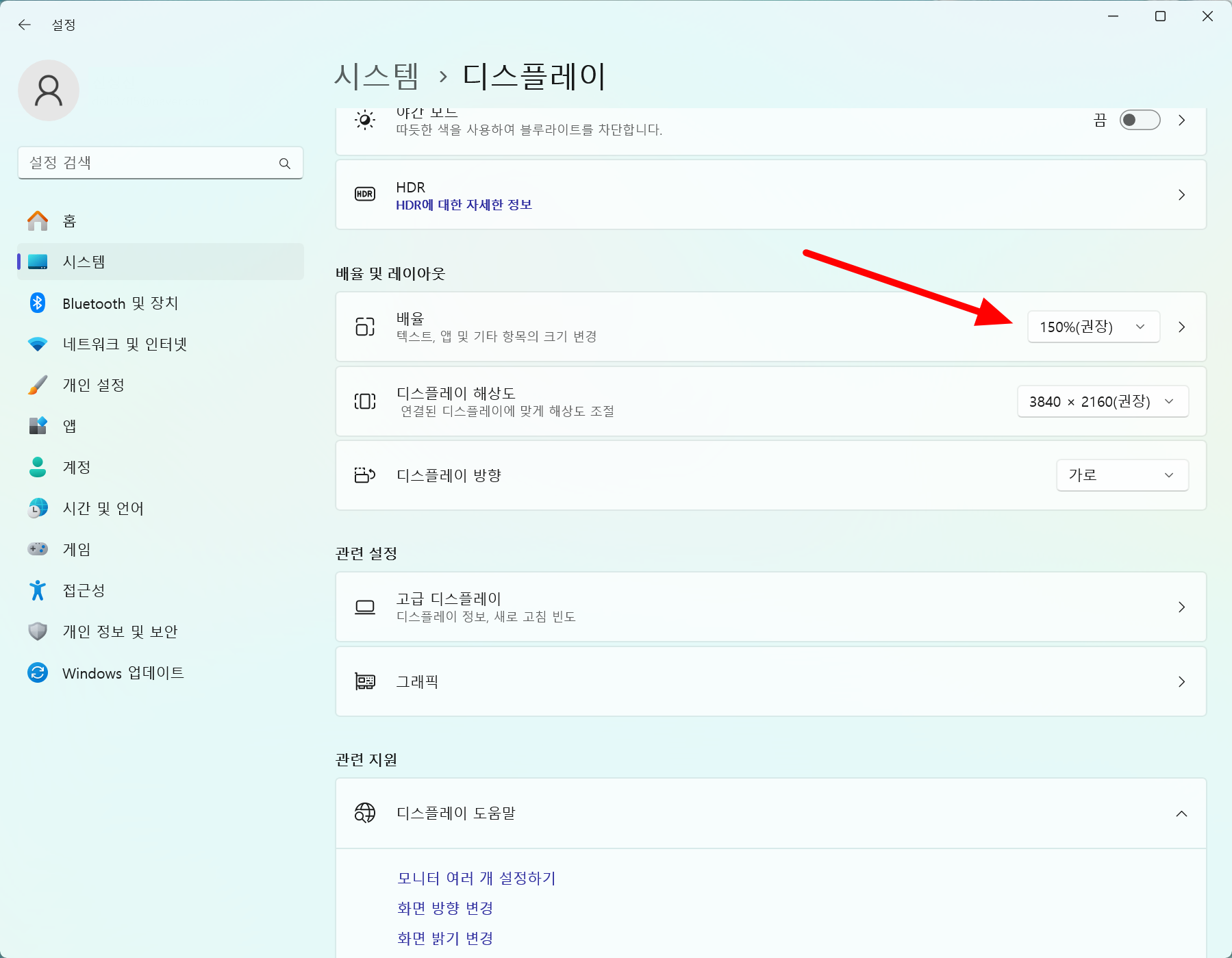 윈도우 11과 10에서는 설정에서 디스플레이 항목을 보면 디스플레이 배율 설정이라는 메뉴가 있습니다.