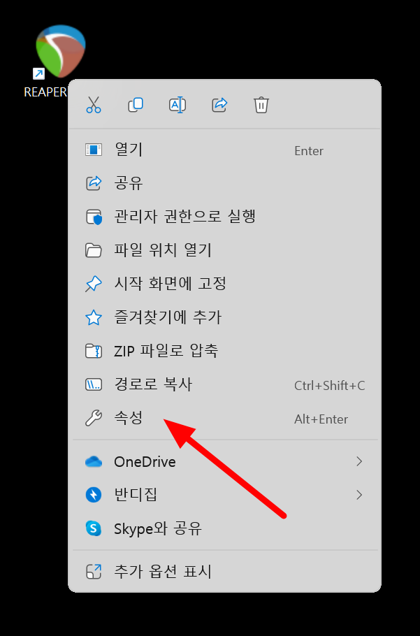 프로그램의 바로가기나 EXE 파일을 찾아서 우클릭한 후에 메뉴에서 속성을 클릭해 줍니다.