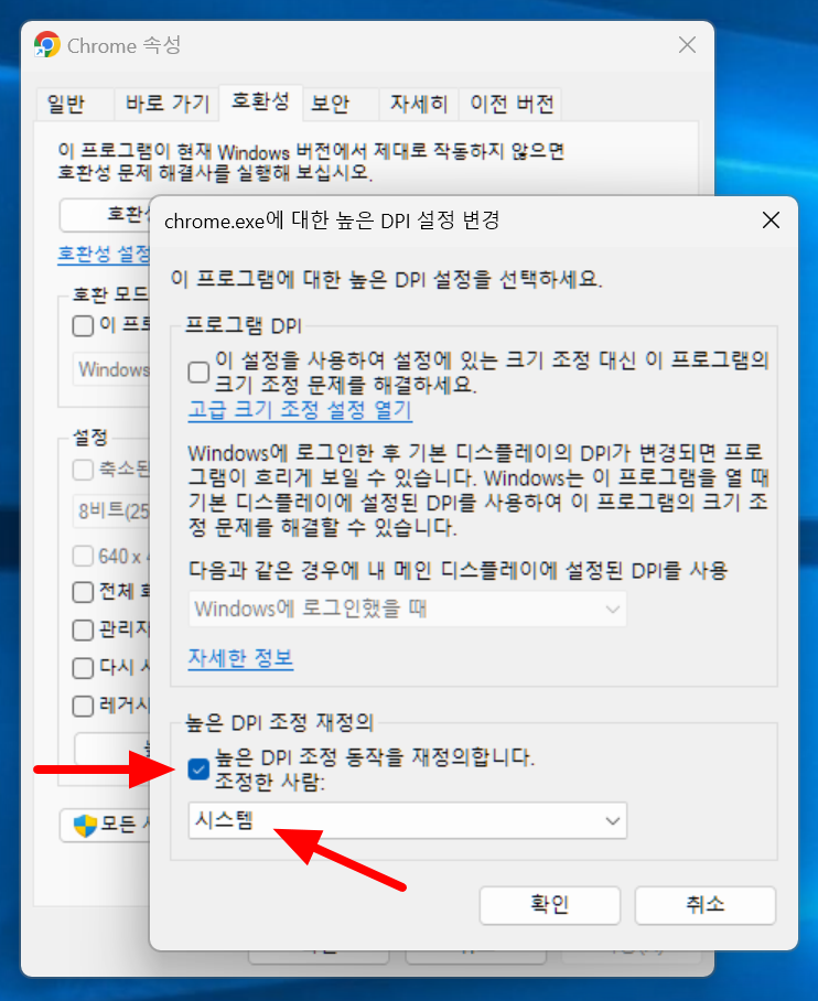 높은 DPI 조정 재정의 체크박스를 클릭하고 옵션은 시스템으로 설정한다음 확인을 클릭해 줍니다.