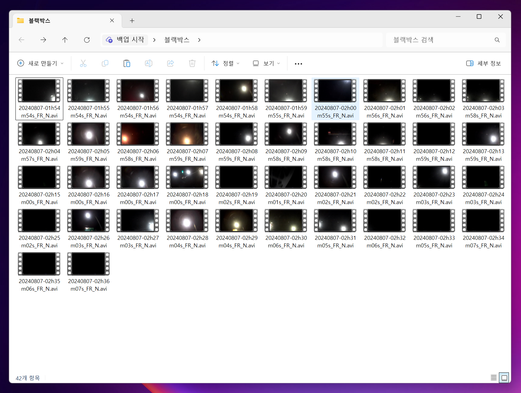 하지만 블랙박스 SD 카드에 저장된 파일들을 보면 전방 카메라 영상 파일밖에 없습니다. 처음에는 전방 카메라만 녹화되게 설정이 되어있나 생각했었습니다.
