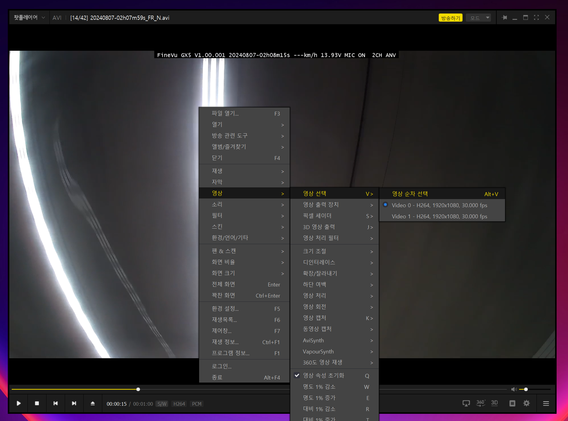 즉, AVI 파일에 전방카메라 영상이 1번으로 설정되어 있어서 동영상 플레이어에서 재생하면 전방 카메라 영상만 표시되는 것이였습니다.