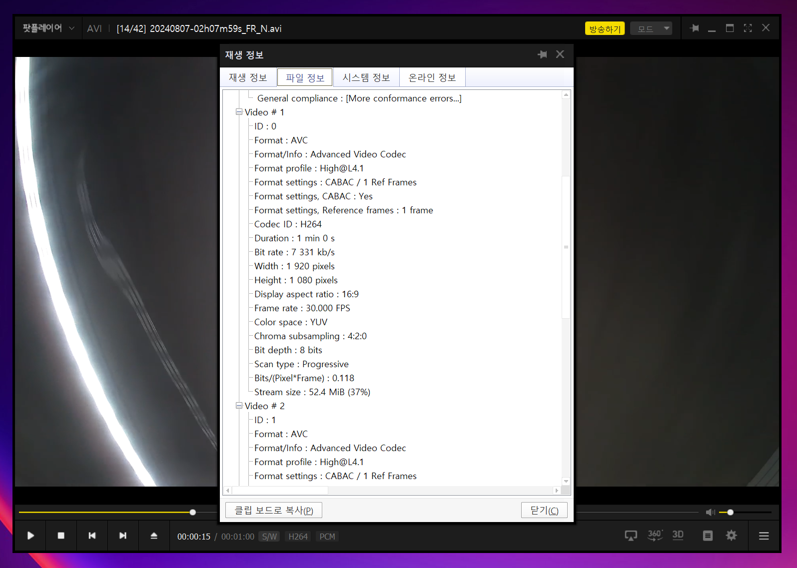 팟플레이어로 동영상 정보를 확인해 보니 파일에 동영상 2개가 저장이 되어 있었습니다. 블랙박스 영상이 AVI 파일에 전방 영상과 후방영상, 그리고 오디오 파일이 담겨져 있습니다.
