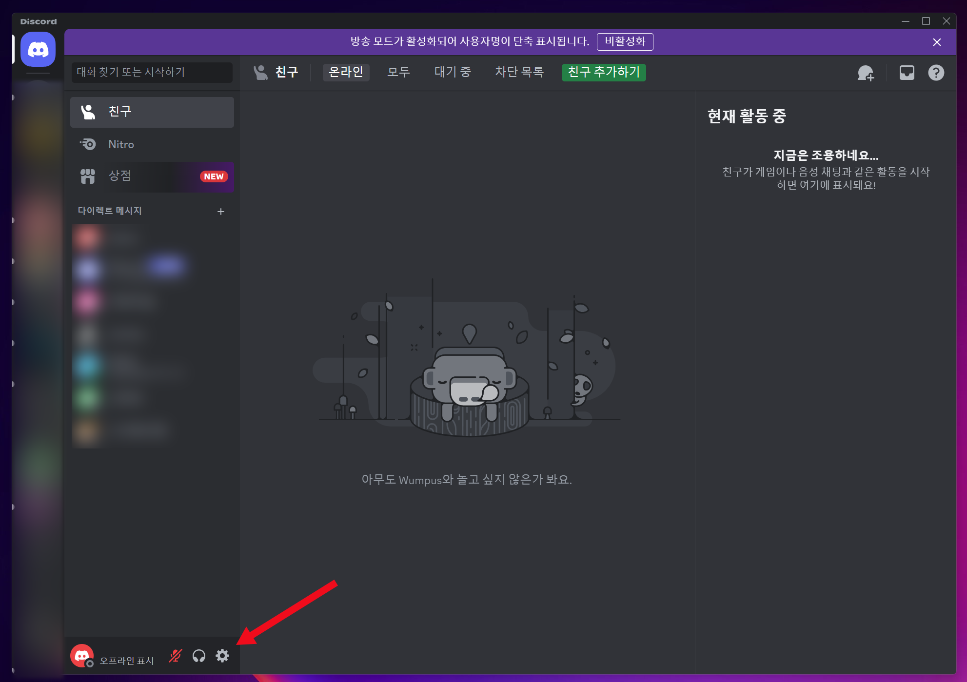 디스코드 설정을 하기위해서 좌측하단에 톱니바퀴 모양의 설정 아이콘을 클릭해줍니다.