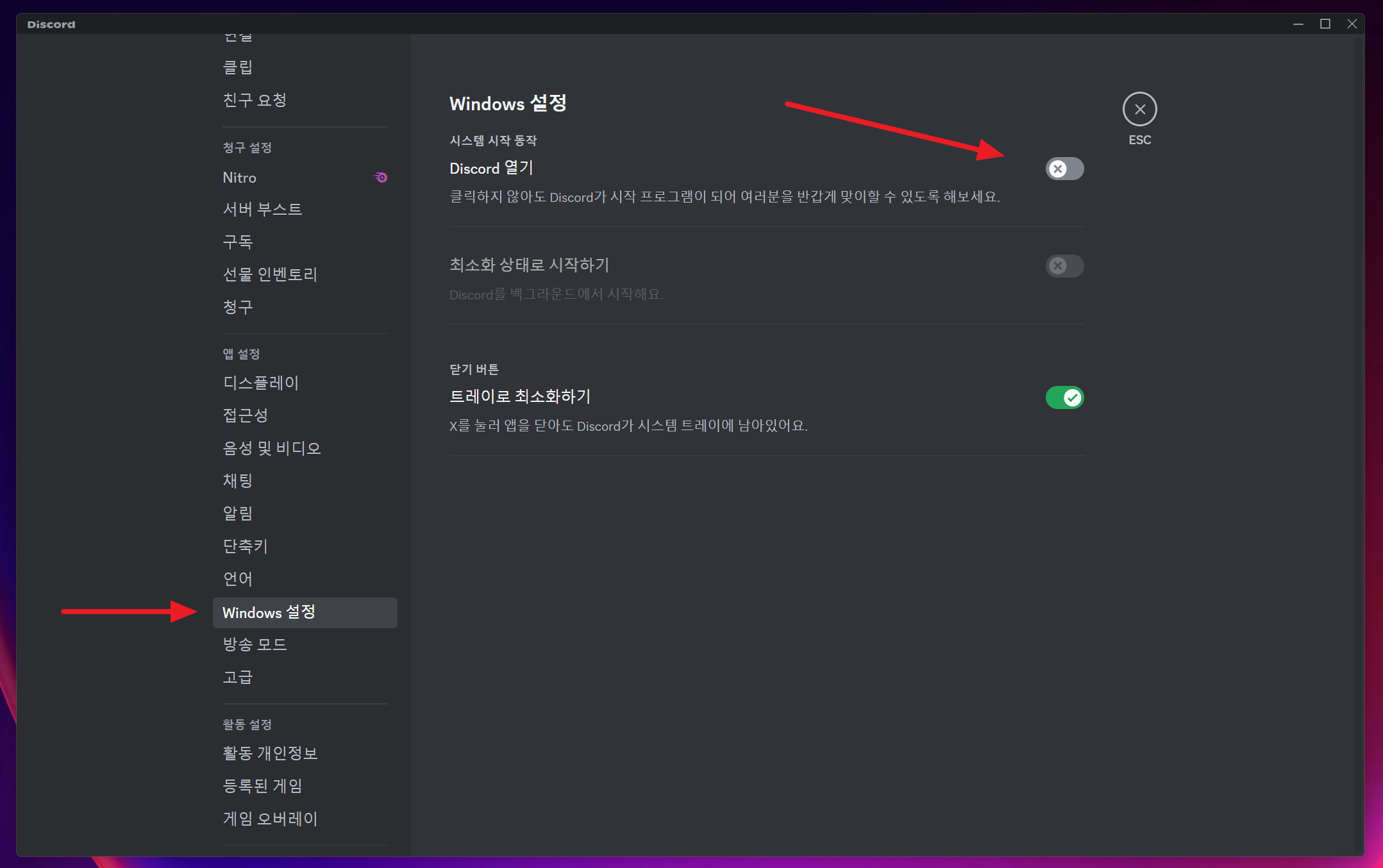 이렇게 하면 윈도우 시작 시 자동으로 디스코드가 실행되지 않게 됩니다.