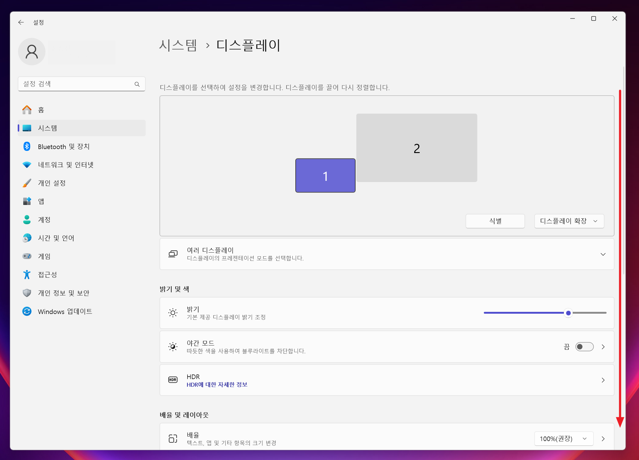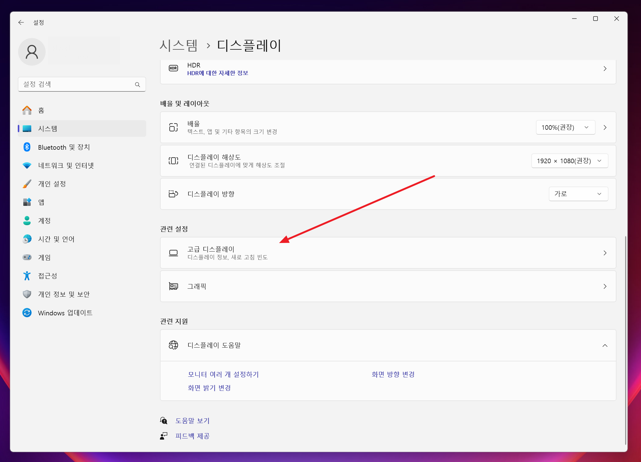 아래쪽에 고급 디스플레이 항목이 있습니다. 클릭해 줍니다.
