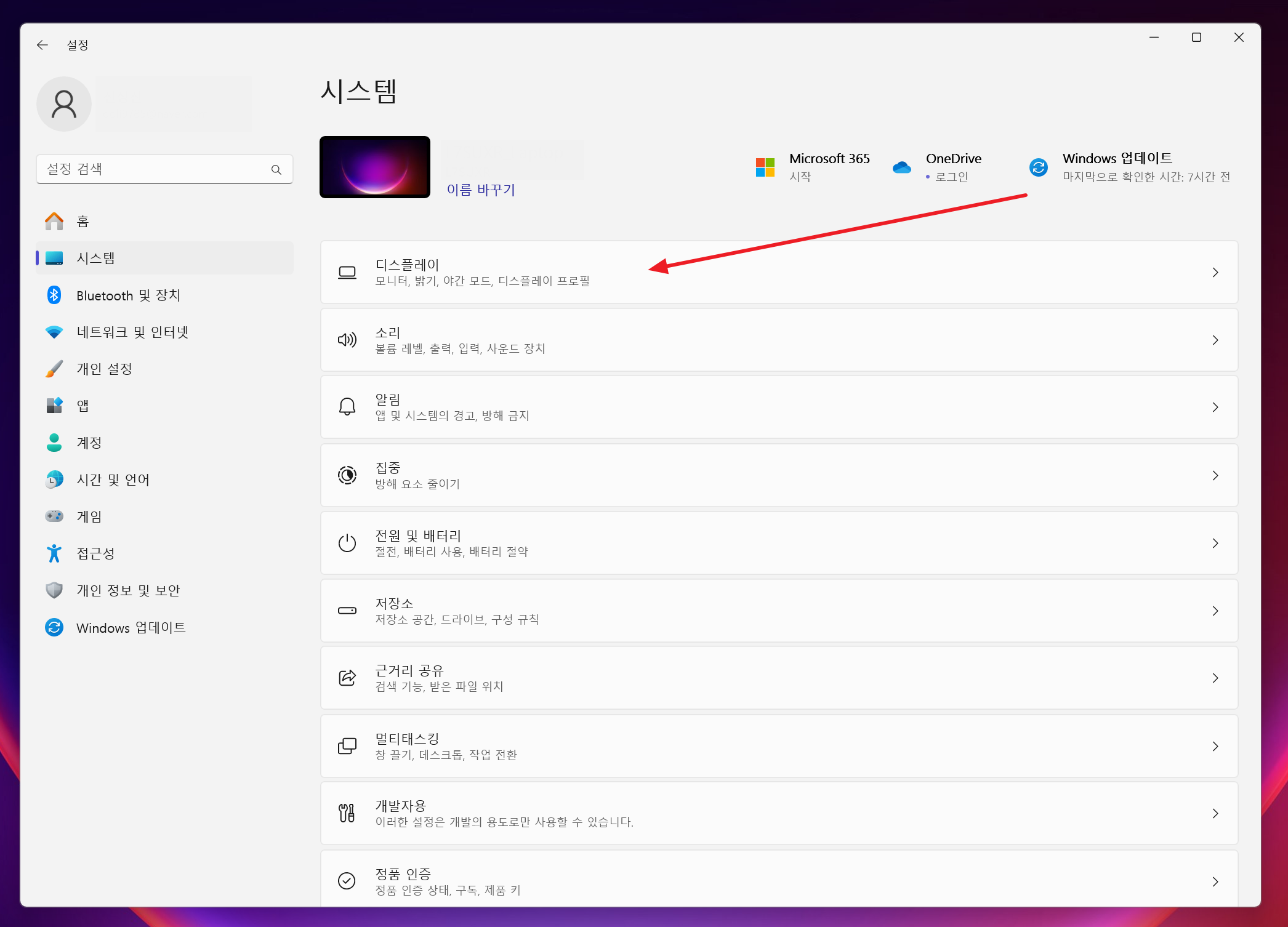 시스템 항목을 클릭하면 위 사진처럼 나타납니다. 맨 첫번째에 있는 디스플레이 메뉴를 클릭해 줍니다.