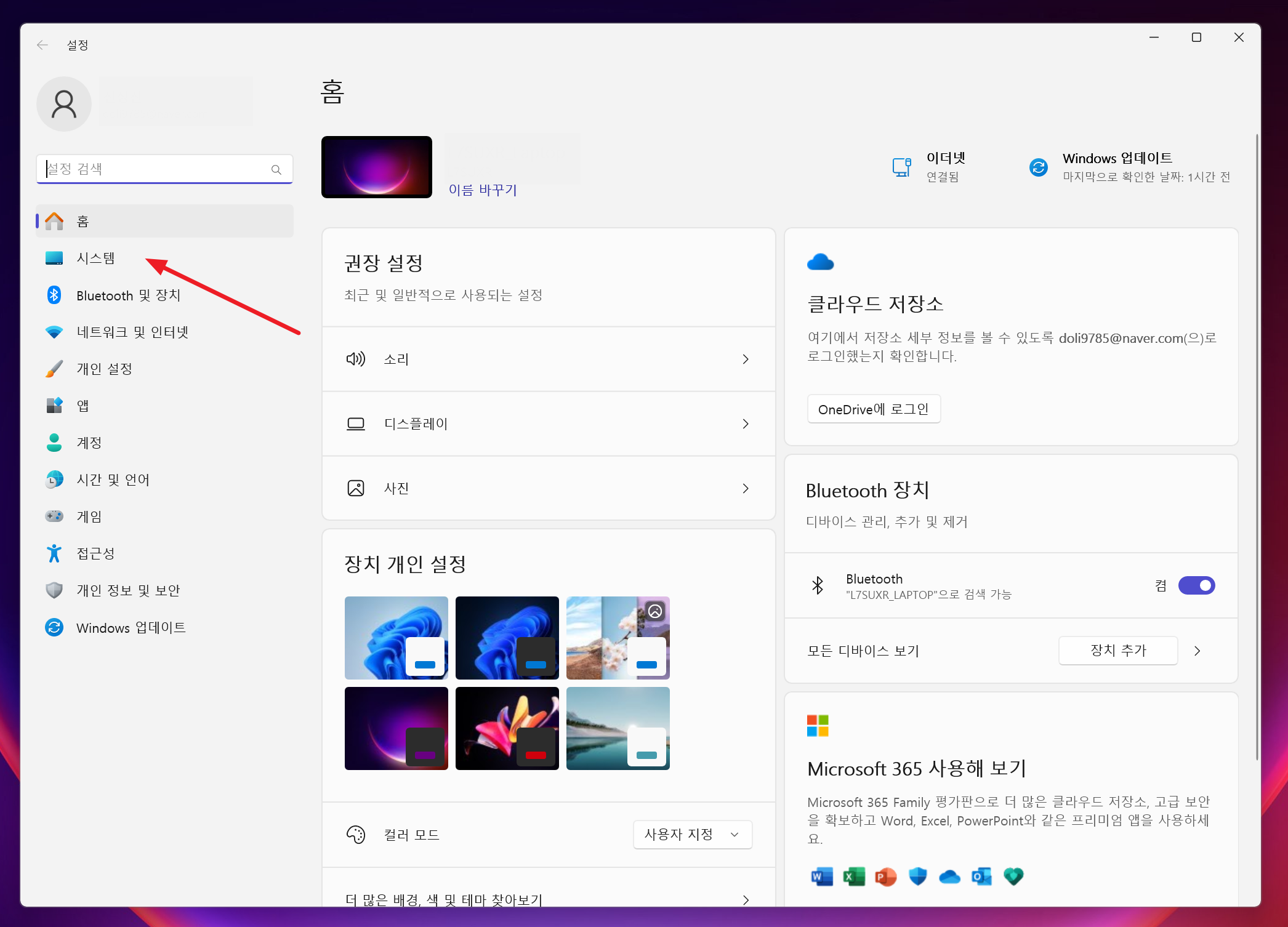 그런다음에 설정에서 좌측에 시스템 항목을 클릭해줍니다.
