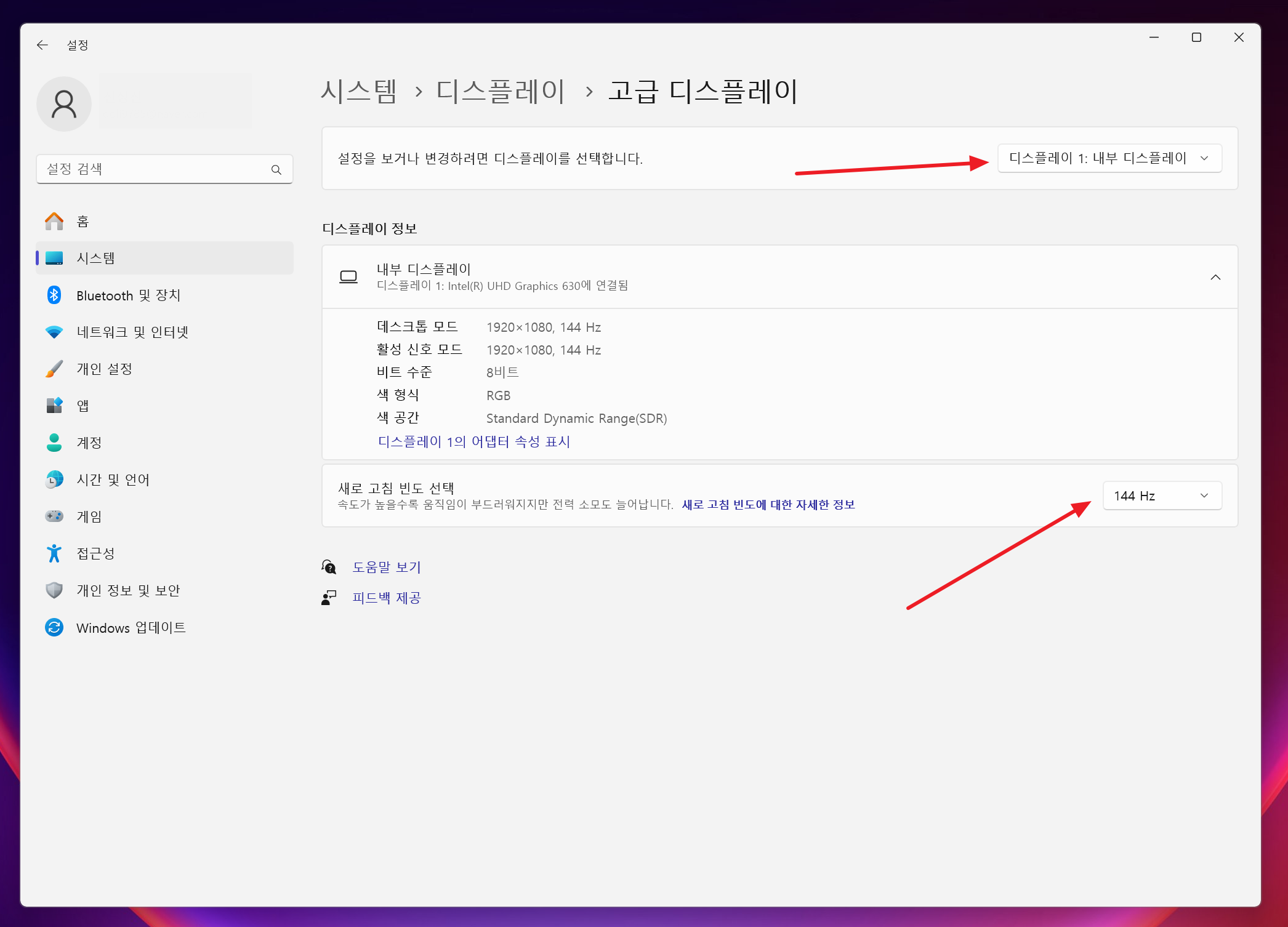 윈도우에서는 기본적으로 주사율을 최고 주사율로 설정하지만 여러가지 이유로 주사율이 변경되어 있을 수도 있습니다. 만약 고주사율 모니터를 사용 중인데 주사율이 이상한 것 같다면 주사율 설정을 확인해 보시기 바랍니다.