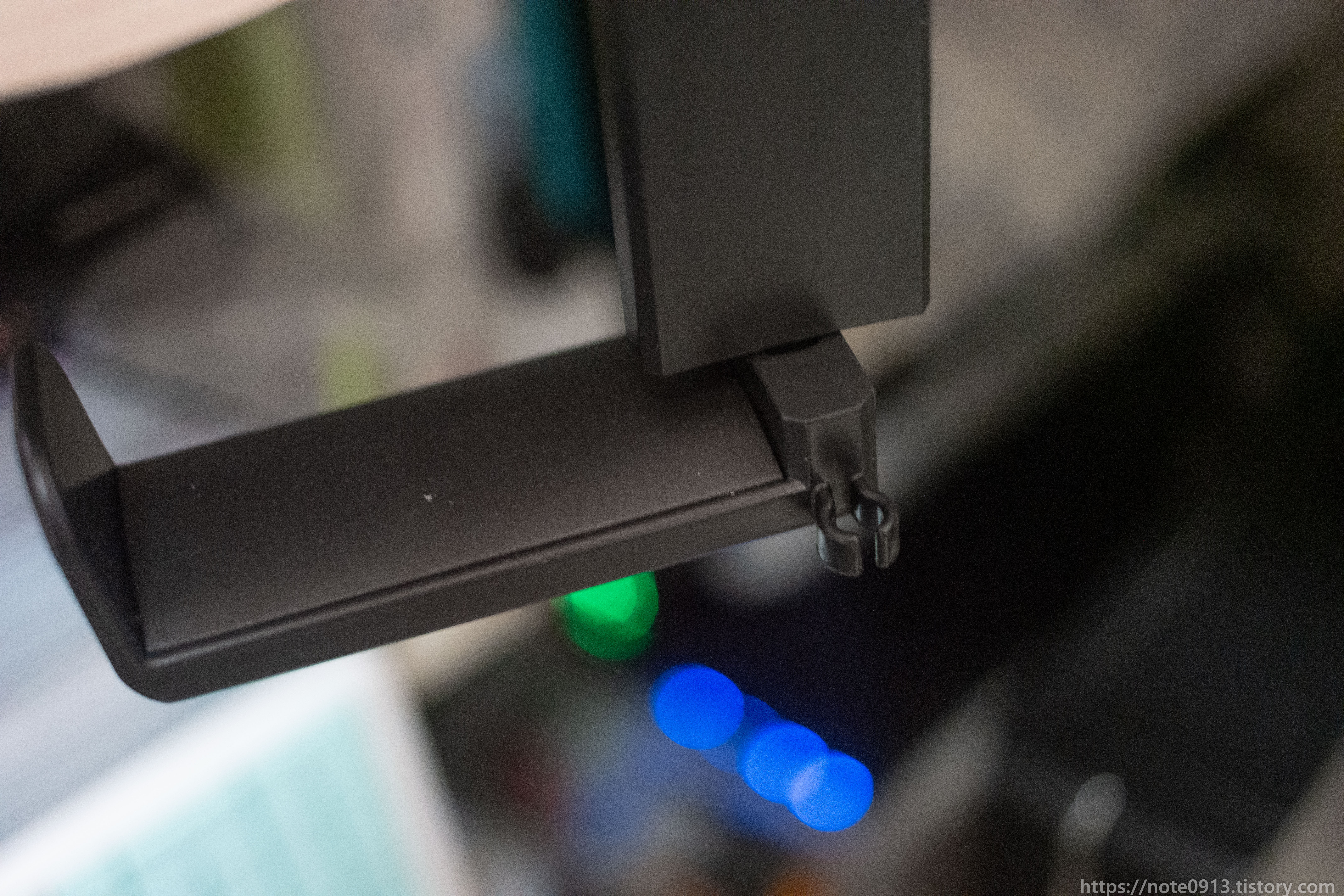 또한 거치대 옆에 헤드폰 선을 넣어서 정리할 수 있는 케이블 홀더도 달려있습니다. 헤드폰 쓸 때, 3.5mm 연장선을 사용하는데 저기다 꽂으면 선정리도 되고 깔끔합니다.