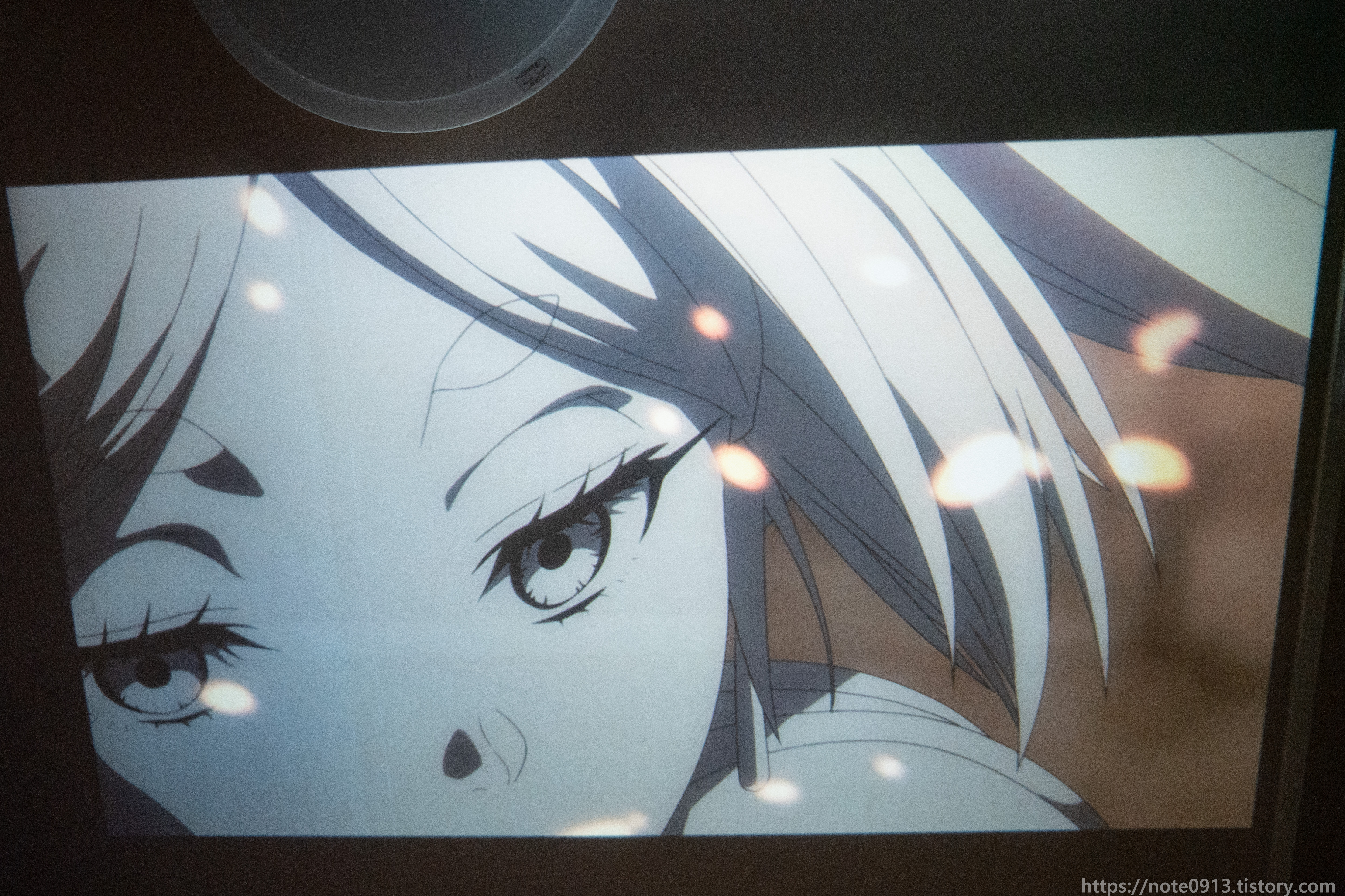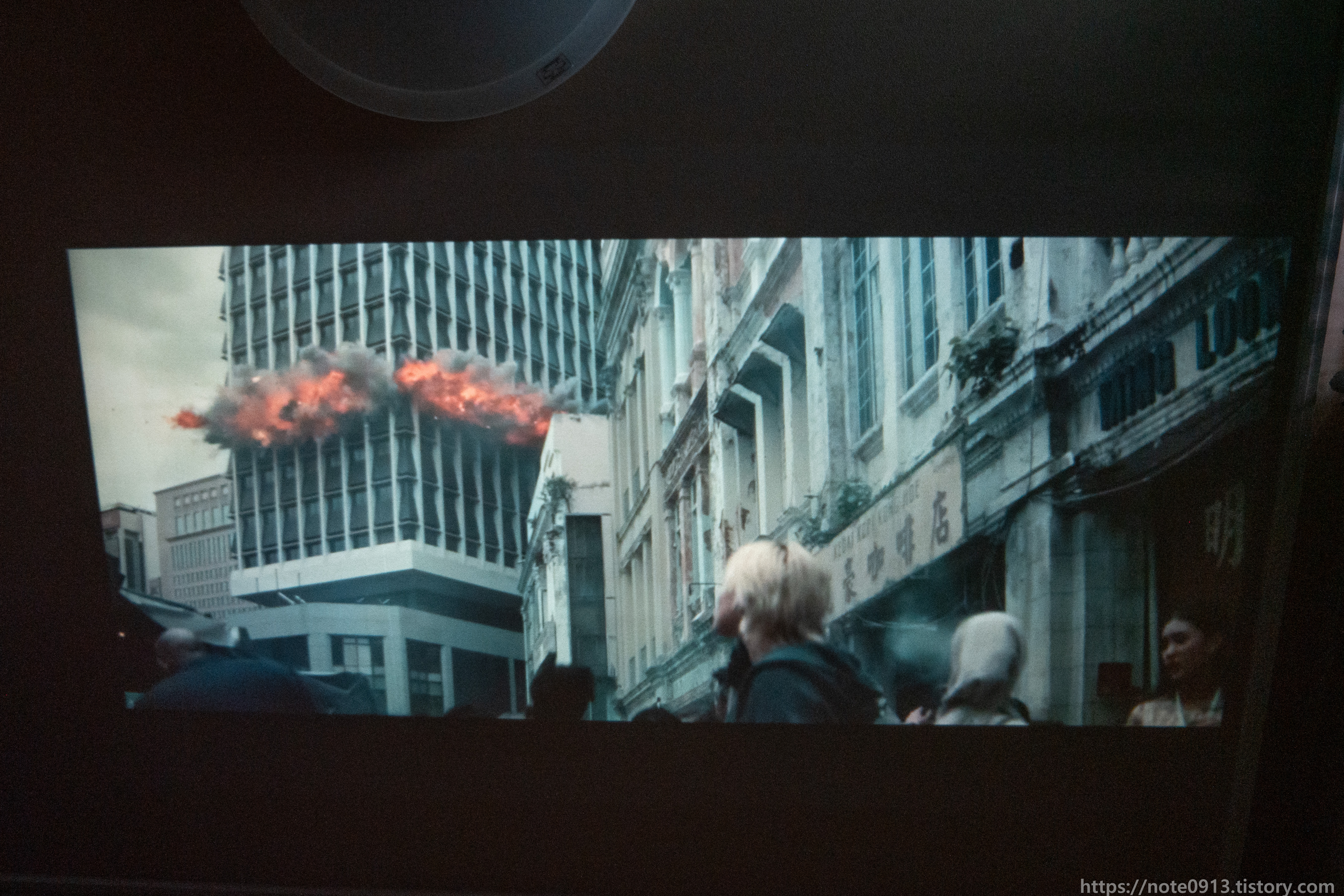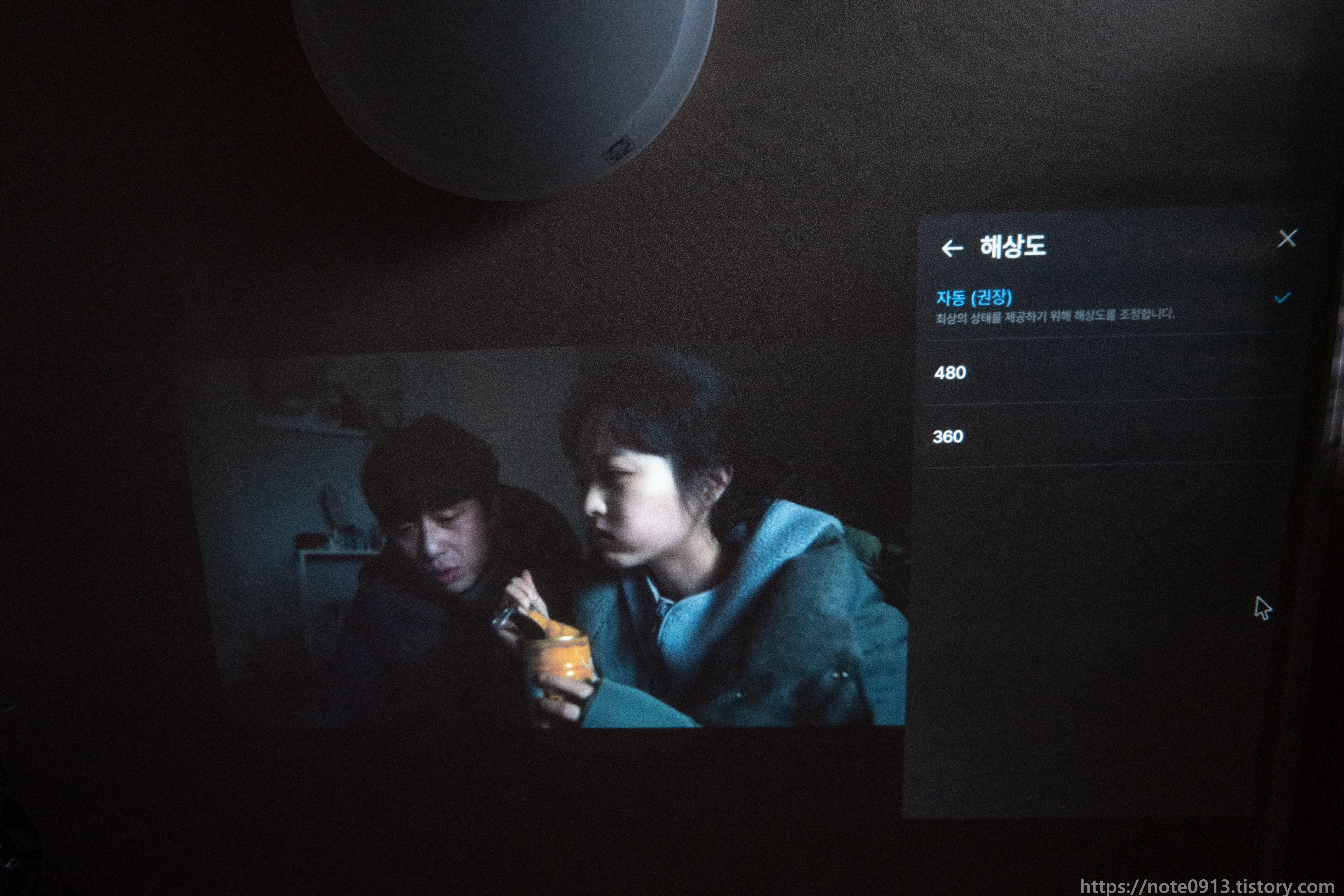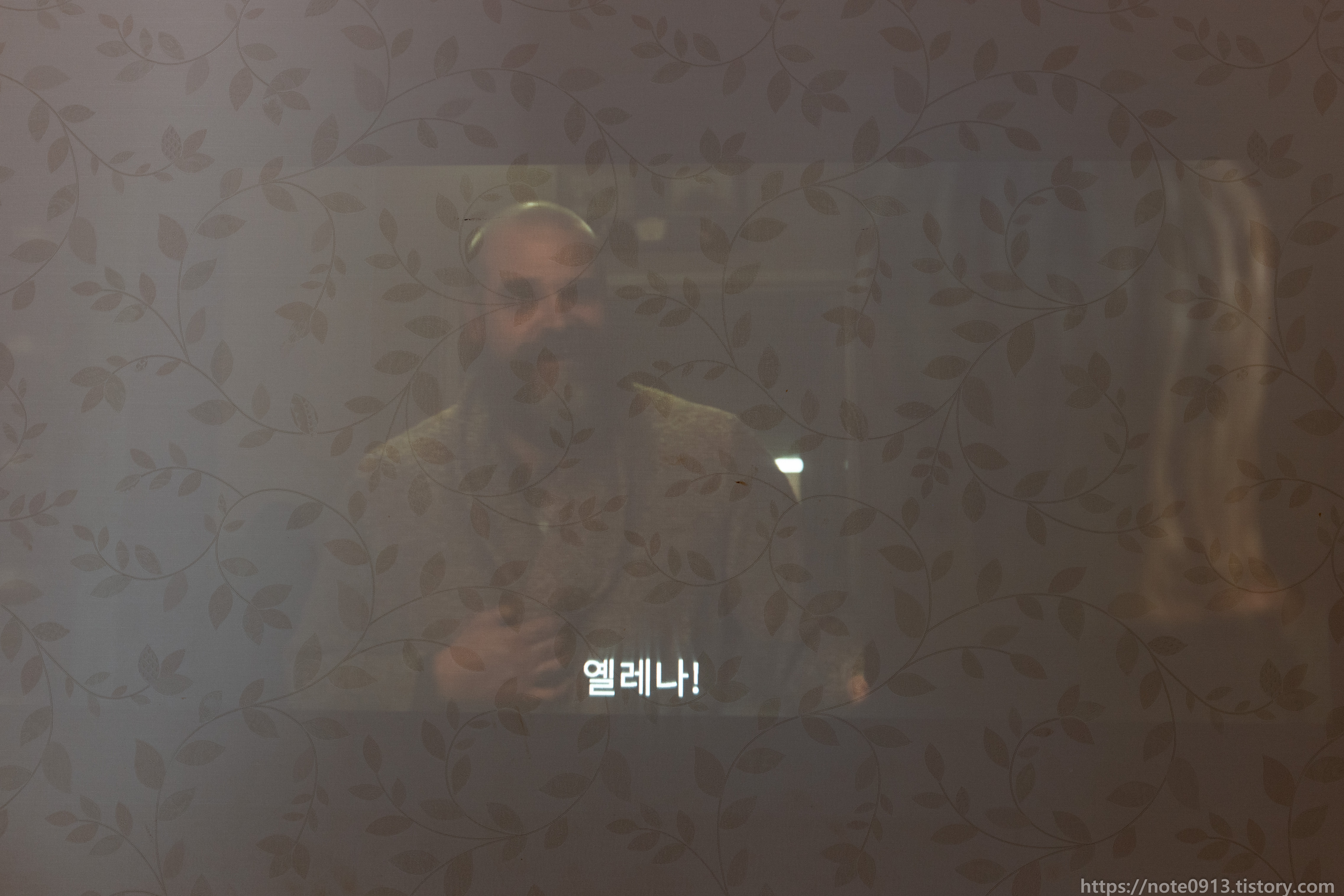 형광등이 켜져있을 때의 프로젝터 화면입니다. 어두운 장면, 검은색은 거의 보이지가 않는 정도입니다. 밝은 장면은 그나마 보이기는 합니다.