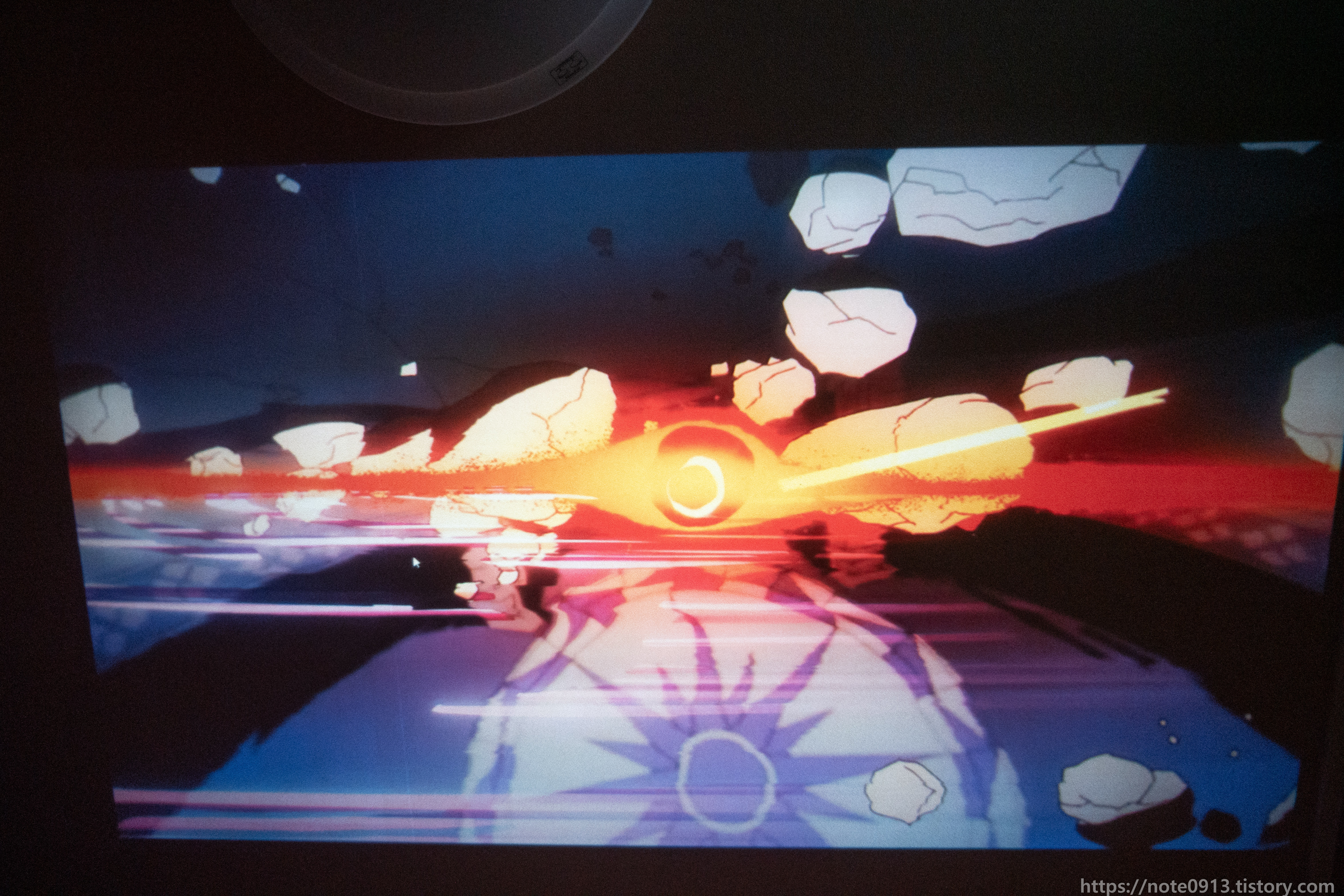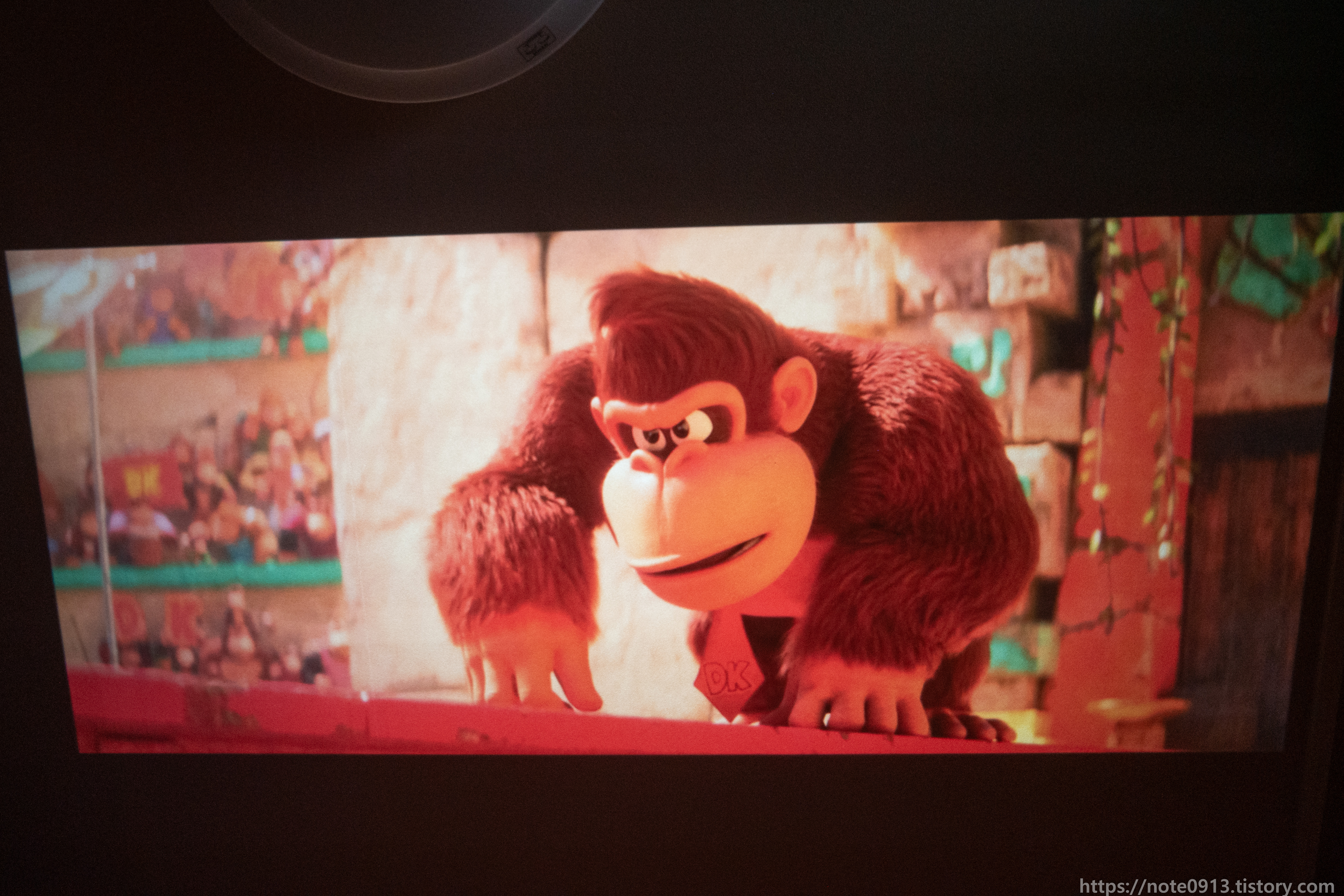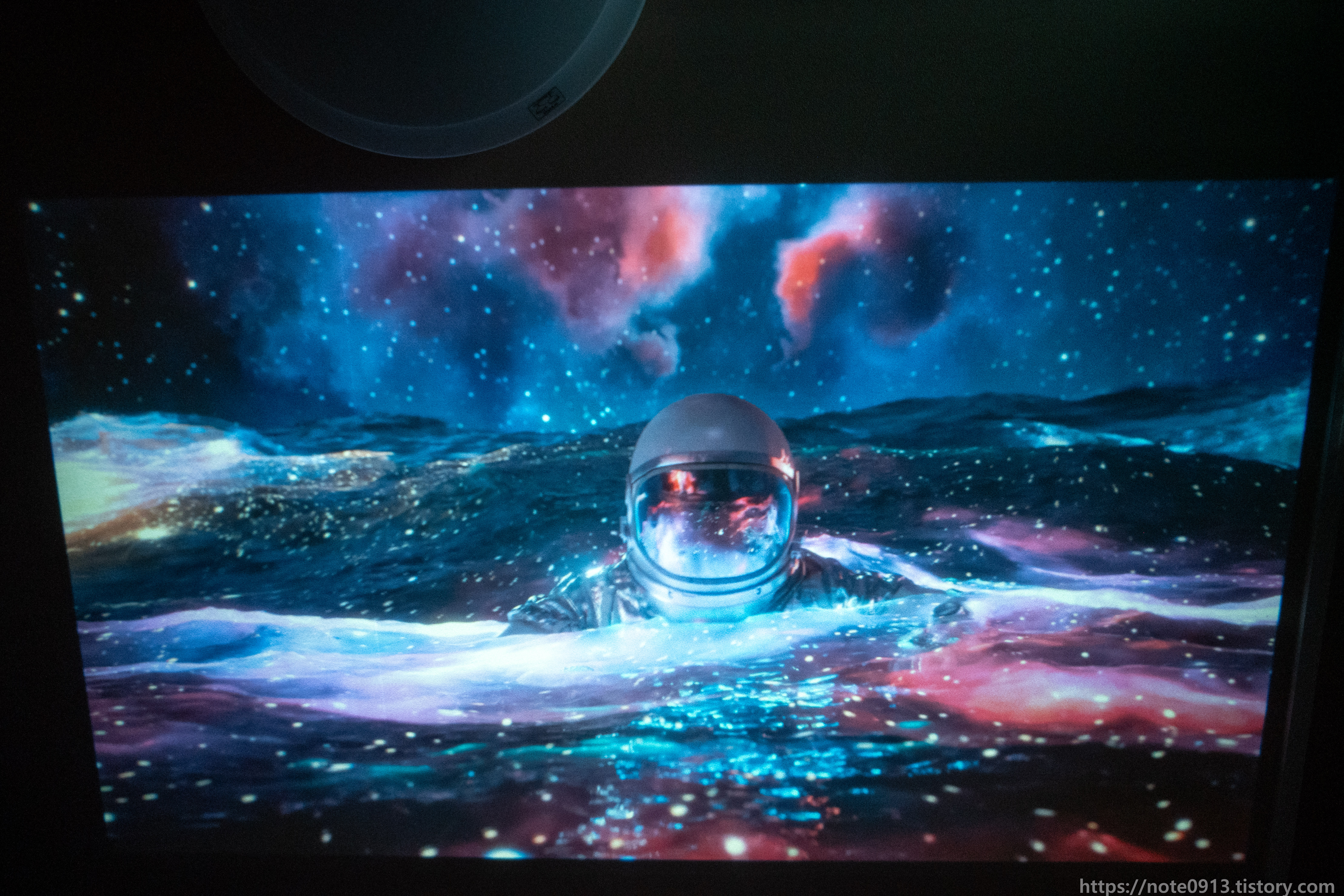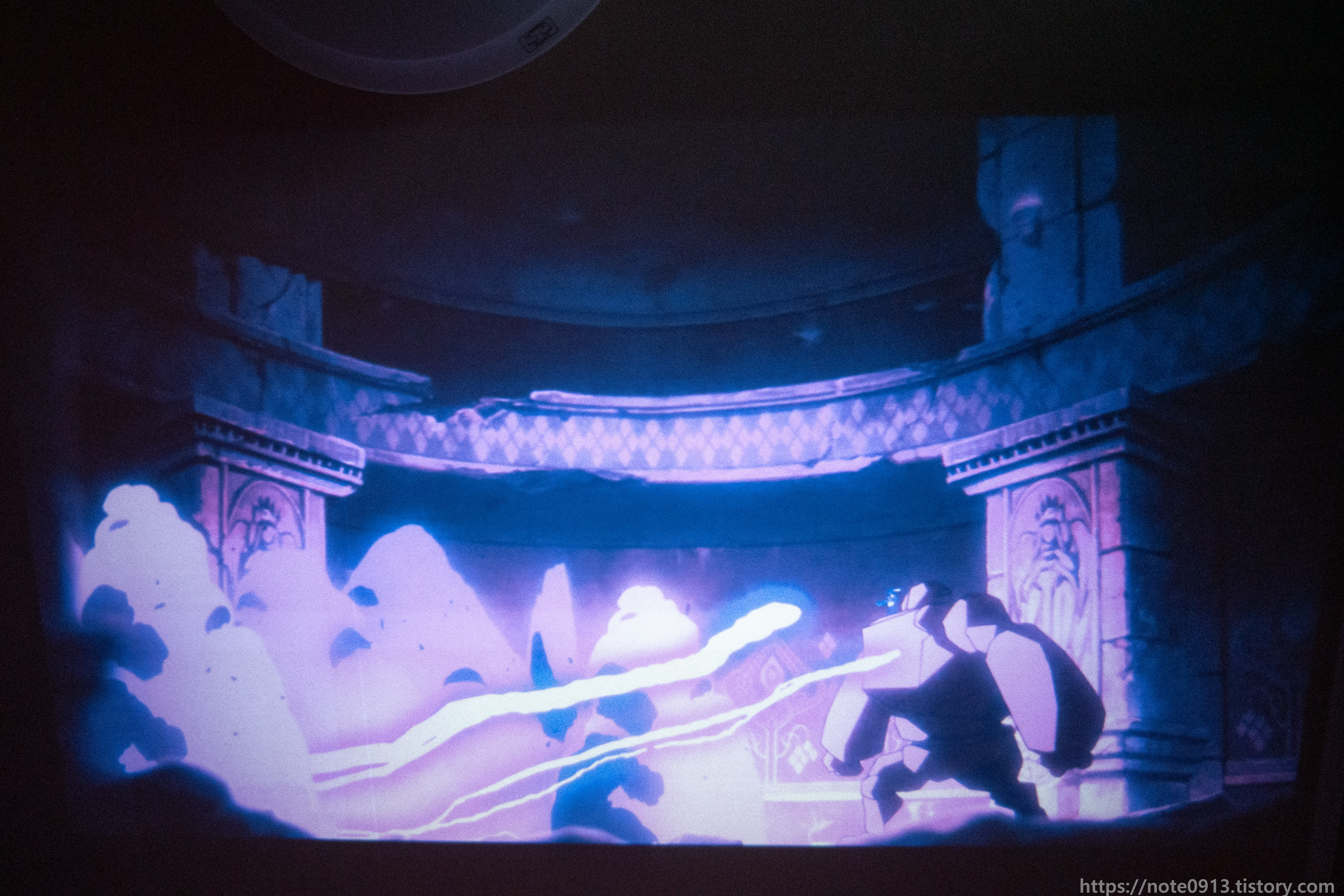 형광등이 켜져있을 때의 프로젝터 화면입니다. 어두운 장면, 검은색은 거의 보이지가 않는 정도입니다. 밝은 장면은 그나마 보이기는 합니다.