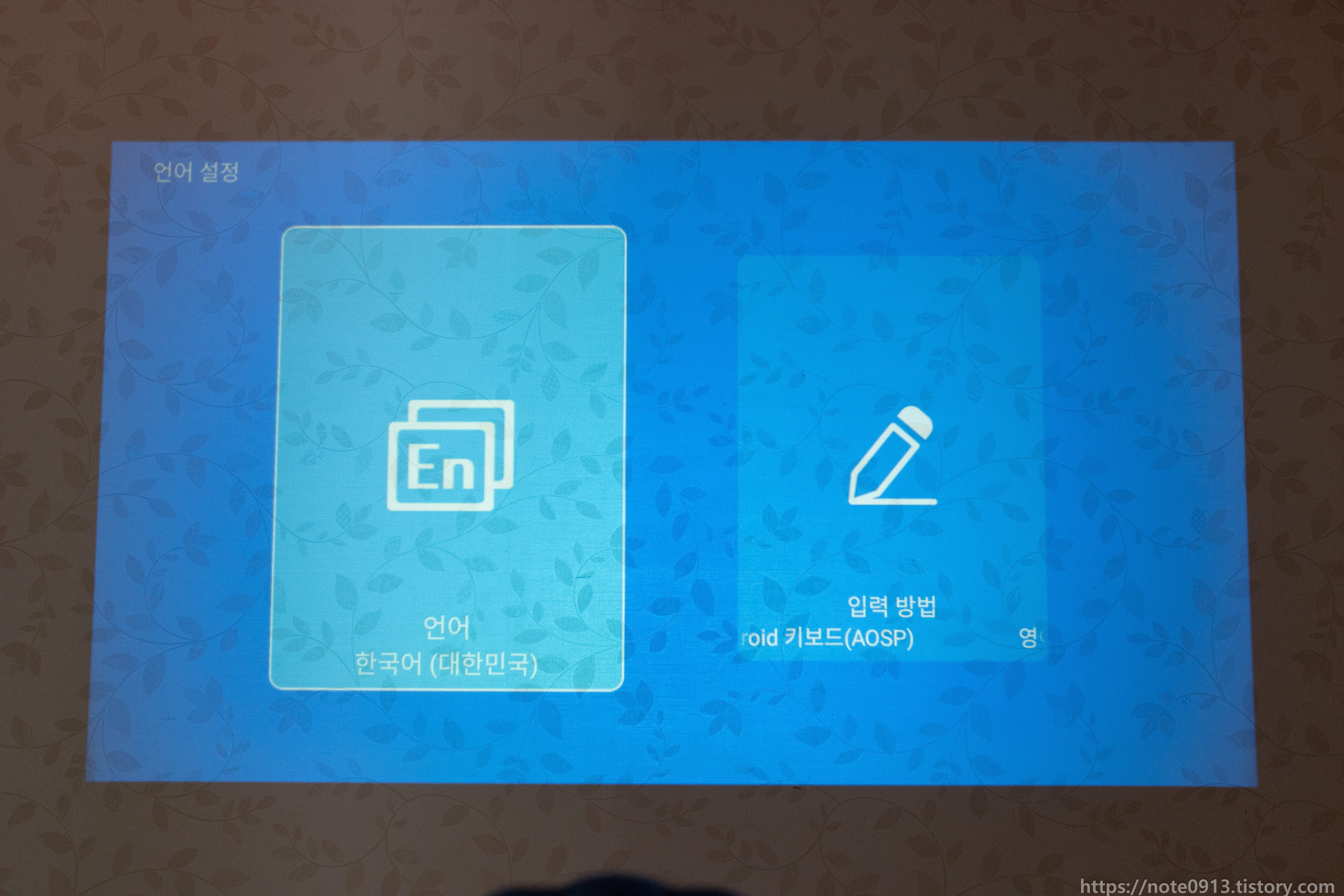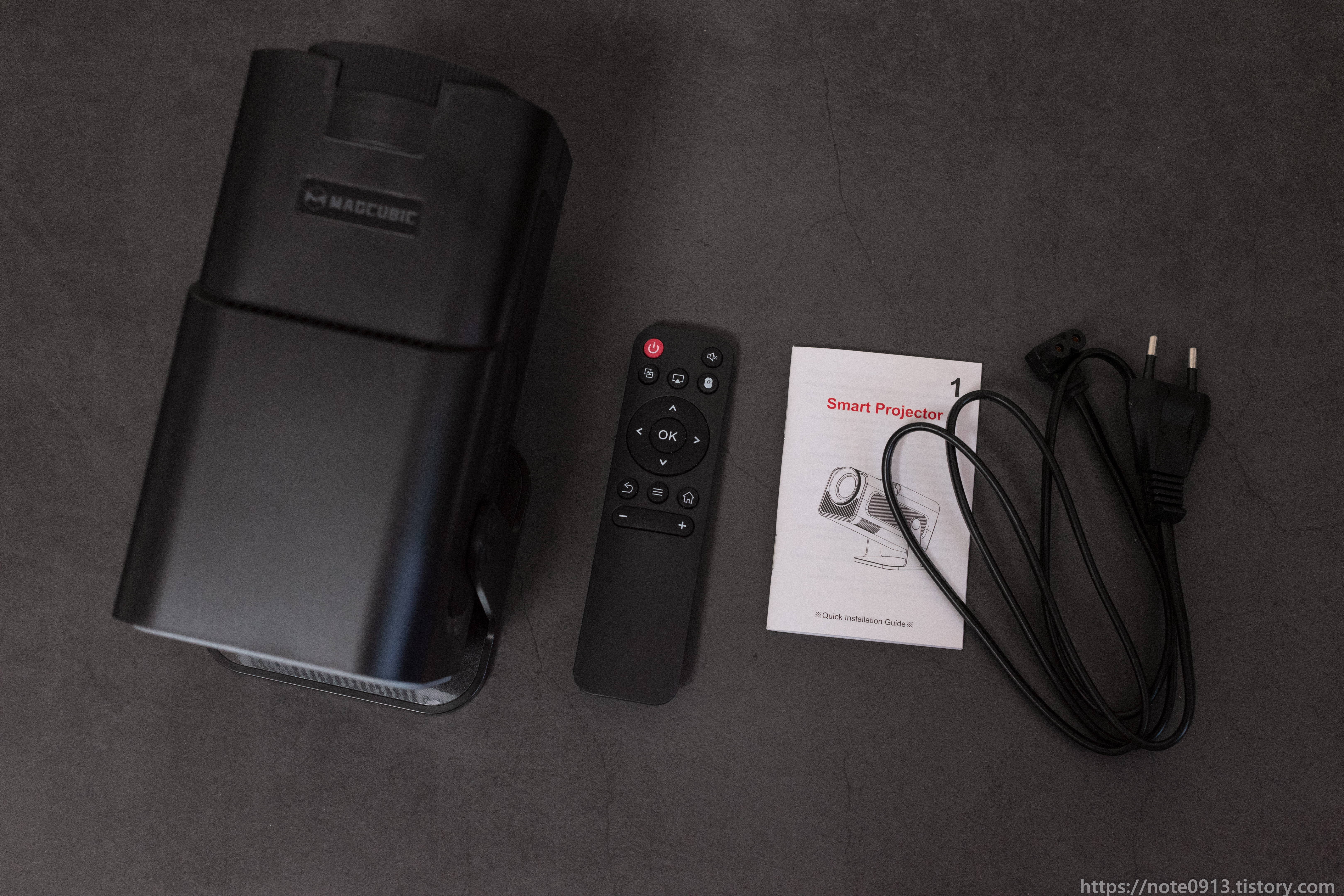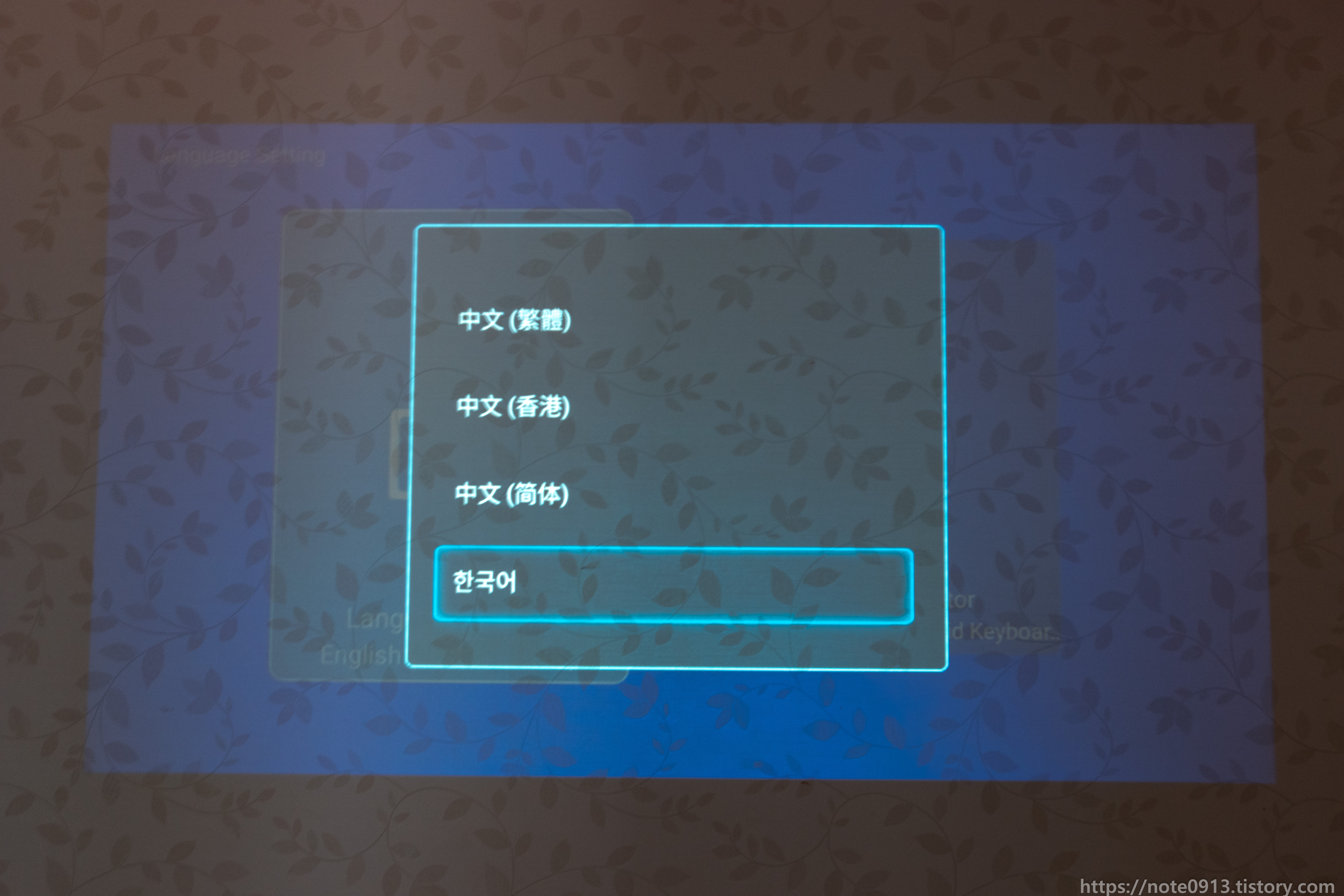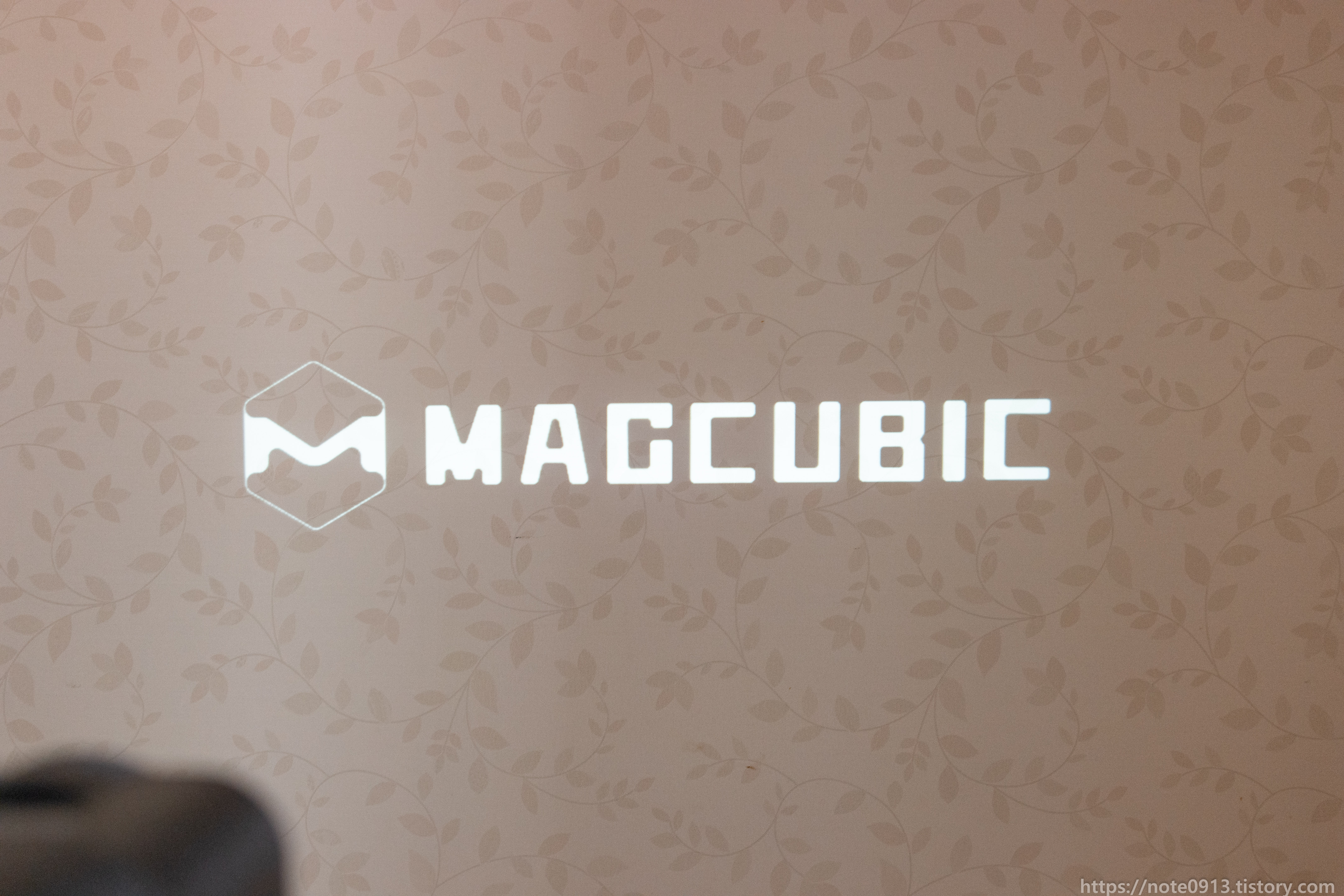 전원 코드 연결하고 전원 버튼을 누르니 MAGCUBIC 로고가 나오면서 부팅이 됩니다. 이 때 당시에 해질이라 방이 창문에서 햇빛이 약간 들어오는 상태였는데 나름 화면이 잘 보이네요.