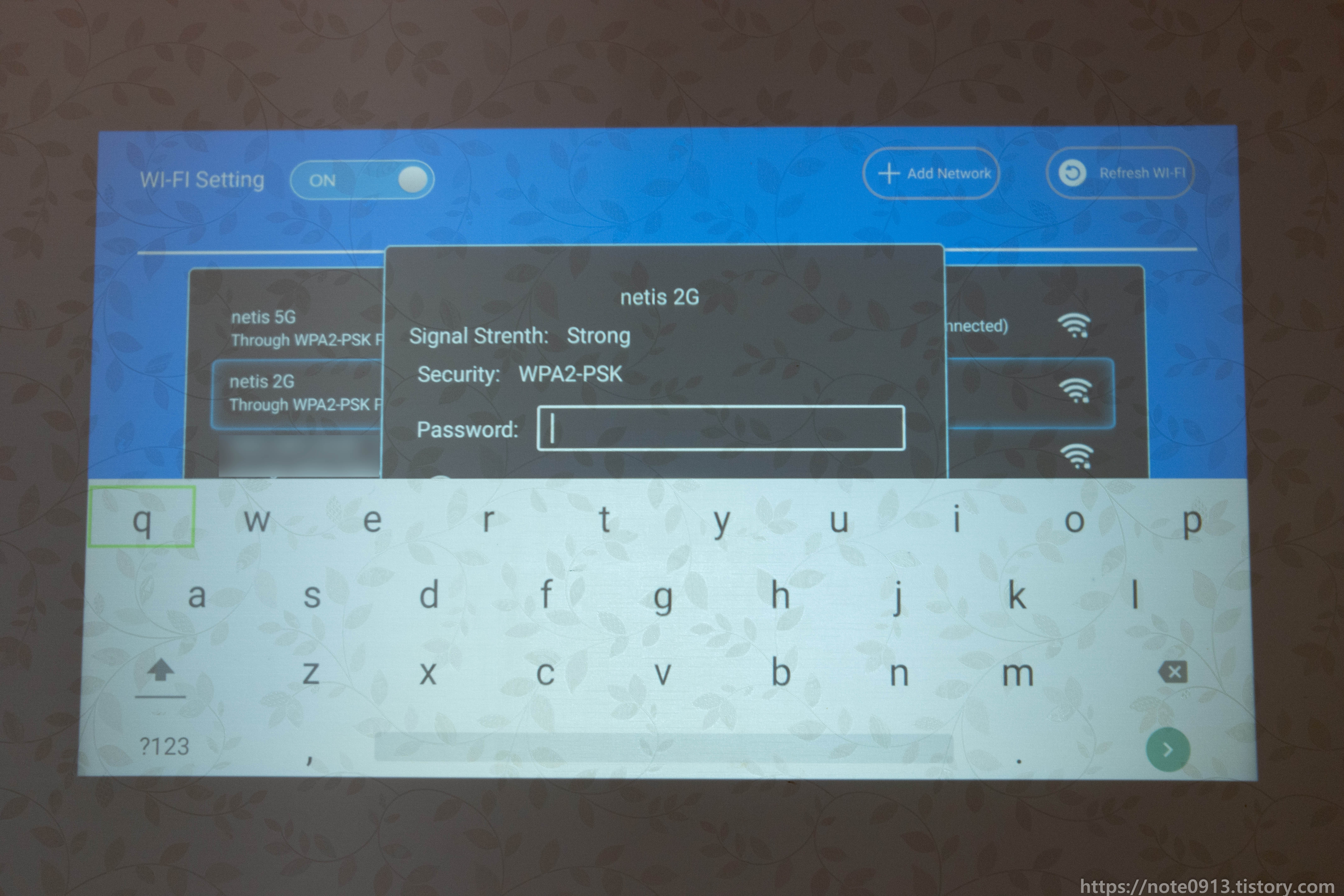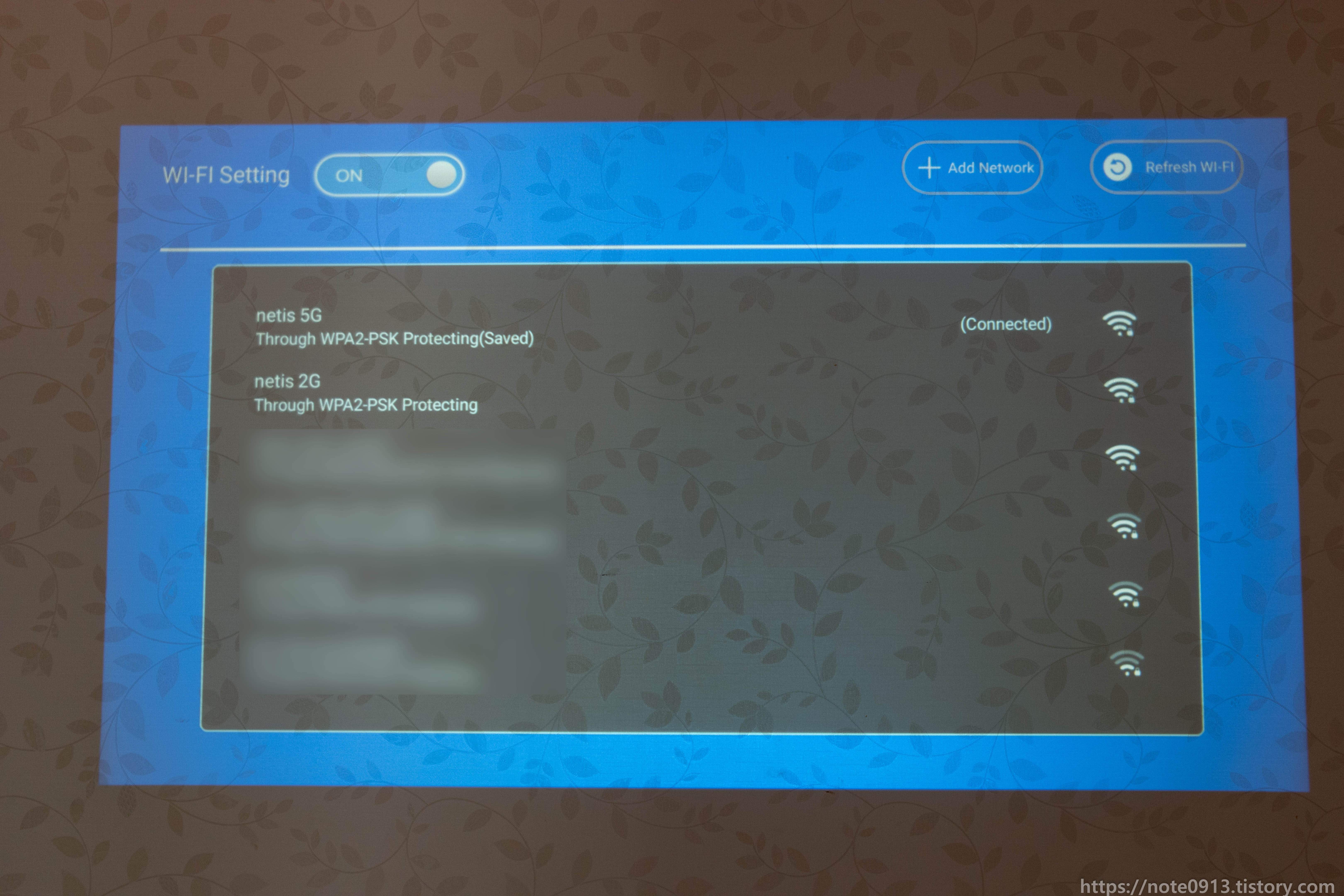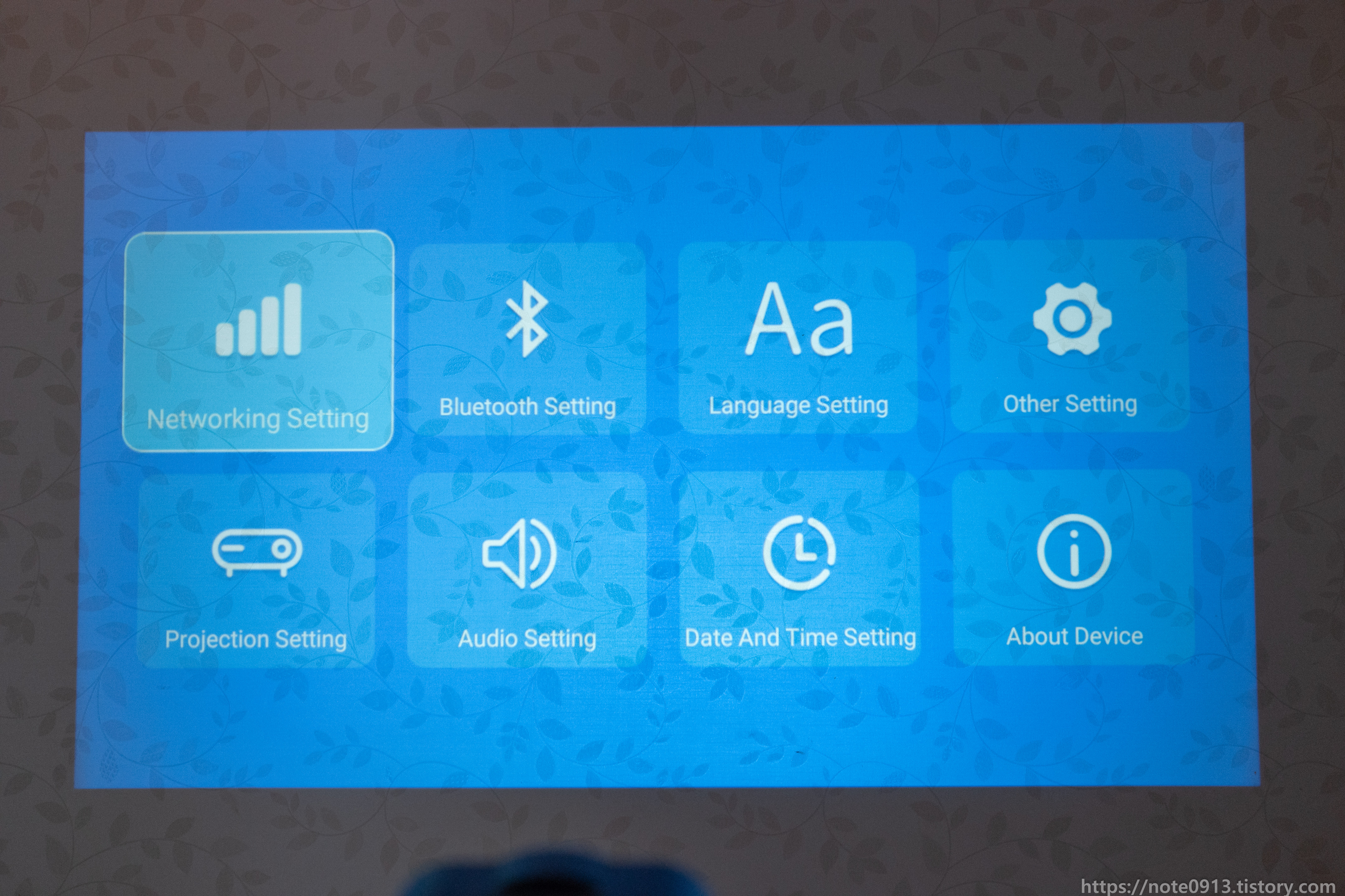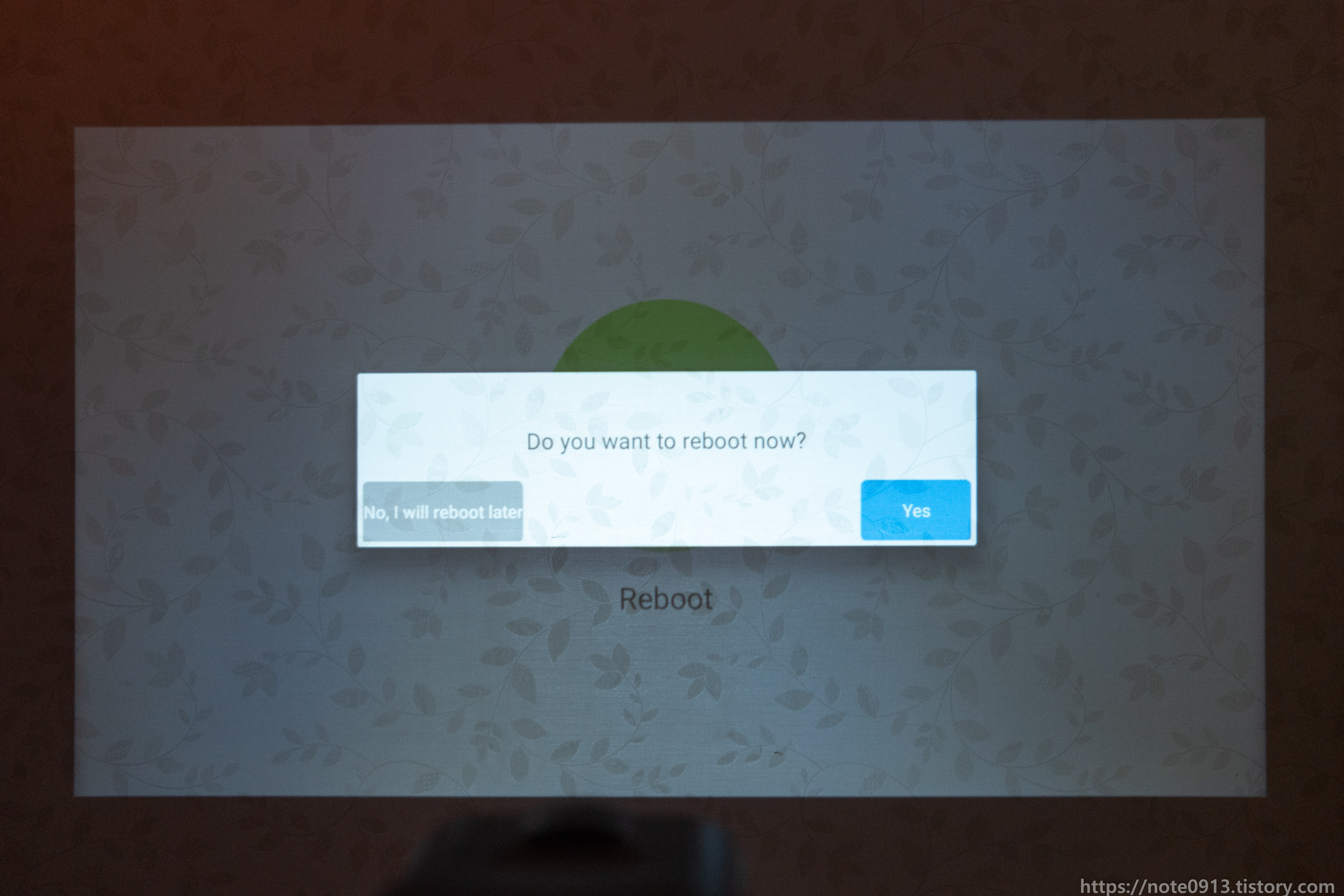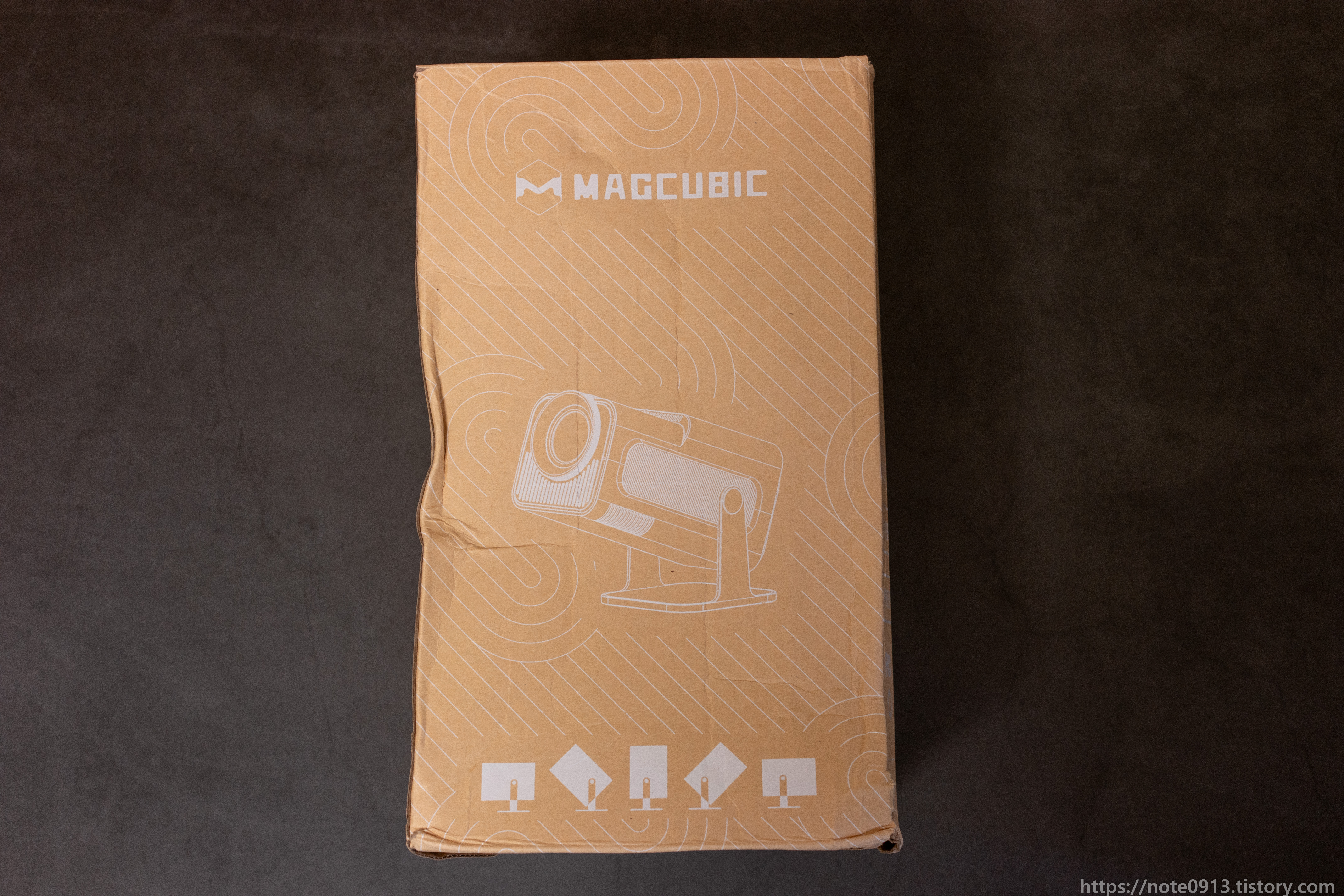 전원 코드 연결하고 전원 버튼을 누르니 MAGCUBIC 로고가 나오면서 부팅이 됩니다. 이 때 당시에 해질이라 방이 창문에서 햇빛이 약간 들어오는 상태였는데 나름 화면이 잘 보이네요.