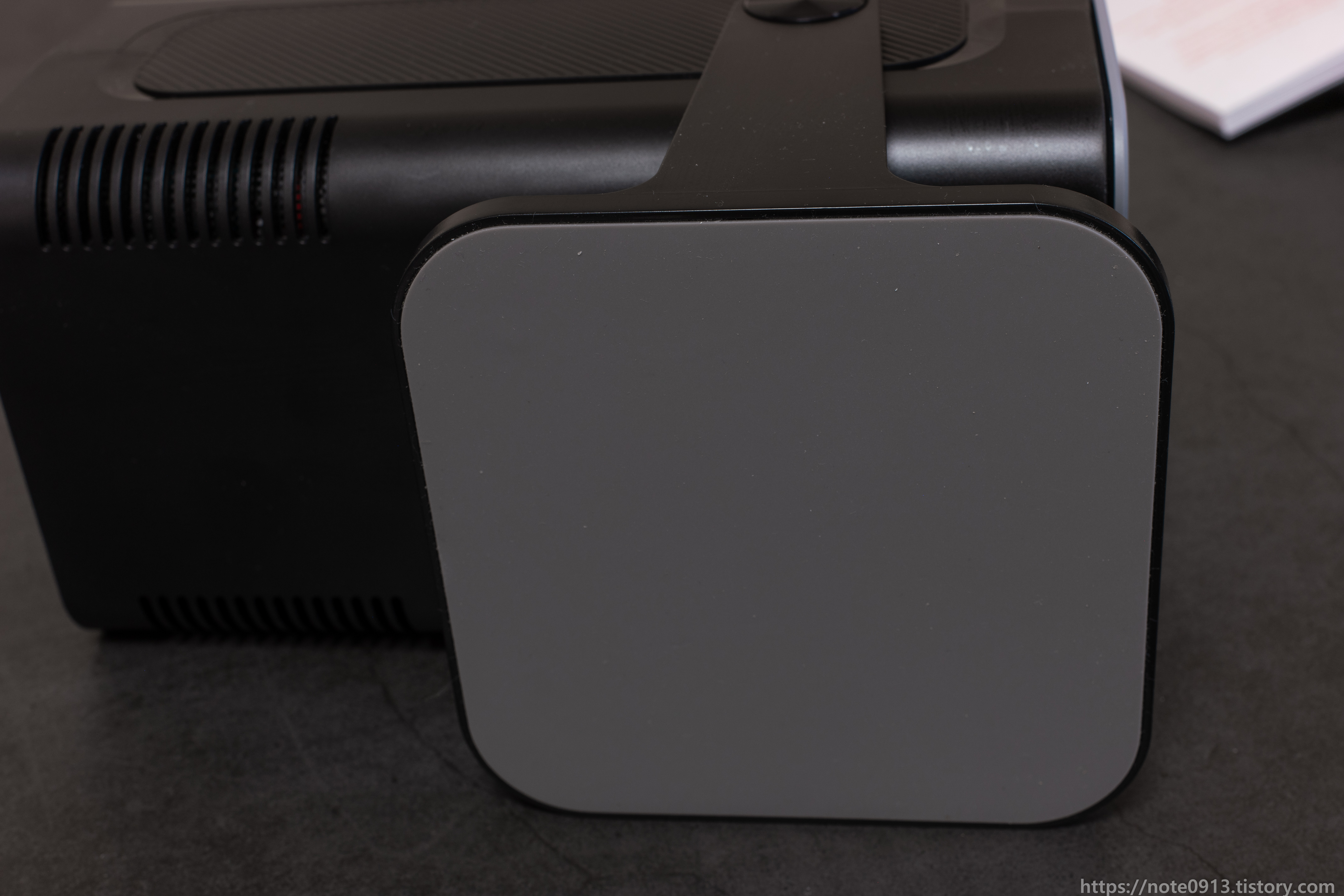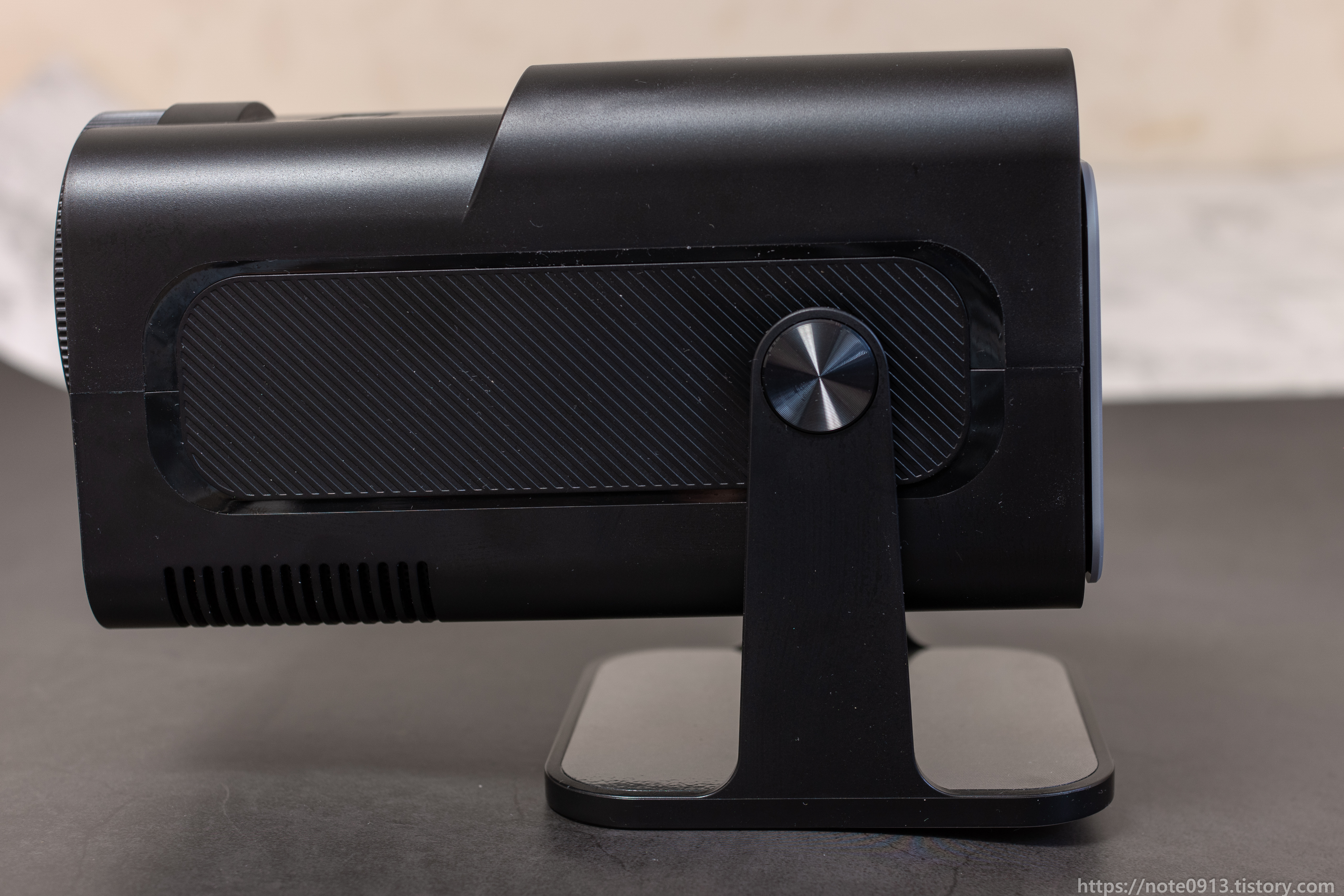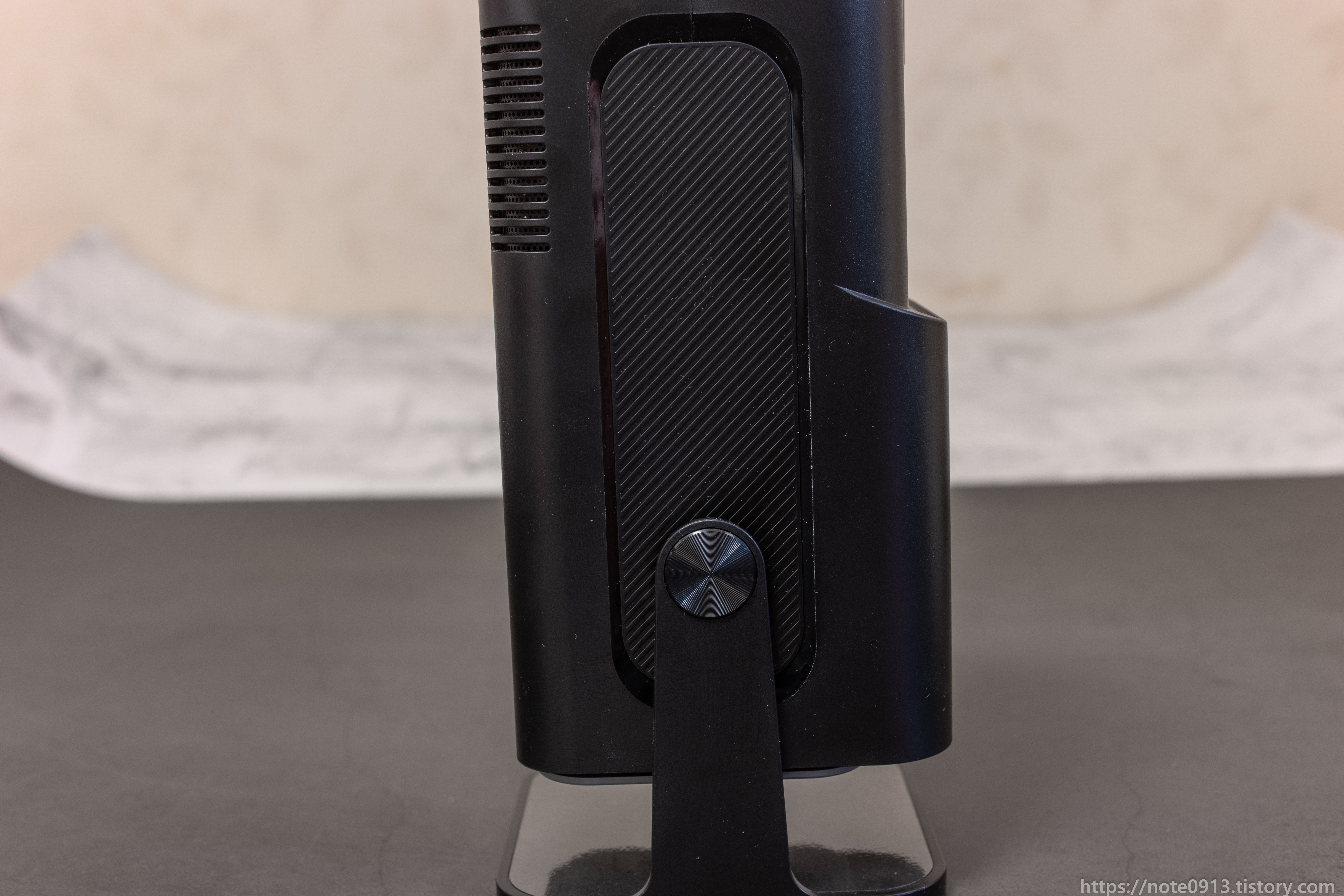 아래쪽에는 실리콘 재질의 미끄럼 방지 패드가 넓게 붙어 있습니다. HY320은 아쉽게도 삼각대에 연결해서 사용할 수 없어서 별도의 악세사리를 구입하거나 트레이에 올려서 사용해야 합니다.