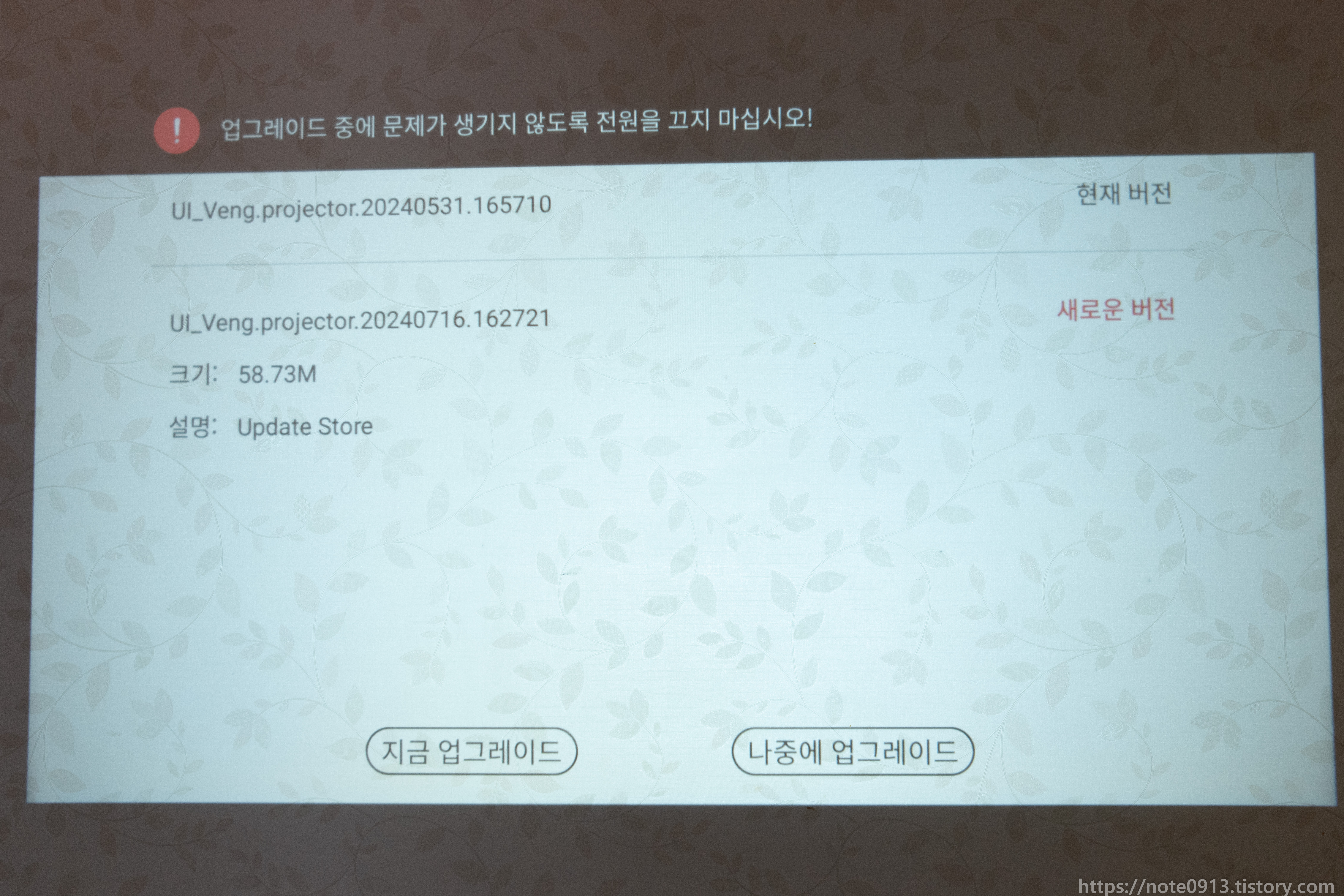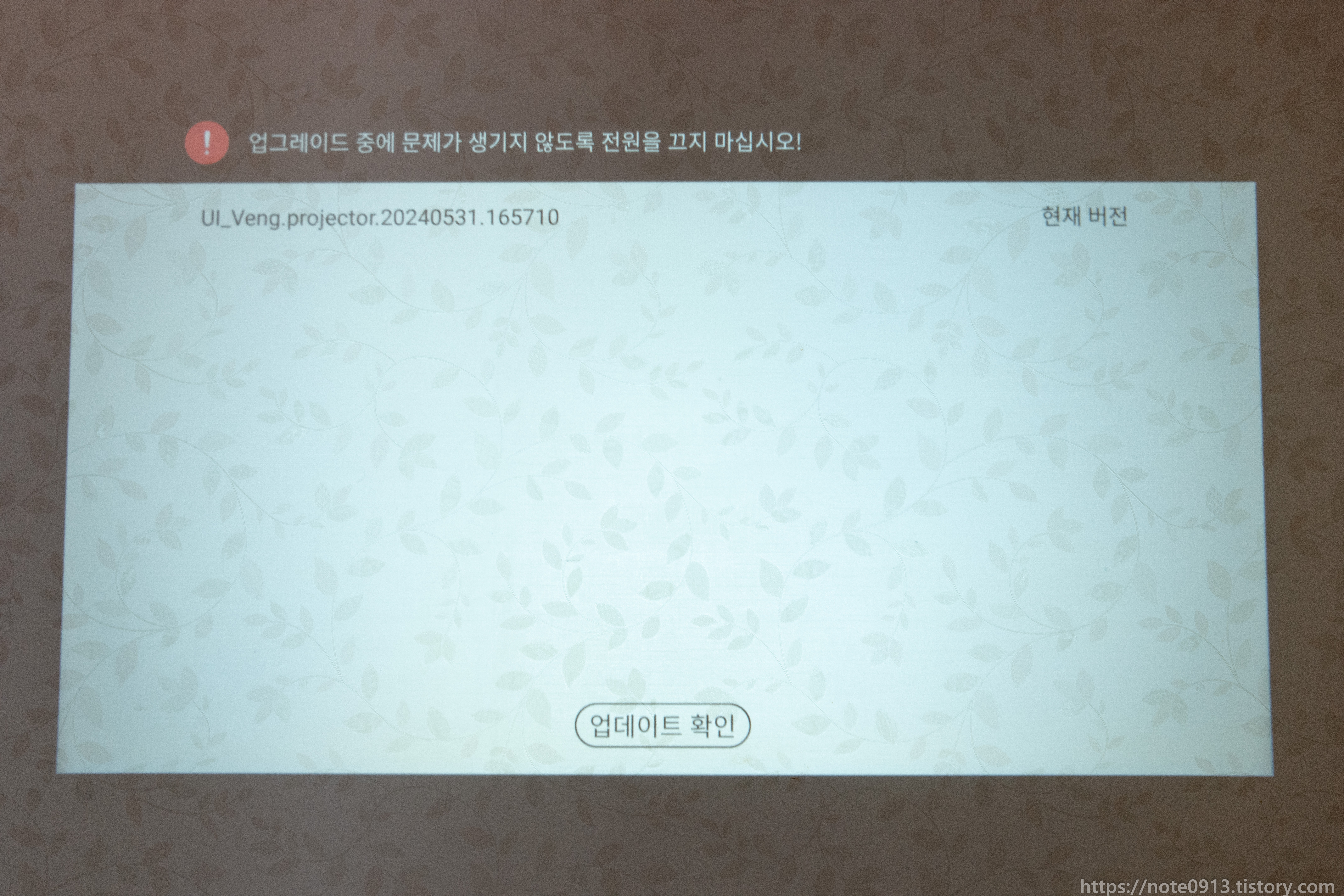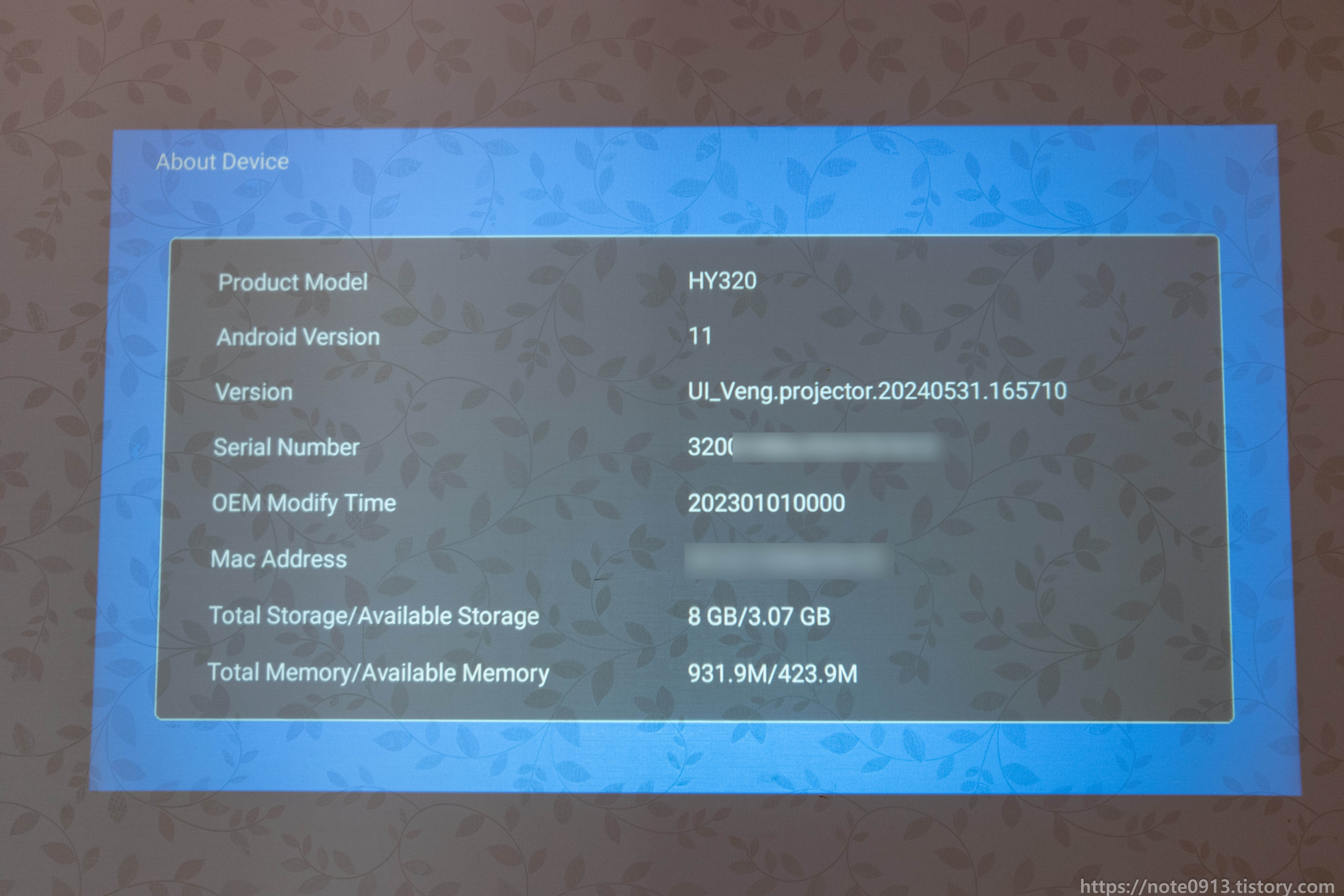 기기정보를 보면 안드로이드 버전은 11, 램은 1GB, 롬은 8GB입니다. 펌웨어 버전은 UI_Veng.projector.20240531.165710 이네요. 보니까 5월달 펌웨어인 것 같네요.