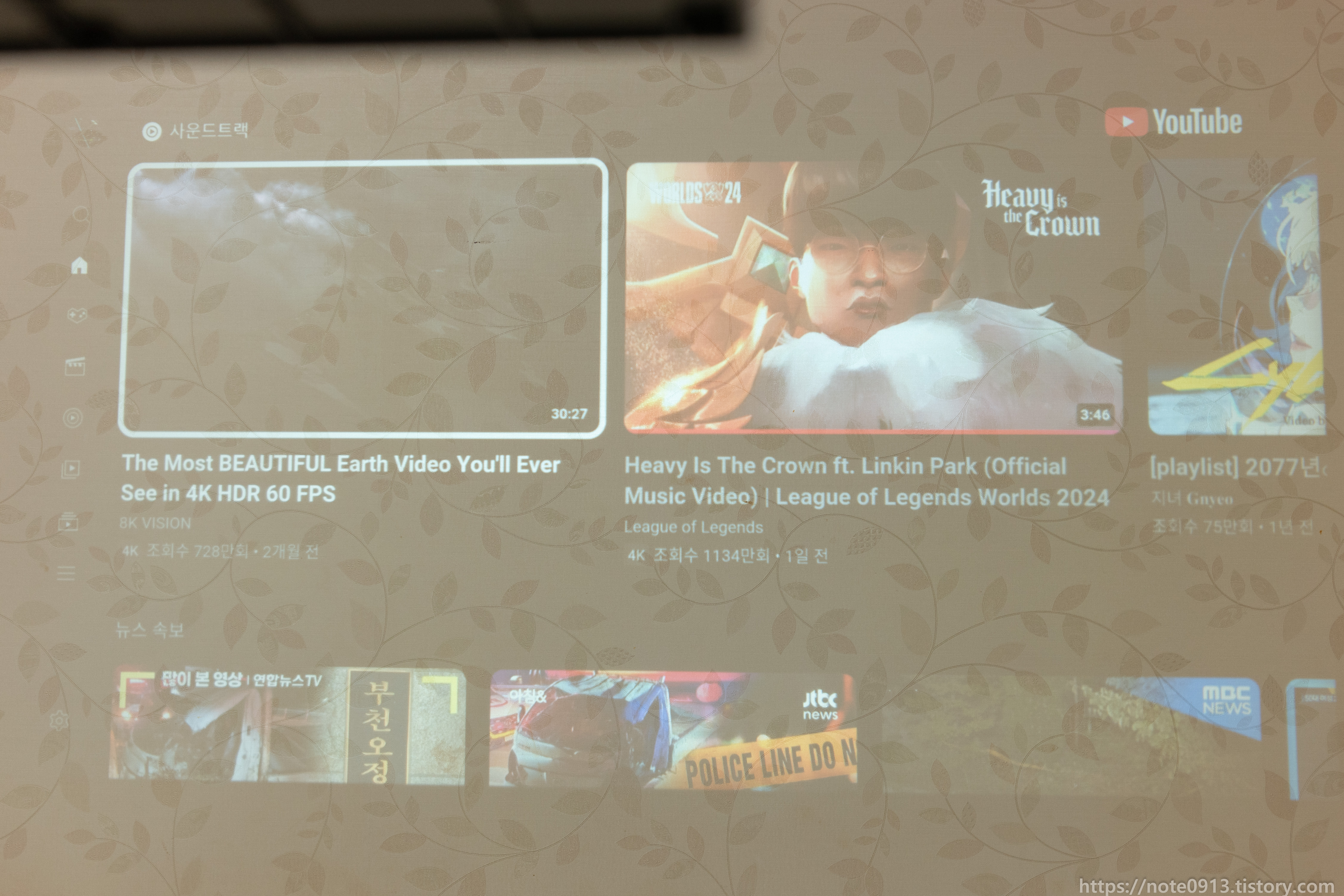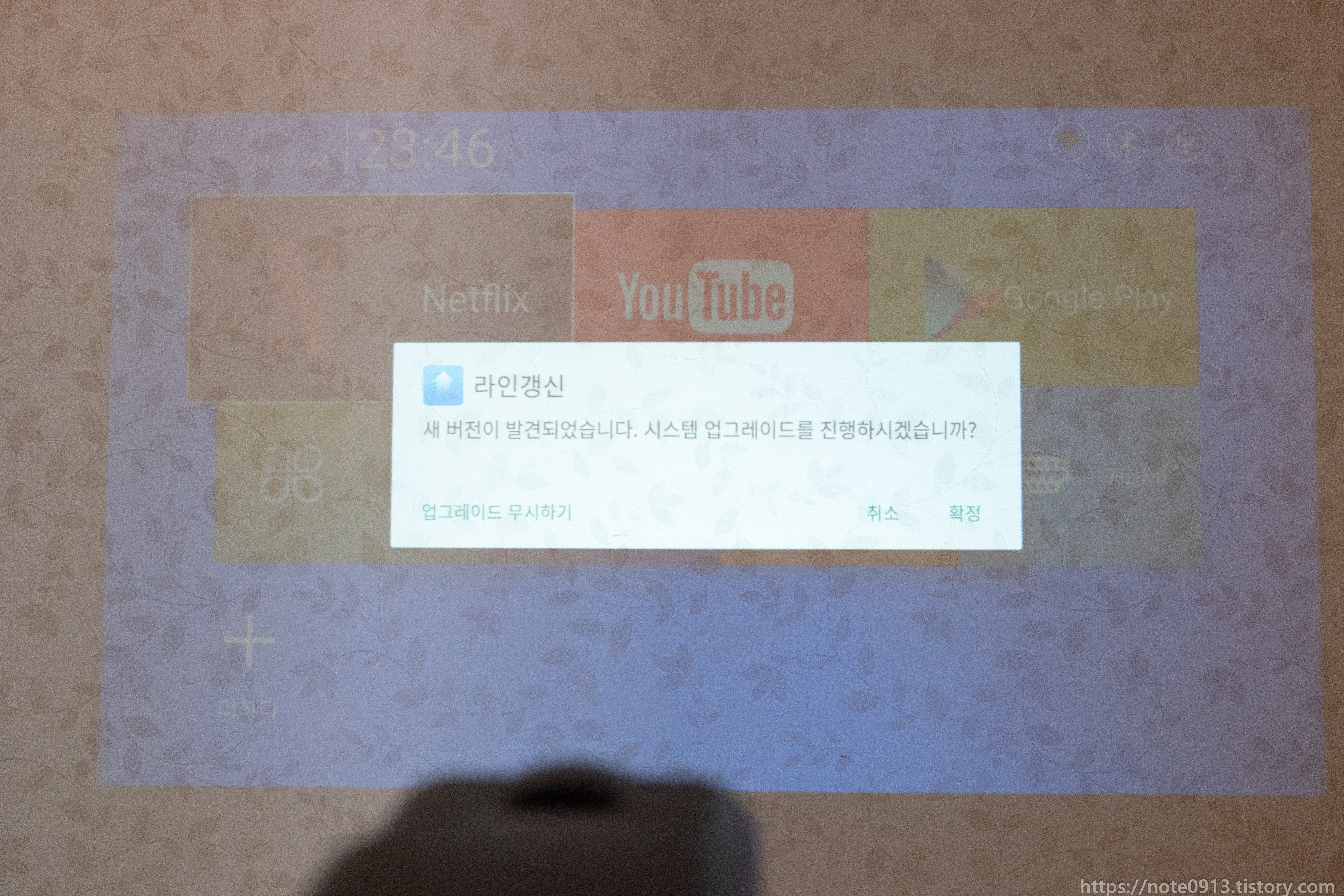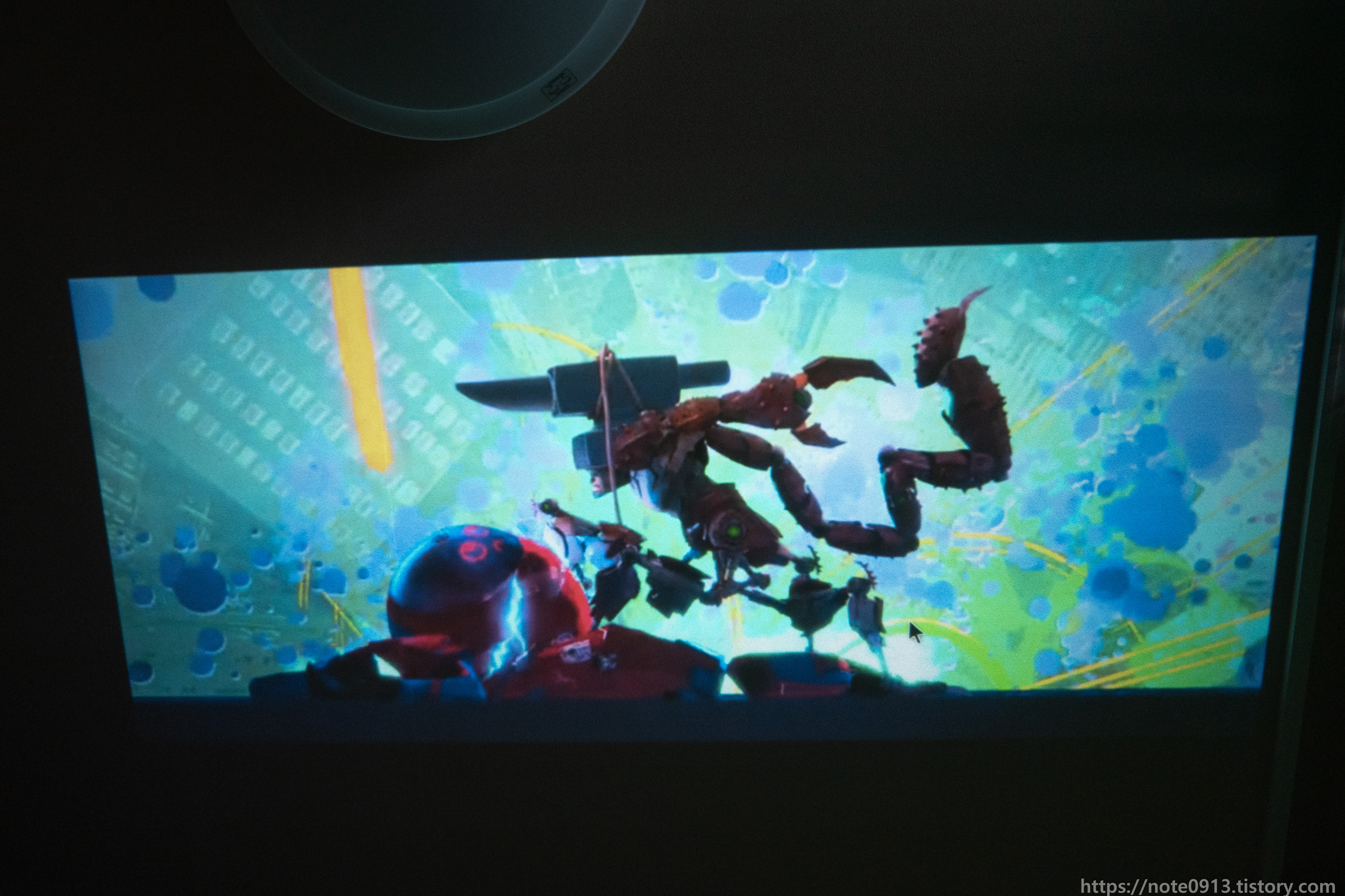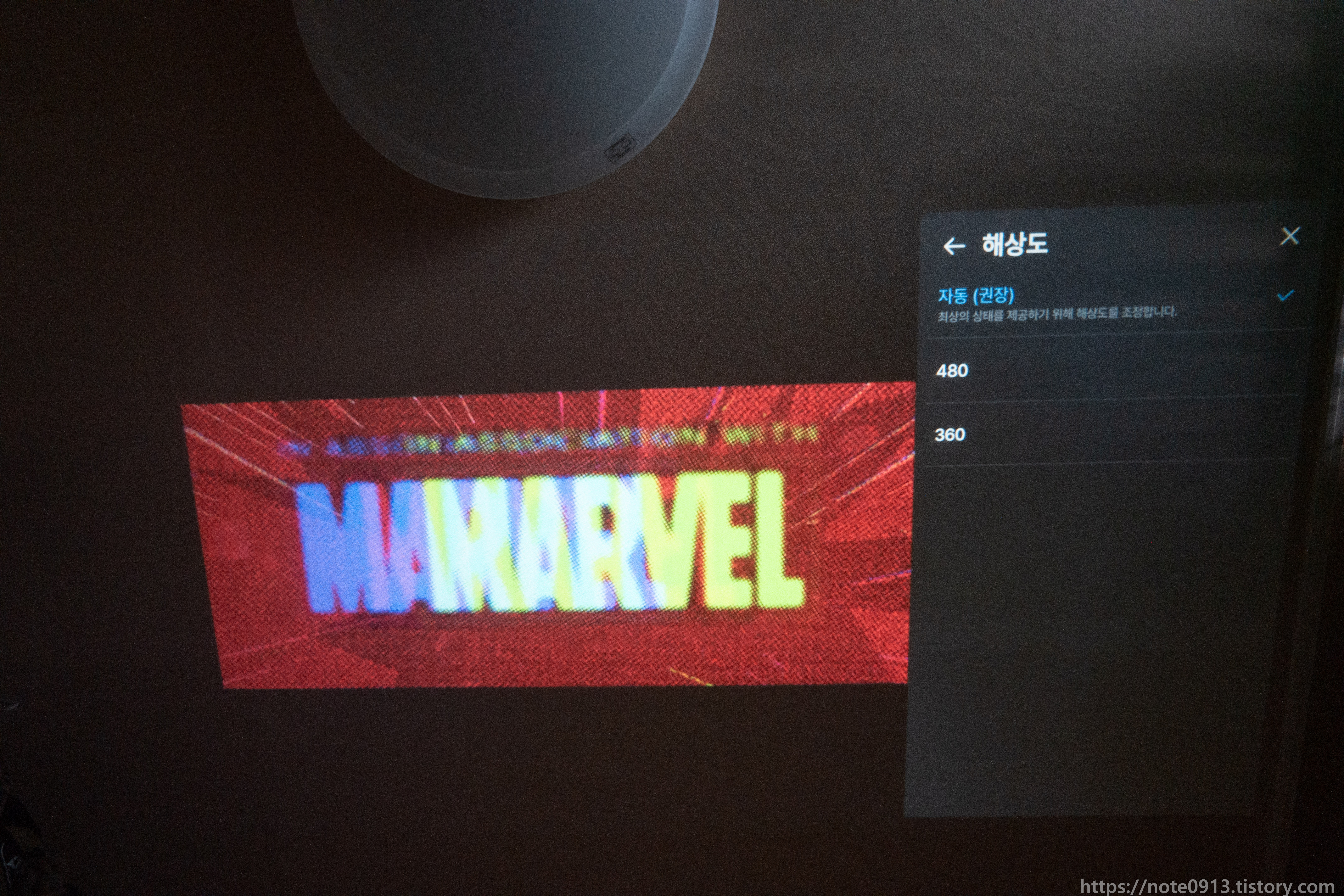 HY320의 진가는 바로 천장에 쏴서 보는거죠. 벽에는 벽지에 무늬가 있어서 보기 불편해서 무늬가 없는 천장에 쏴보았습니다.