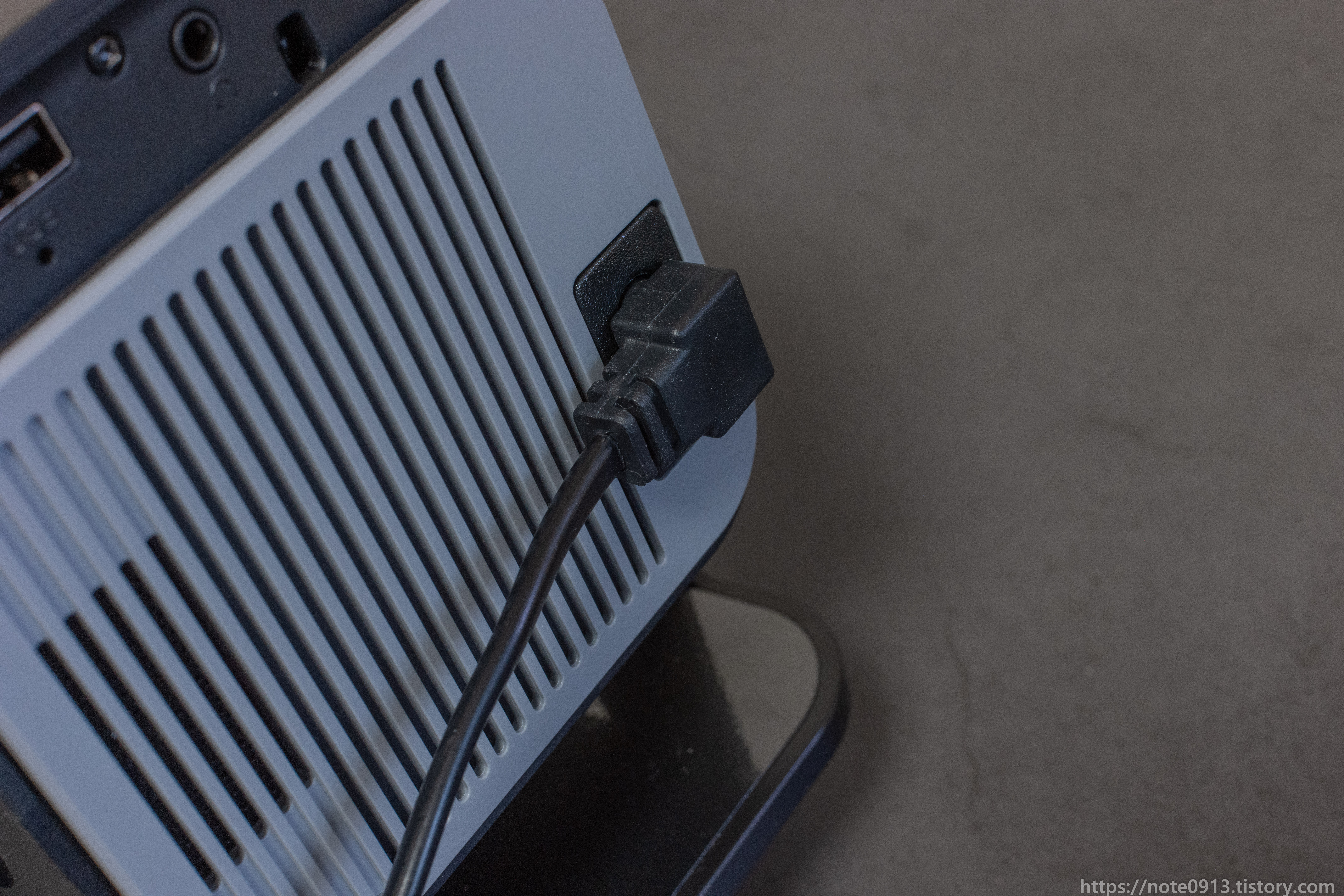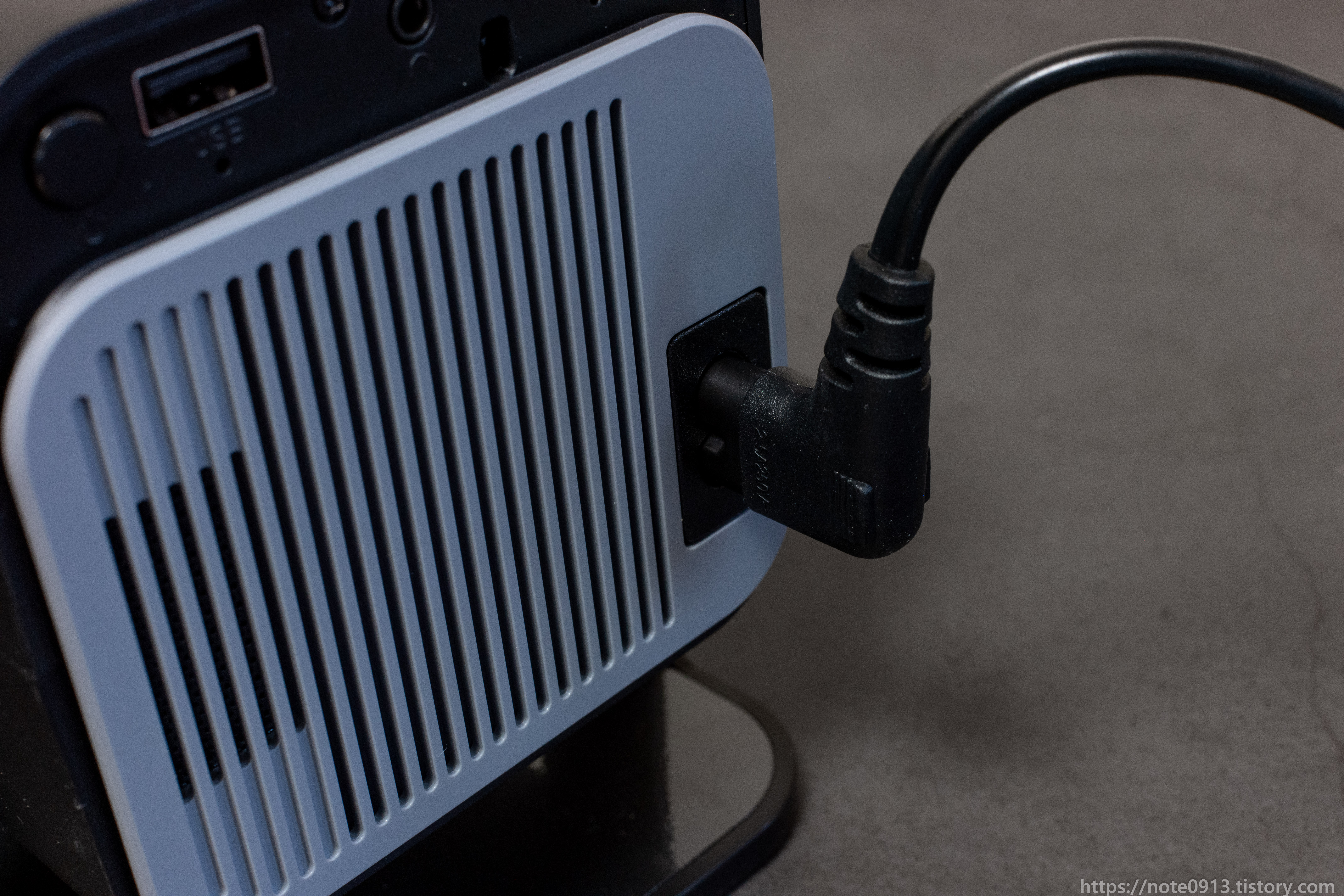 전원 케이블은 좌우 방향상관없이 연결할 수 있으나, 위 사진처럼 배기구 쪽을 지나서 연결해야지만 HY320을 수직으로 세울 수 있습니다.