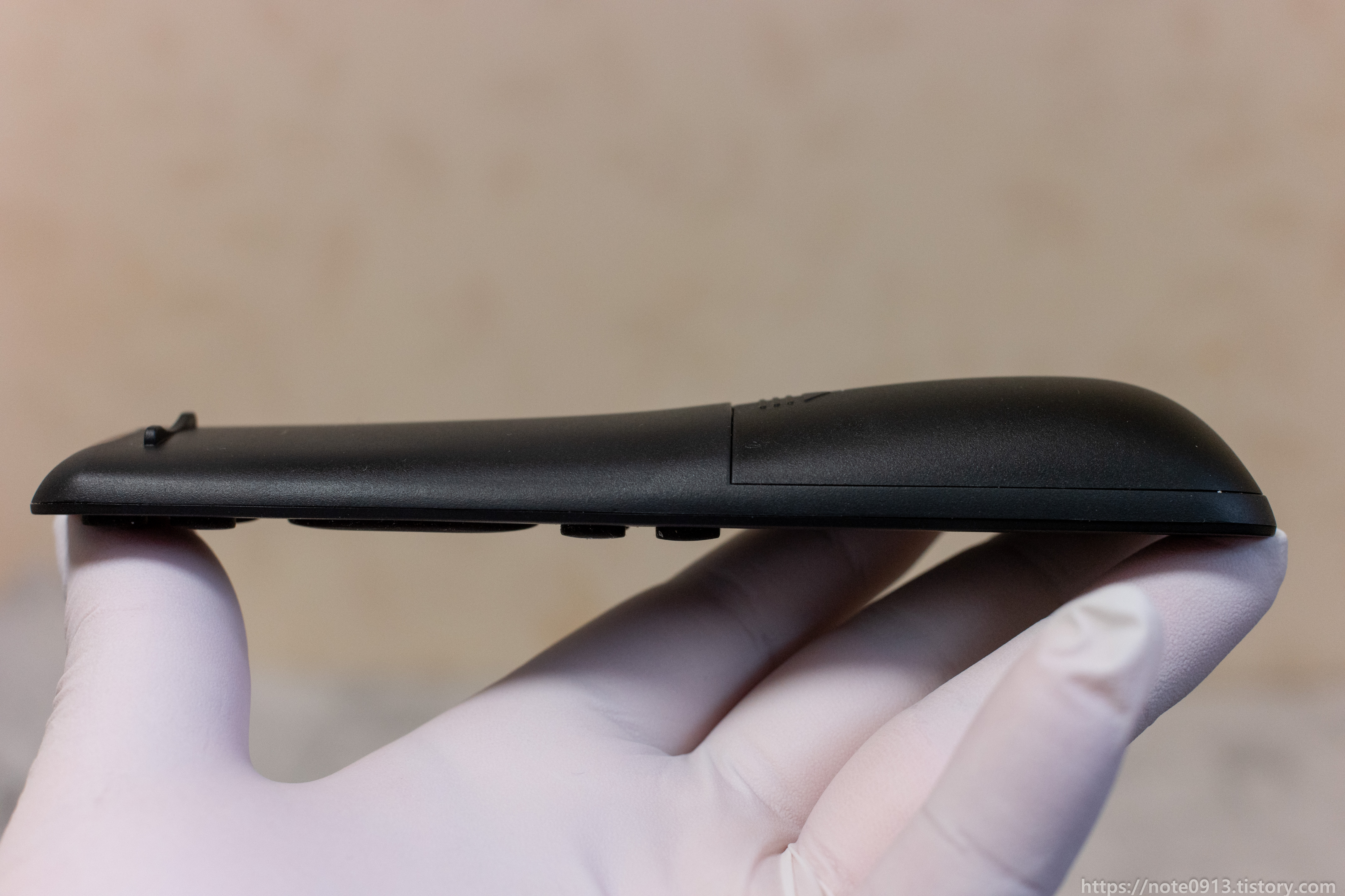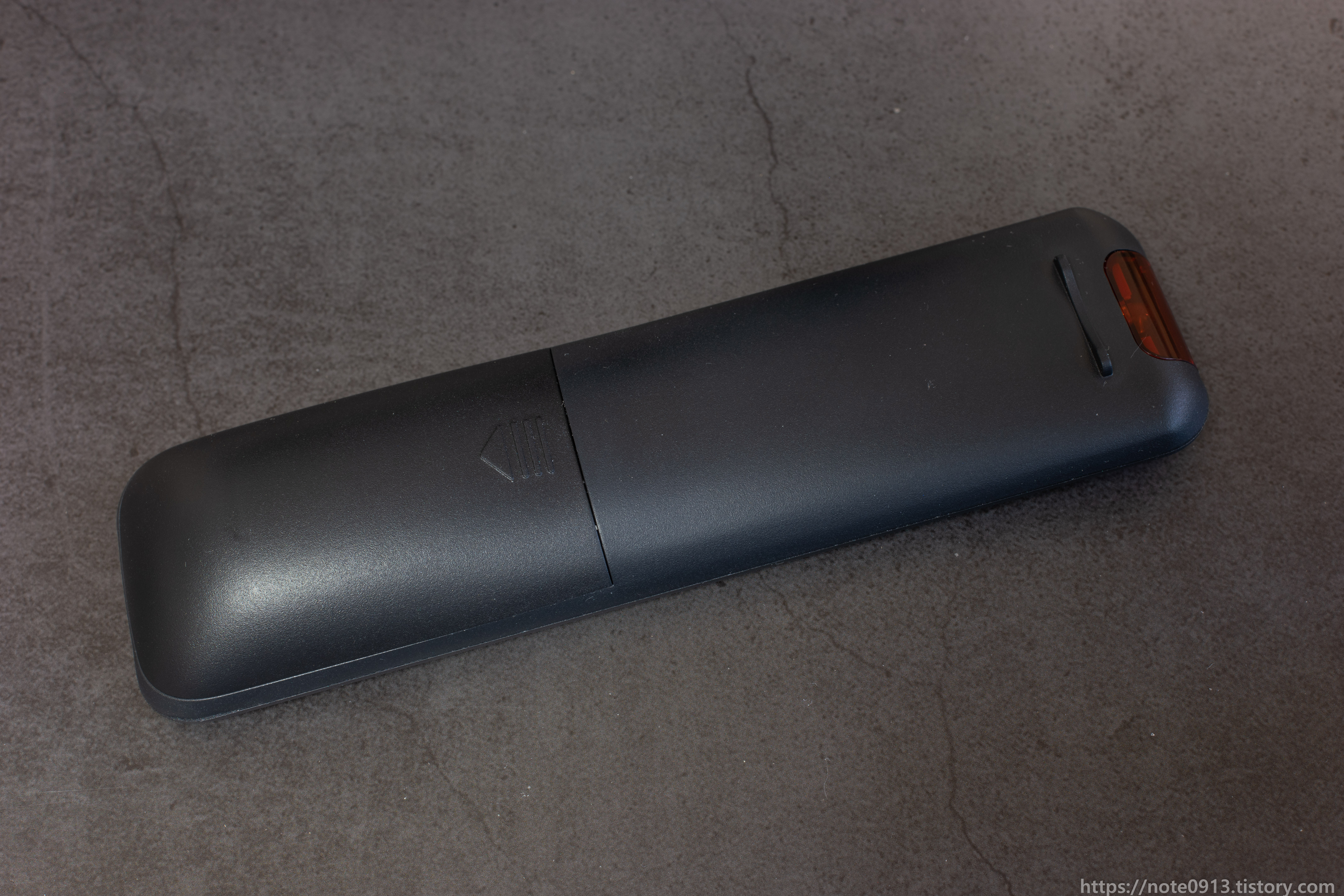 리모컨 뒤쪽으로 갈수록 두꺼워지는 형태라 그립감은 나쁘지 않습니다.