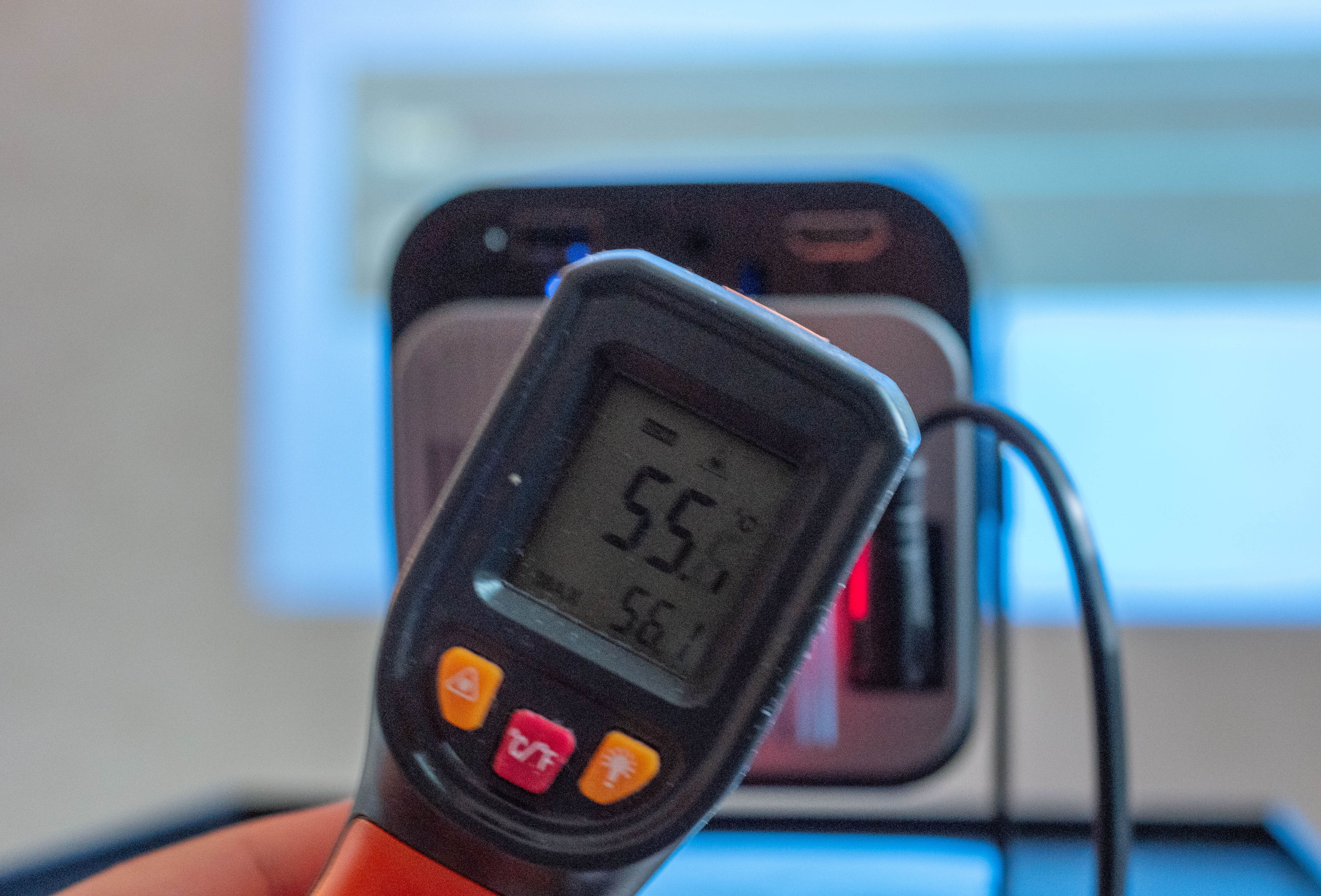 HY320 온도를 측정해 보았습니다. 배기구 쪽 온도를 측정해보니 55.6℃ 로 측정됩니다.