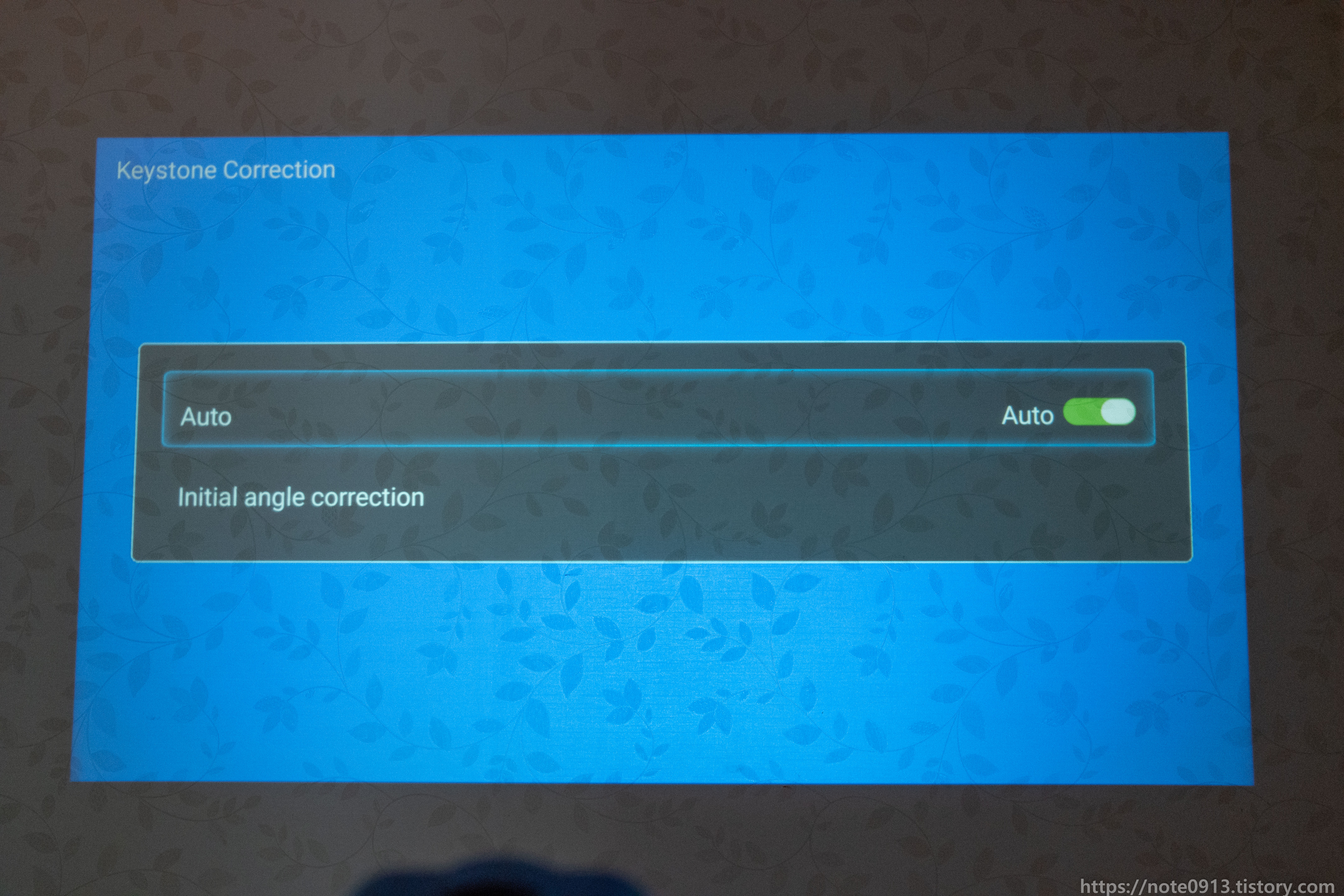 키스톤 설정화면입니다. 키스톤 설정을 자동으로 할 수도 있고 수동으로도 할 수 있습니다. 또한 키스톤 보정 메뉴도 있습니다. 참고로 한국어로는 번역이 이상하게 되어있습니다. Auto가 자동시간으로 번역되어 있는데 이걸 켜야 자동으로 키스톤 보정이 됩니다.