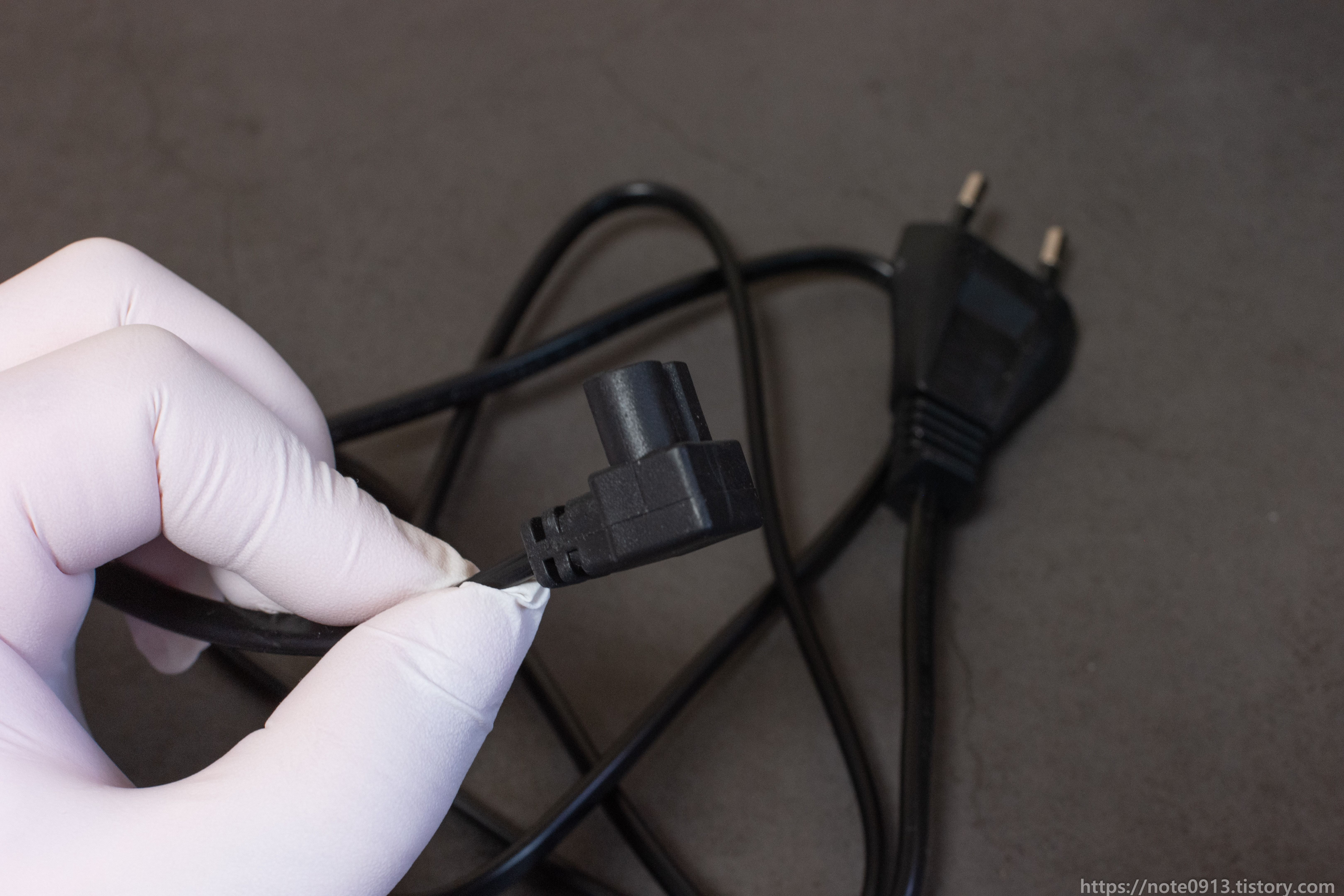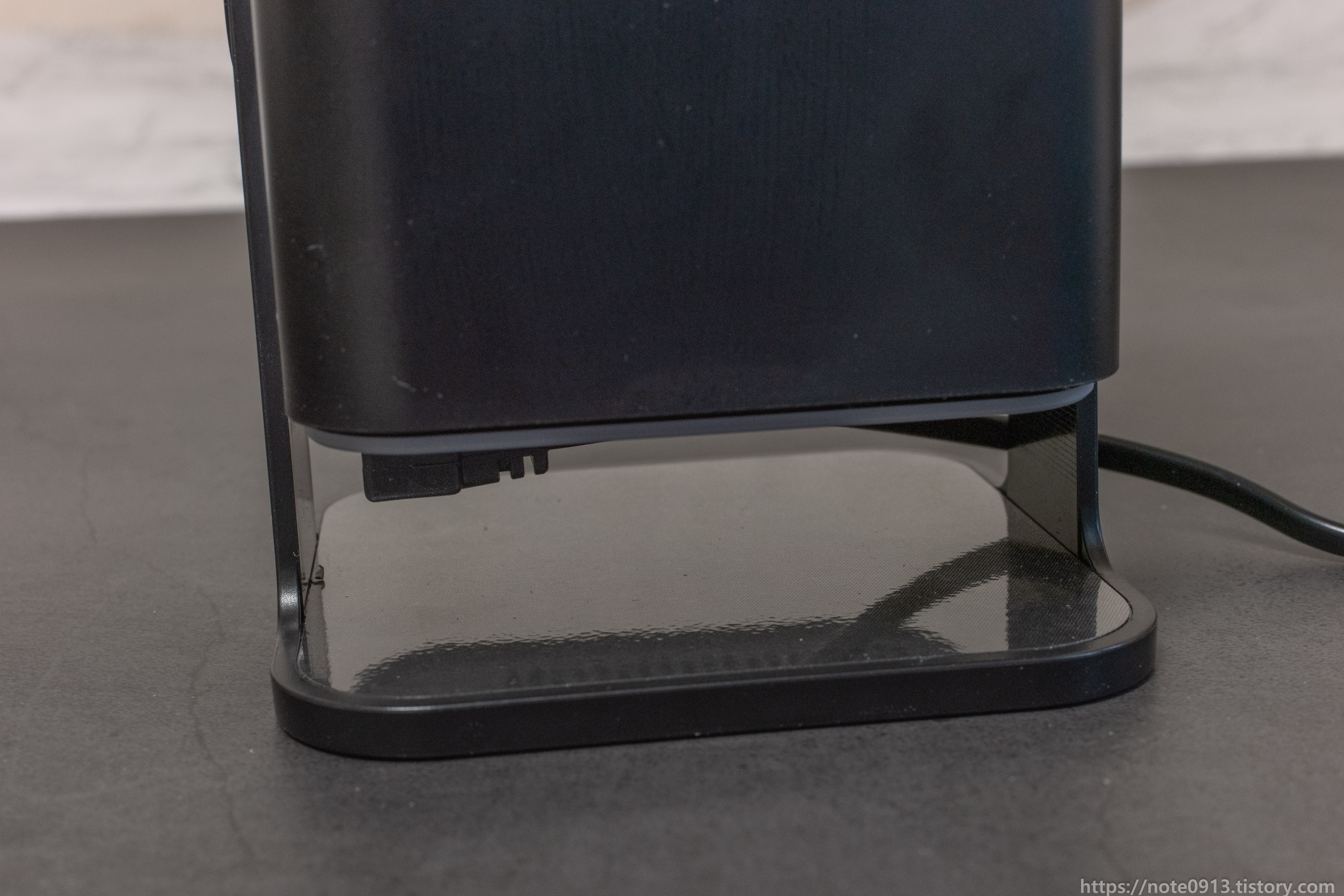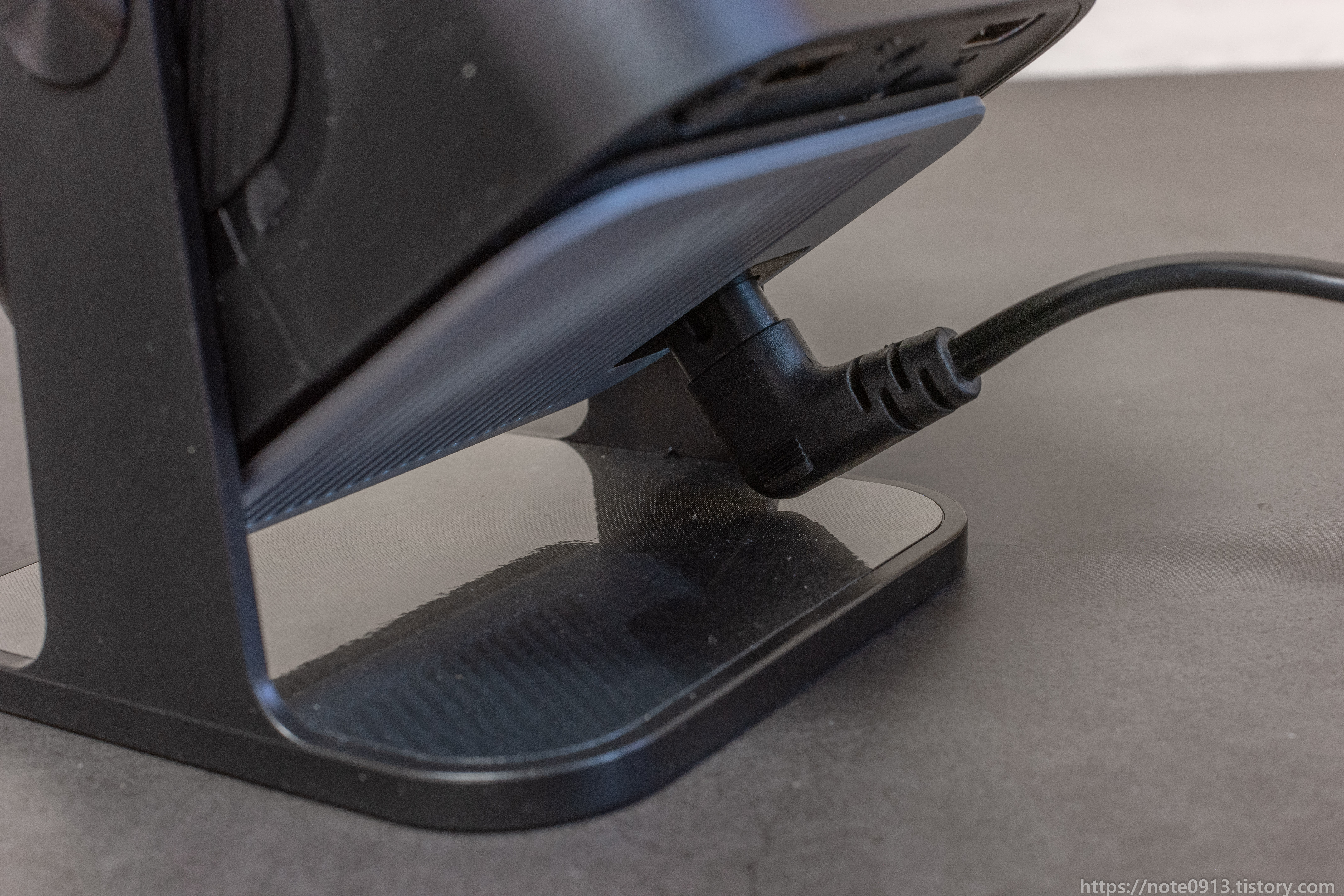 그래서 가지고 있는 90도로 꺾인 전원 코드를 연결해 보았는데 연결은 되나 수직으로 세울려고 하니 높이가 아슬아슬하게 높아서 전원 코드 바닥이 걸려서 수직으로 세울 수가 없습니다.