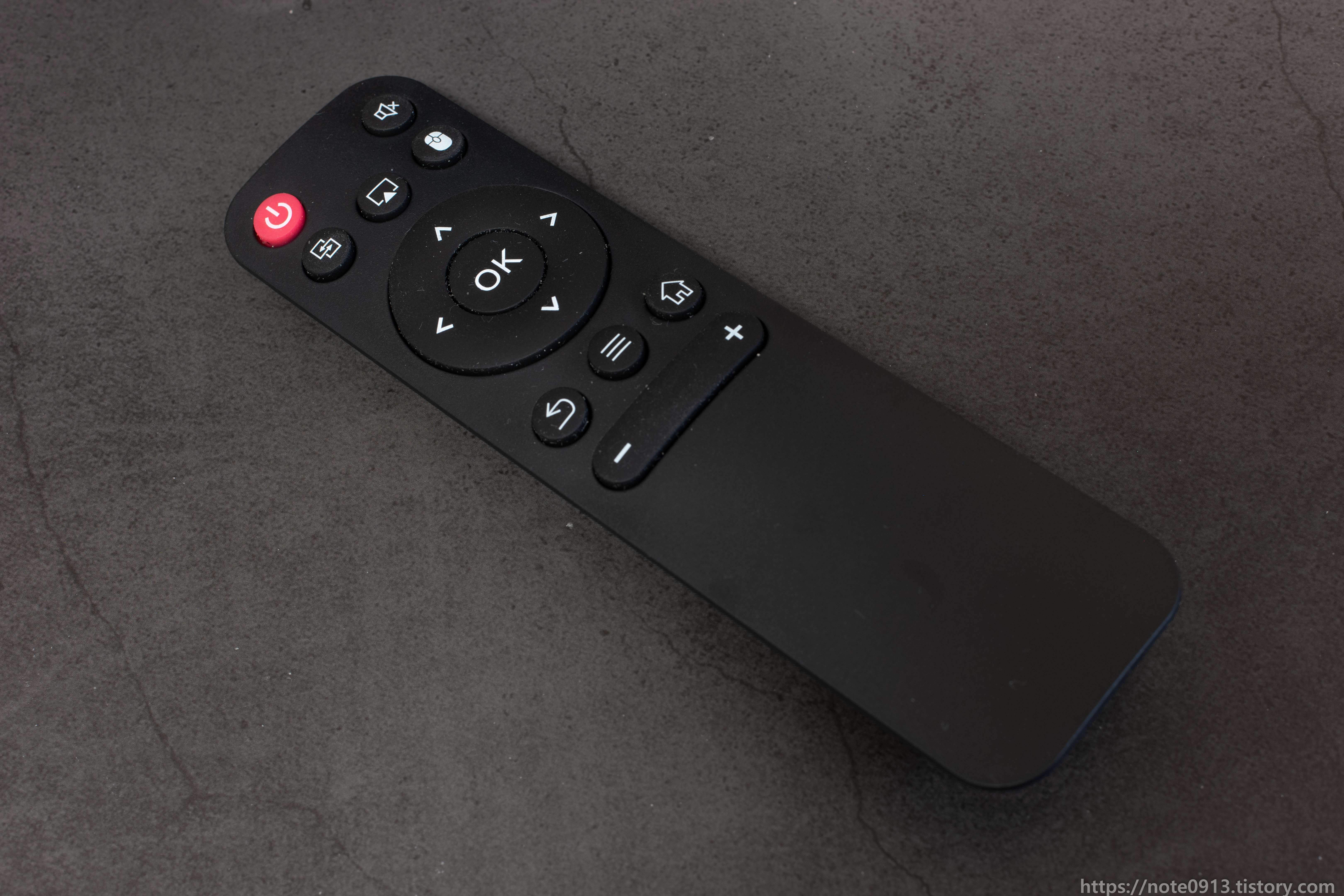리모컨 각 버튼에 대해 설명하자면 맨 위쪽부터 전원, 음소거, 미라캐스트, 에어플레이, 마우스 모드, 상하좌우 및 확인, 뒤로가기, 설정 메뉴, 홈 버튼, 볼륨 다운, 볼륨 업 버튼으로 구성되어 있습니다.